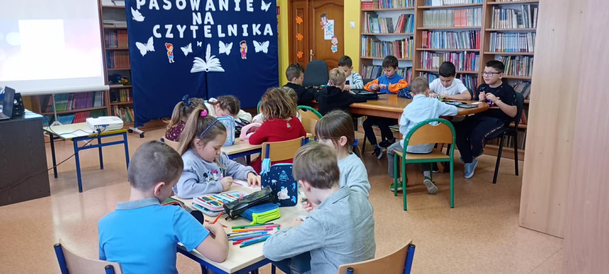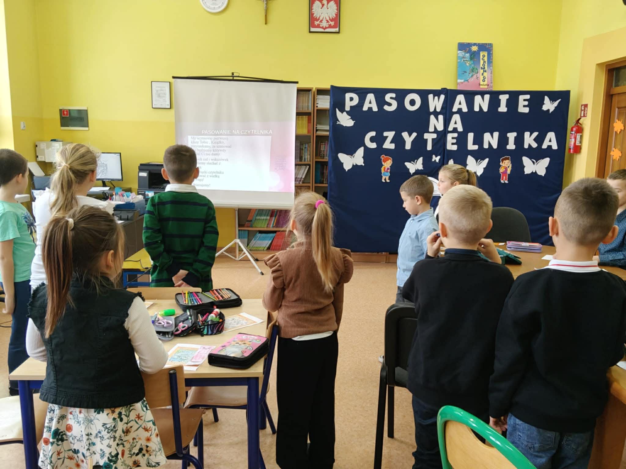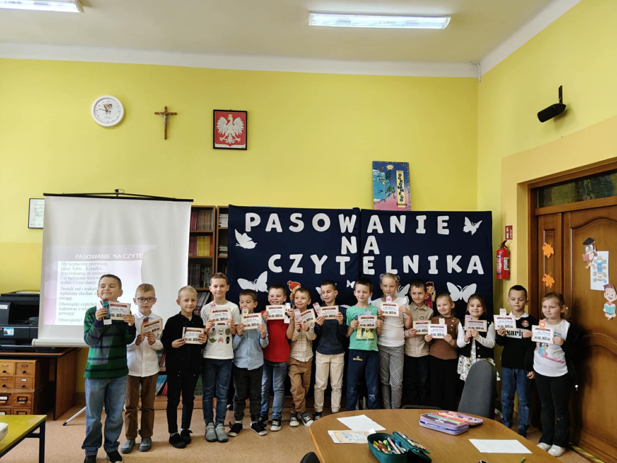 25 listopada w bibliotece szkolnej odbyło się uroczyste pasowanie uczniów klasy 1a i 1b na czytelników. Pod opieką pana Piotra Rzepy dzieci wykonały własne zakładki, rozwiązywały zadania o alfabecie i bohaterach bajek oraz przypomniały sobie zasady korzystania z biblioteki. Najważniejszym momentem było wspólne złożenie ślubowania. Na zakończenie uczniowie otrzymali dyplomy i zrobili pamiątkowe zdjęcie.