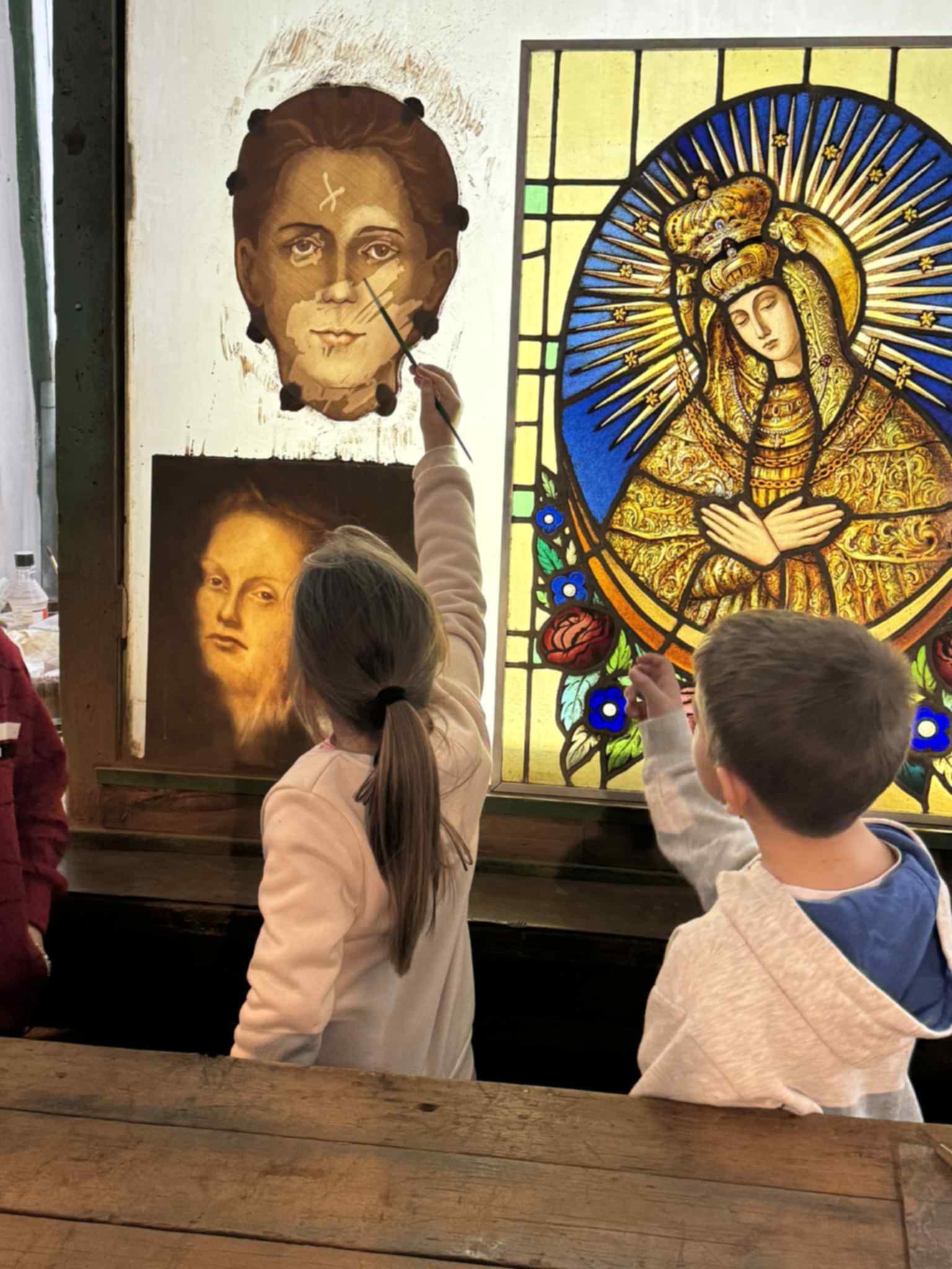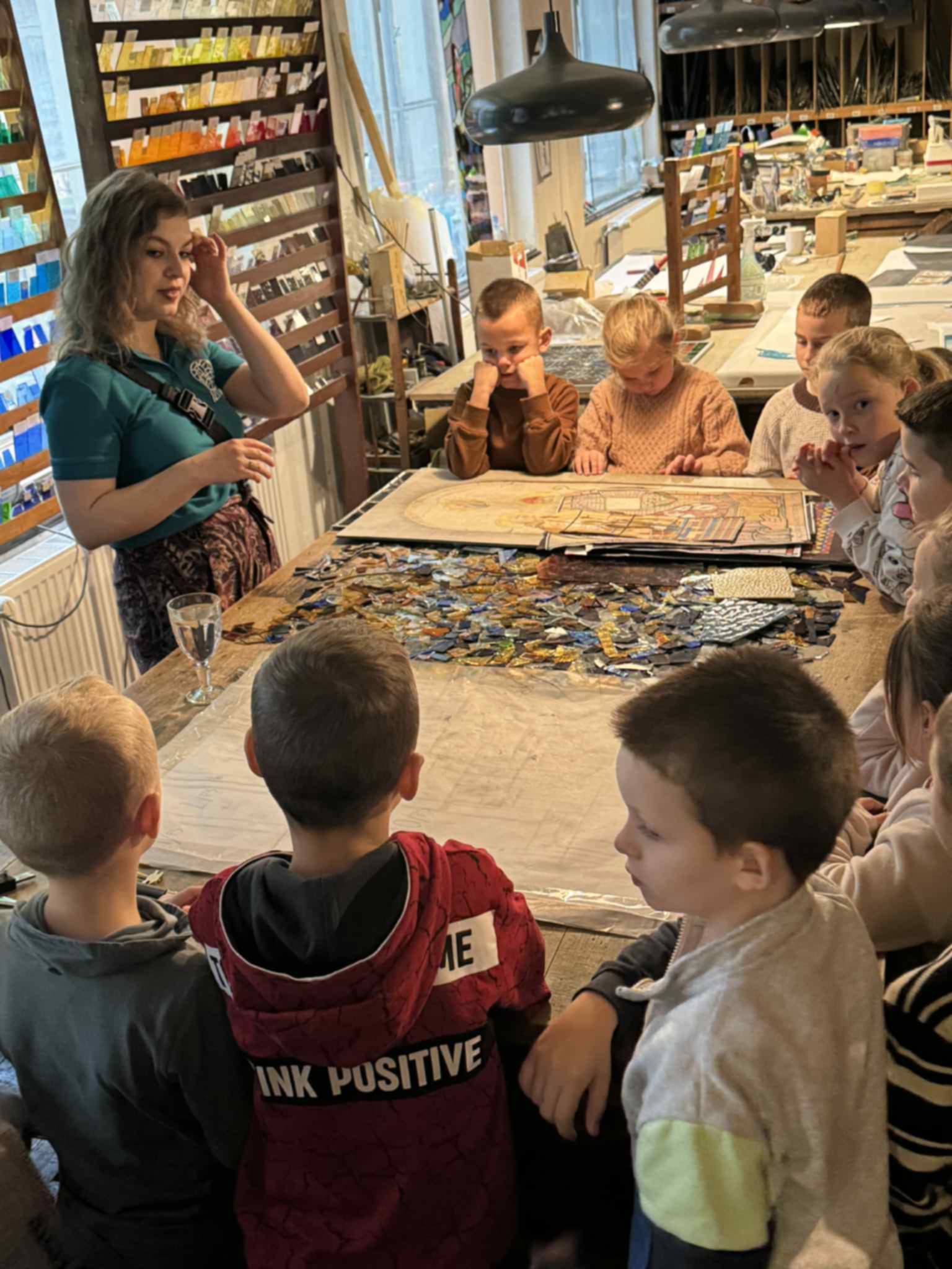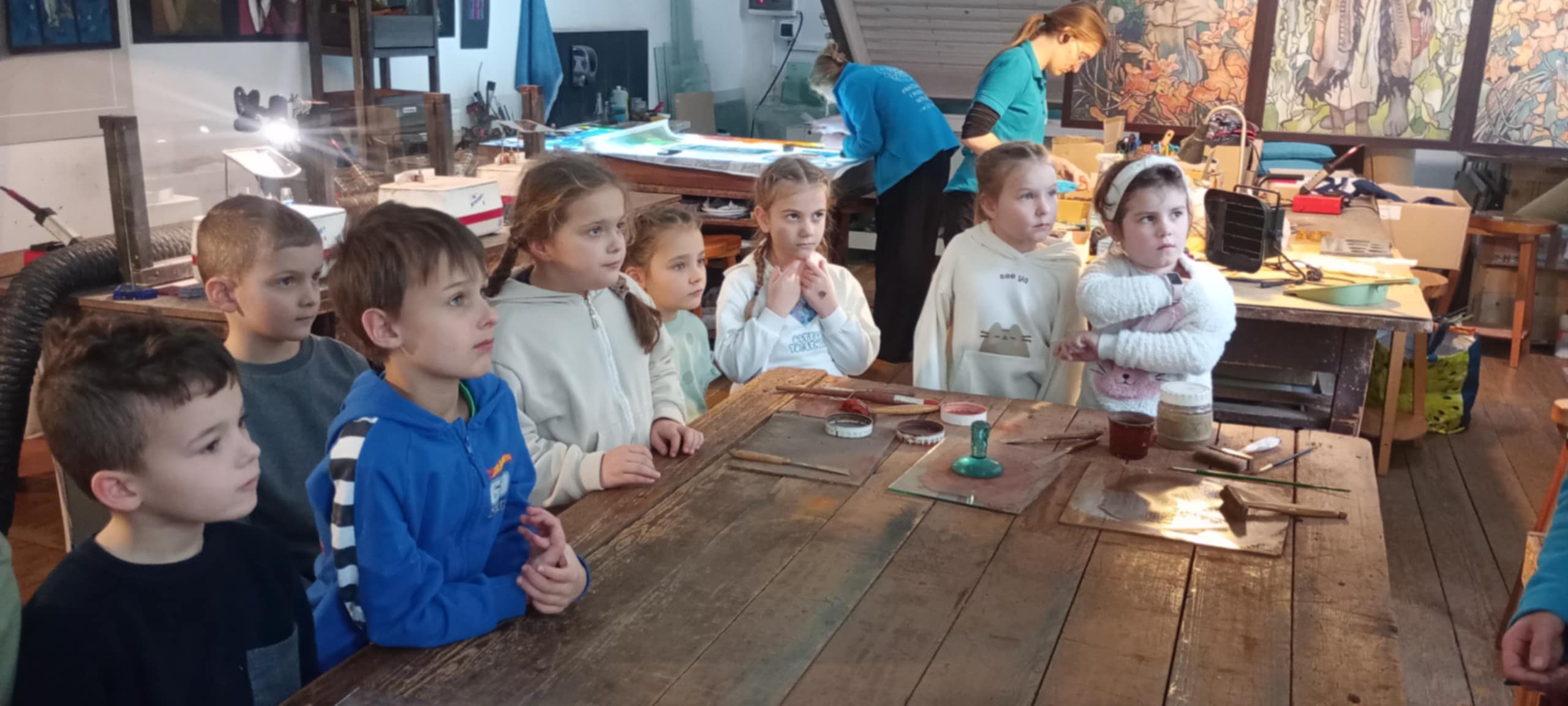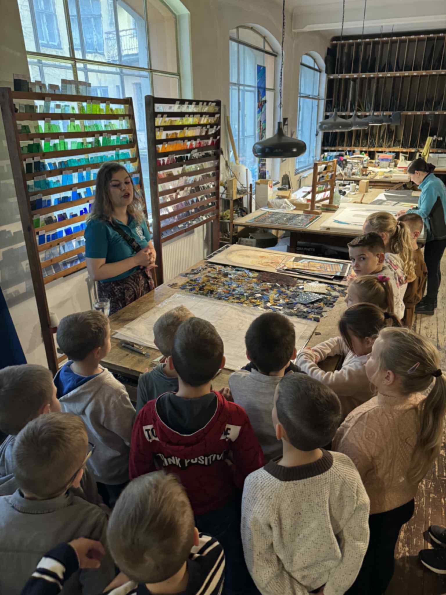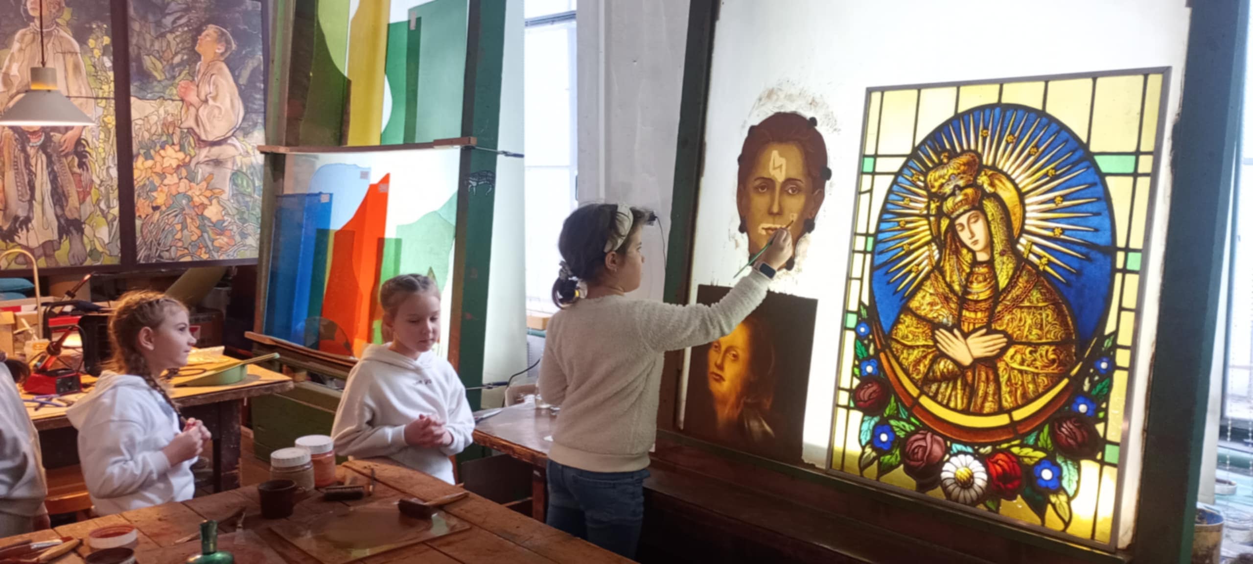Uczniowie obserwowali artystów podczas pracy, poznawali kolejne etapy powstawania witraży oraz narzędzia wykorzystywane przez mistrzów tego rzemiosła. Podziwiali także niezwykłe projekty wybitnych twórców – Stefana Matejki oraz Stanisława Wyspiańskiego – które zrobiły na wszystkich ogromne wrażenie.