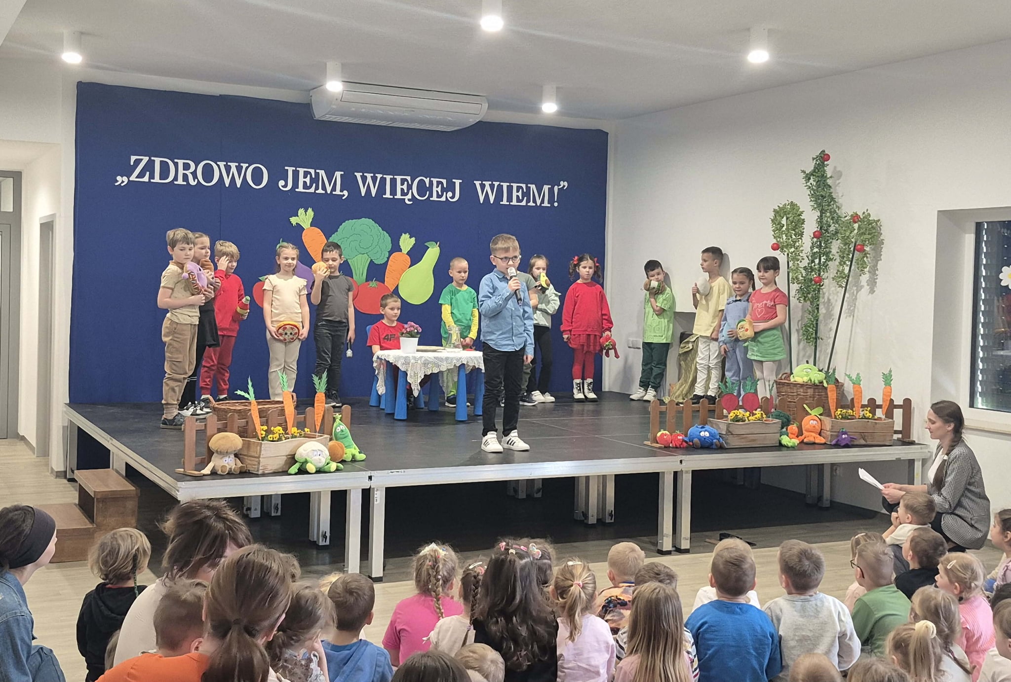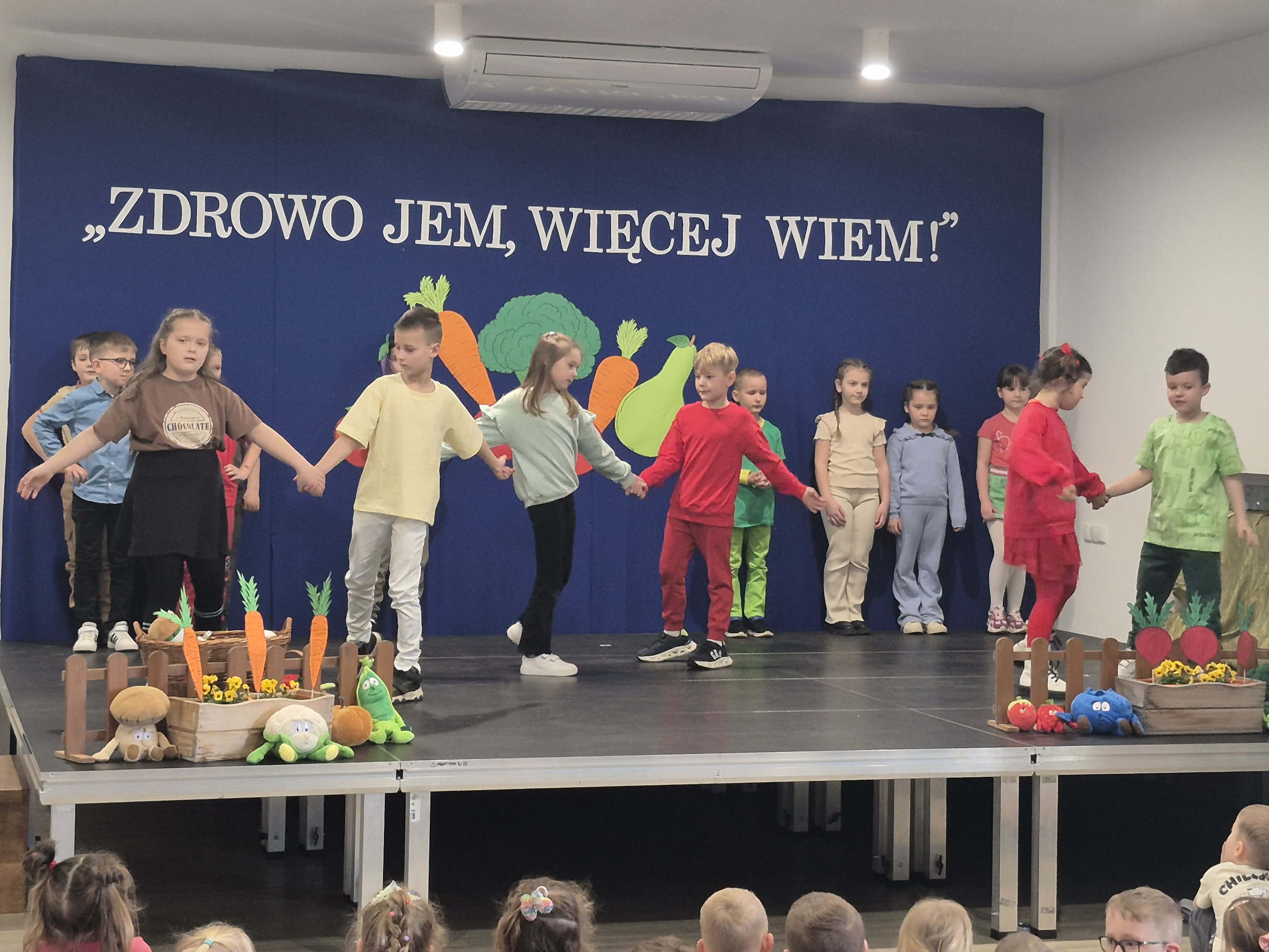 Na zakończenie uczniowie przypomnieli młodszym kolegom i koleżankom, że zdrowy styl życia to nie tylko właściwe odżywianie, ale także ruch i aktywność fizyczna, dlatego finałem występu był energetyczny taniec – cza-cza, który wzbudził wiele radości wśród widzów.
