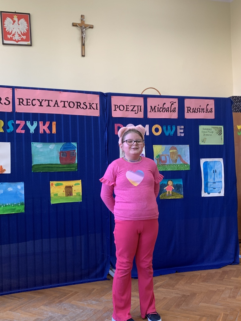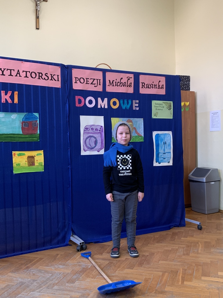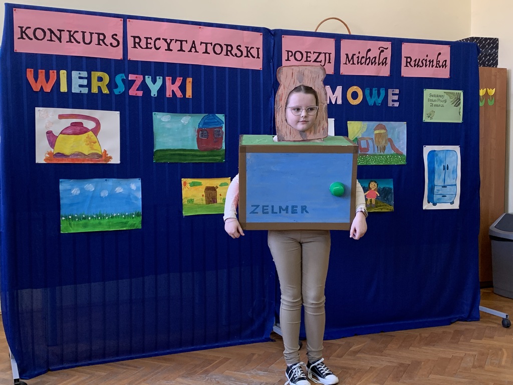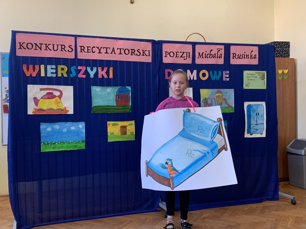 21 marca 2025r. obchodziliśmy Światowy Dzień Poezji, z tej okazji w naszej szkole odbył się Konkurs Recytatorski Poezji Michała Rusinka. Wzięły w nim udział dzieci z klas I-III. Recytowały wiersze z serii "Wierszyki domowe". Były więc wiersze o misiu, łopacie do śniegu, pralce, tosterze czy progu. Komisja konkursowa, pod przewodnictwem pani dyrektor Lukrecji Chochlińskiej, po przeliczeniu punktów przyznała: