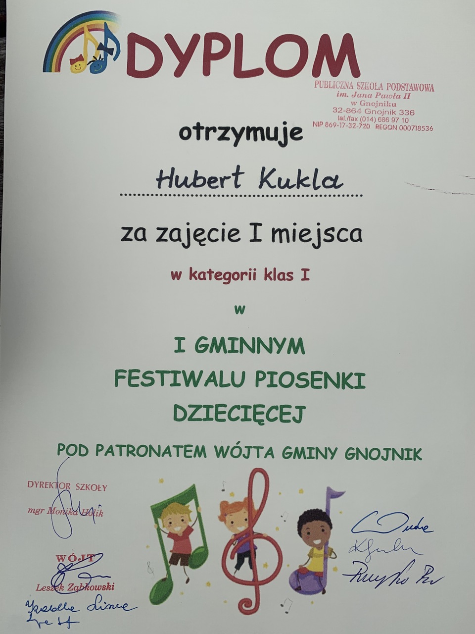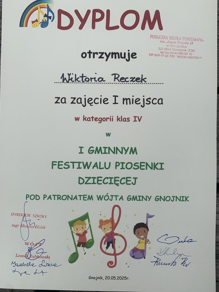 20 maja 2025 r. czworo naszych uczniów z klas I−IV wzięło udział w konkursie wokalnym organizowanym w Publicznej Szkole Podstawowej w Gnojniku. W kategorii klas pierwszych zwyciężył Hubert Kukla z klasy I a, natomiast w kategorii klas czwartych pierwsze miejsce zajęła Wiktoria Reczek z klasy IV a.