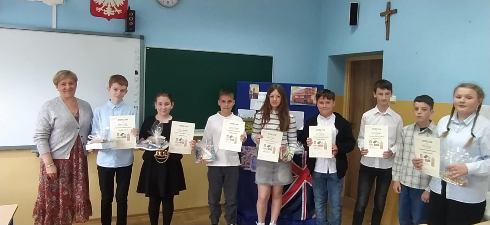 23 maja 2025 r. odbył się w naszej szkole gminny konkurs sprawdzający wiedzę uczniów na temat Wielkiej Brytanii w bardzo szerokim zakresie. Zadania dotyczyły takich zagadnień, jak: geografia kraju, ustrój polityczny, sławni ludzie czy edukacja. W konkursie wzięło udział po dwoje uczniów klas VI lub VII z Biesiadek, Lewniowej, Gosprzydowej oraz Uszwi. Każdy nauczyciel języka angielskiego z danej szkoły przygotował jedną część konkursu, opracowując pytania dotyczące wyznaczonego zakresu tematycznego. Naszą szkołę reprezentowali uczniowie klasy VI b: Martyna Grzegórzek, która zajęła drugie miejsce oraz Karol Pawełczyk, któremu zabrakło zaledwie jednego punktu do zdobycia trzeciej lokaty. Zarówno zwycięzcy, jak i uczestnicy otrzymali nagrody rzeczowe oraz pamiątkowe dyplomy. Wszystkim serdecznie gratulujemy.