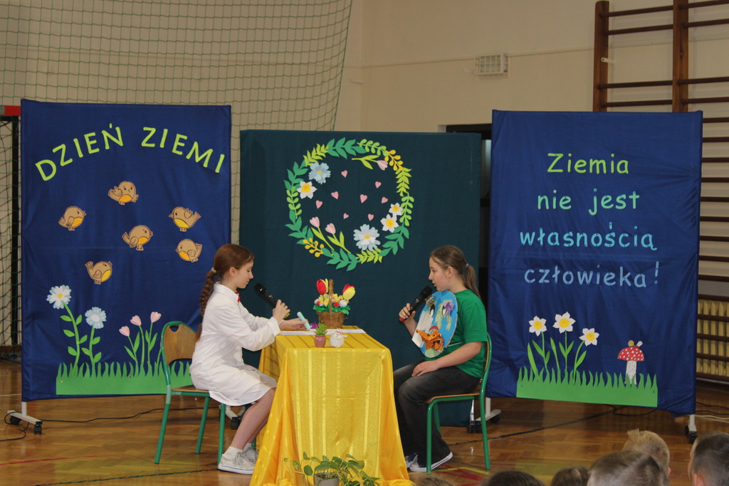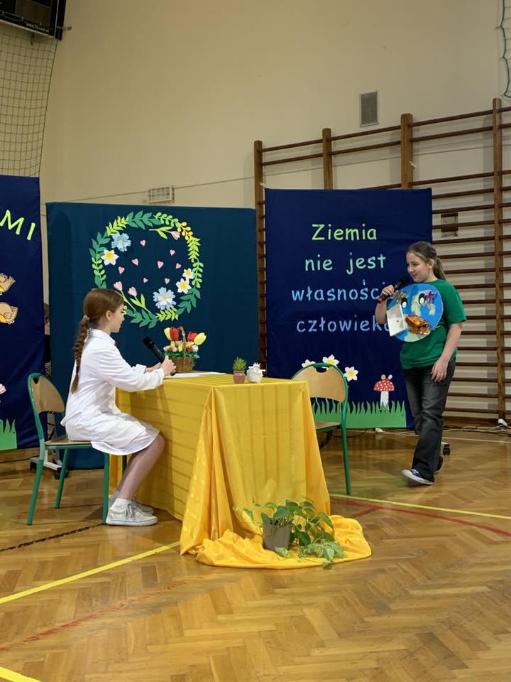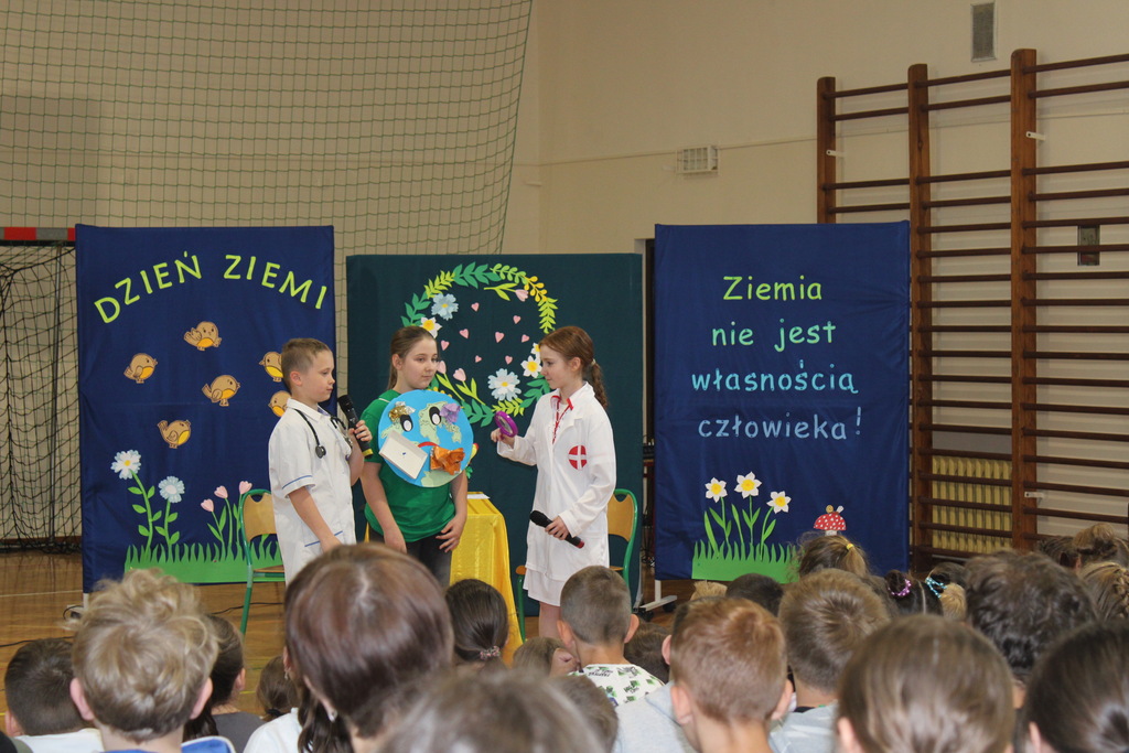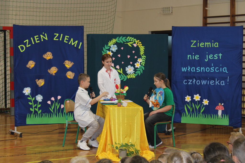 25 kwietnia 2025 r. odbył się apel z okazji święta naszej planety, mający na celu przypomnieć społeczności szkolnej, jak ważna jest troska o środowisko naturalne. Uczniowie klas IV a i VI b zaprezentowali scenkę rodzajową, podczas której chora Ziemia szuka pomocy w gabinecie lekarskim. Na szczęście jej mieszkańcy w porę dostrzegają zagrożenie i przychodzą na ratunek błękitnej planecie. Dbanie o dobro Ziemi to obowiązek każdego człowieka. Pamiętajmy o dobrych praktykach w zakresie ekologii przez cały rok.