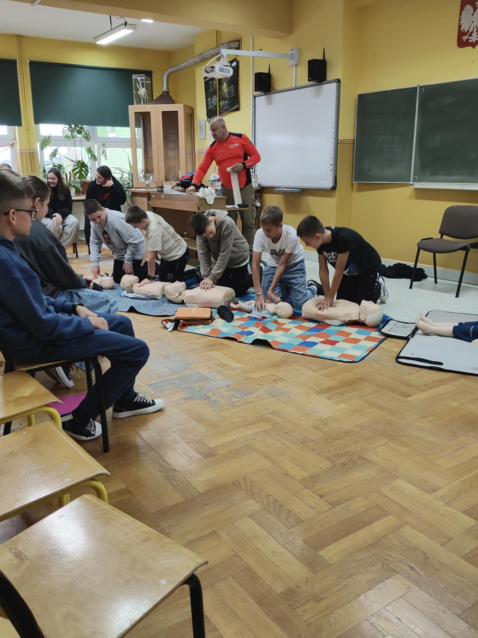 W ramach działań edukacyjnych i profilaktycznych Stowarzyszenie „Na Śliwkowym Szlaku” zorganizowało dla uczniów klas siódmych naszej szkoły warsztaty z zakresu pierwszej pomocy przedmedycznej oraz postępowania w sytuacjach zagrożenia pożarowego. Zajęcia przeprowadził wykwalifikowany ratownik medyczny, który w przystępny i angażujący sposób przekazał uczniom wiedzę mogącą uratować życie.