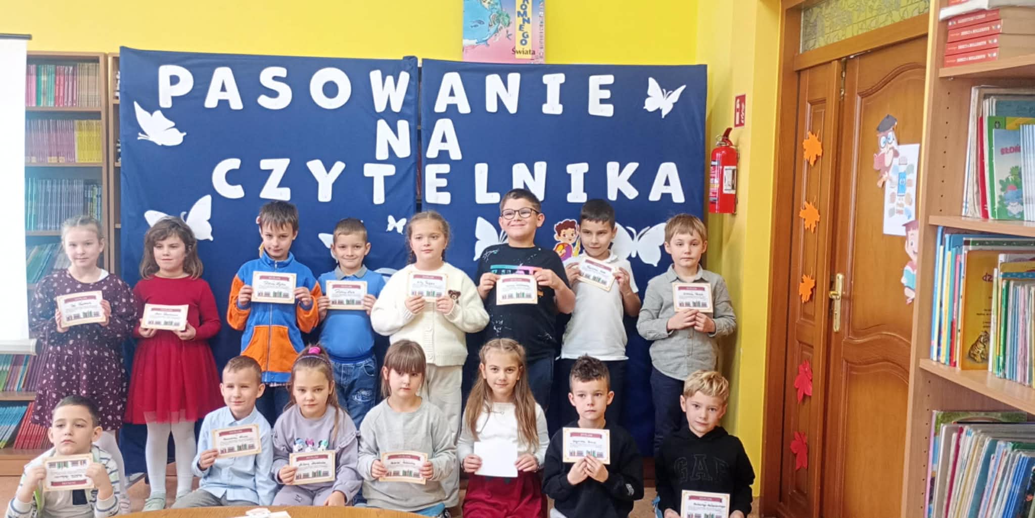 25 listopada w bibliotece szkolnej odbyło się uroczyste pasowanie uczniów klasy 1a i 1b na czytelników. Pod opieką pana Piotra Rzepy dzieci wykonały własne zakładki, rozwiązywały zadania o alfabecie i bohaterach bajek oraz przypomniały sobie zasady korzystania z biblioteki. Najważniejszym momentem było wspólne złożenie ślubowania. Na zakończenie uczniowie otrzymali dyplomy i zrobili pamiątkowe zdjęcie.