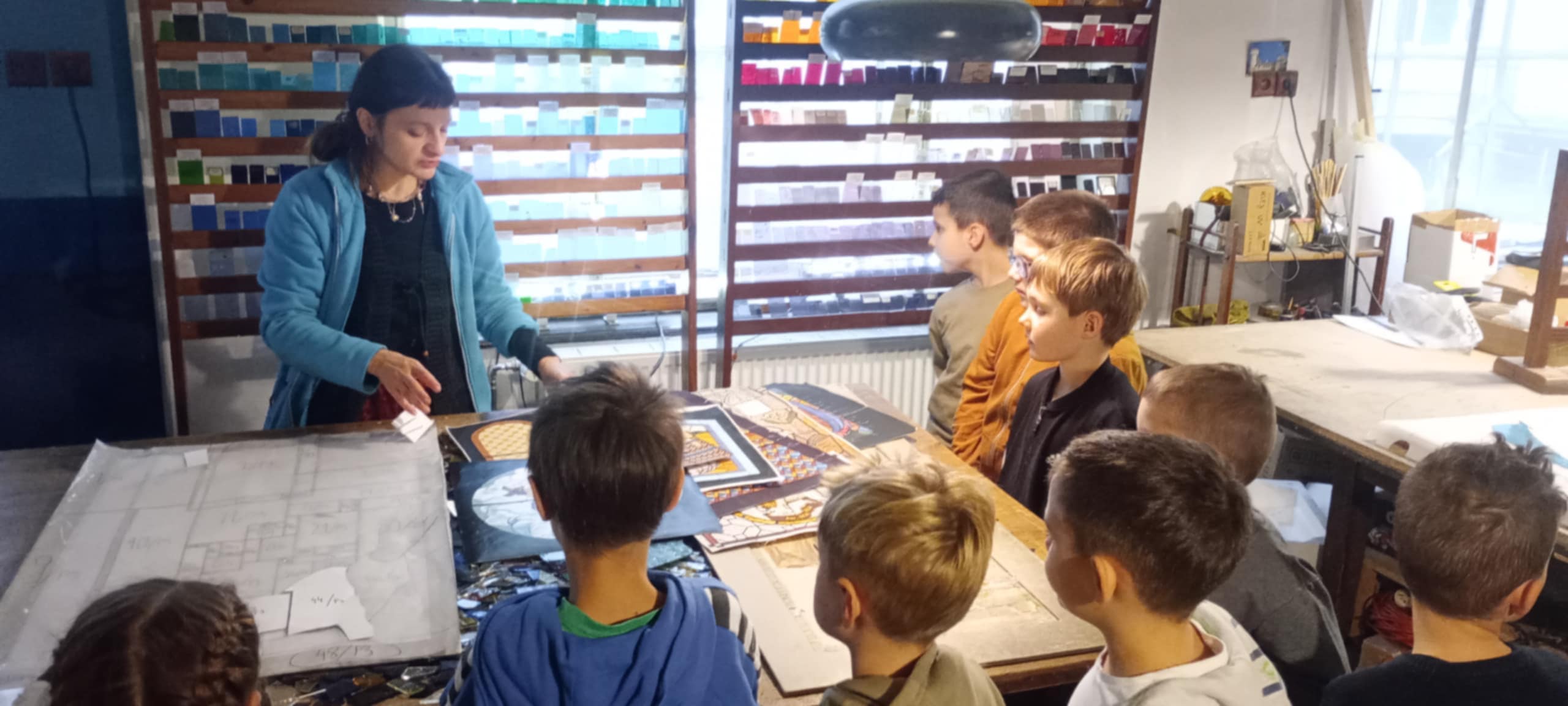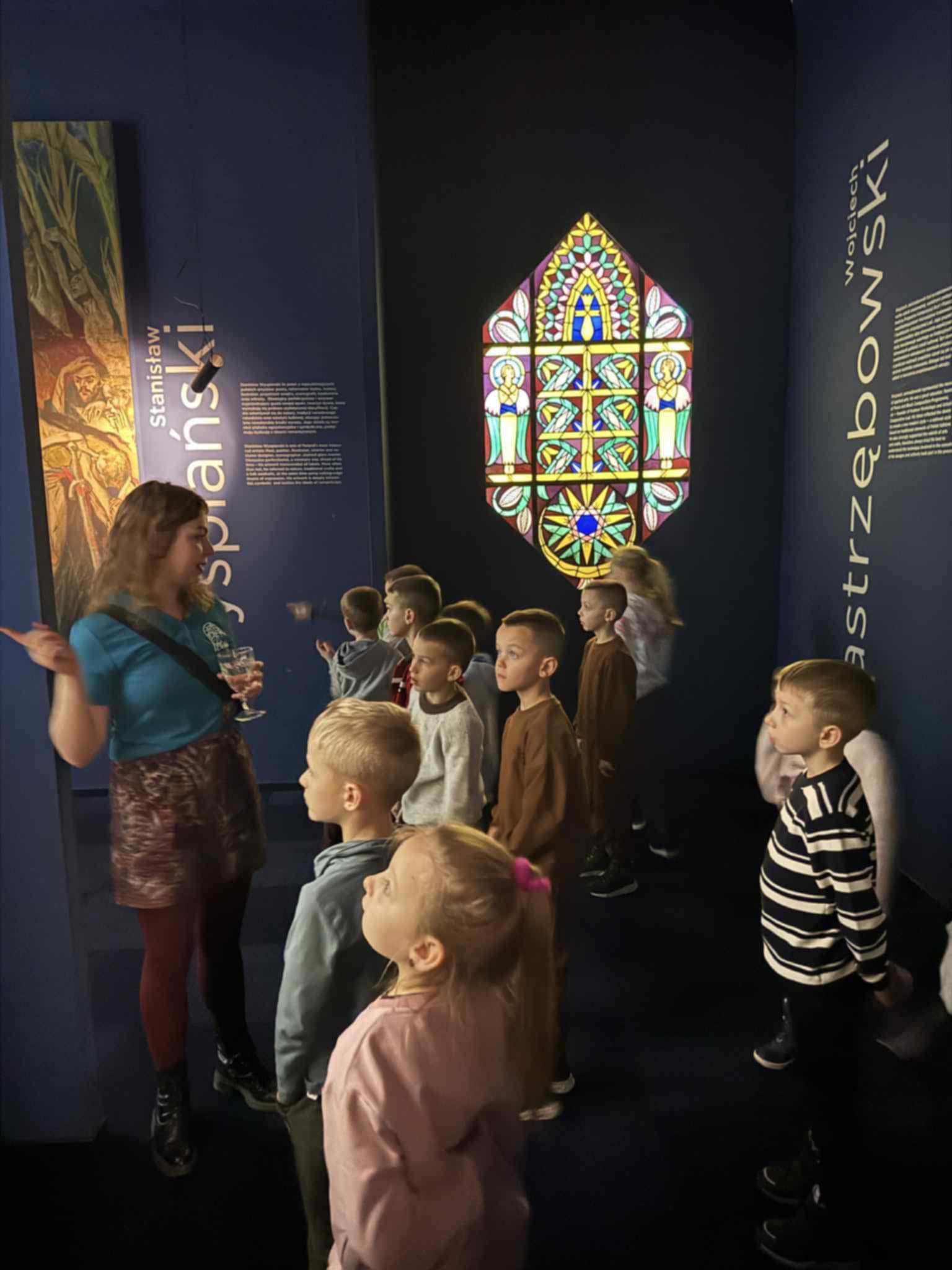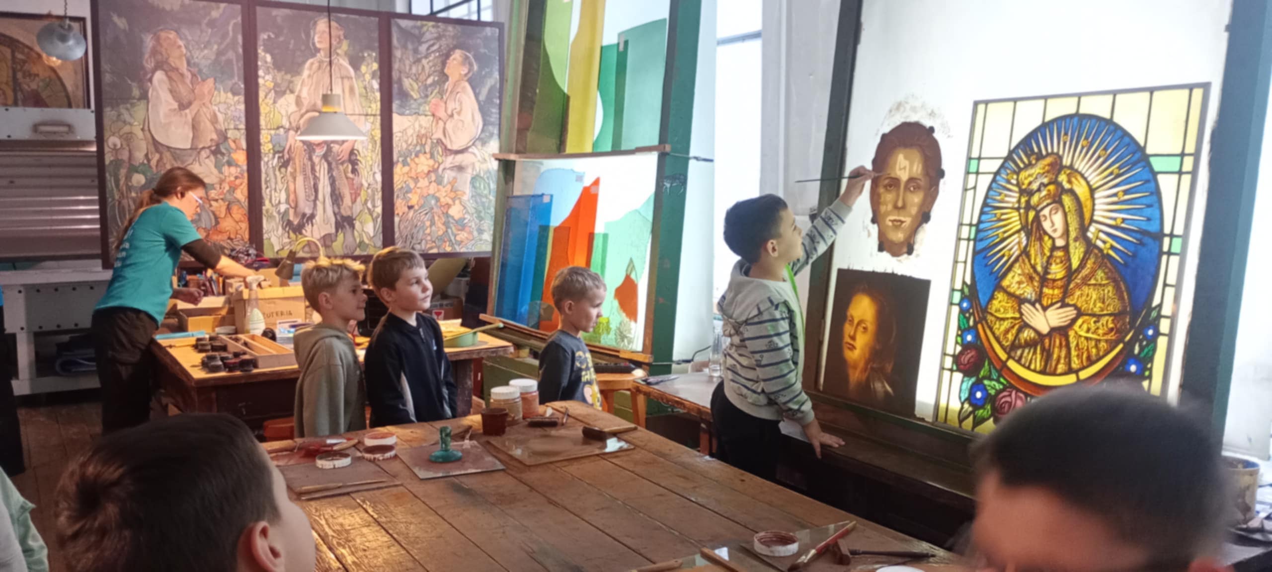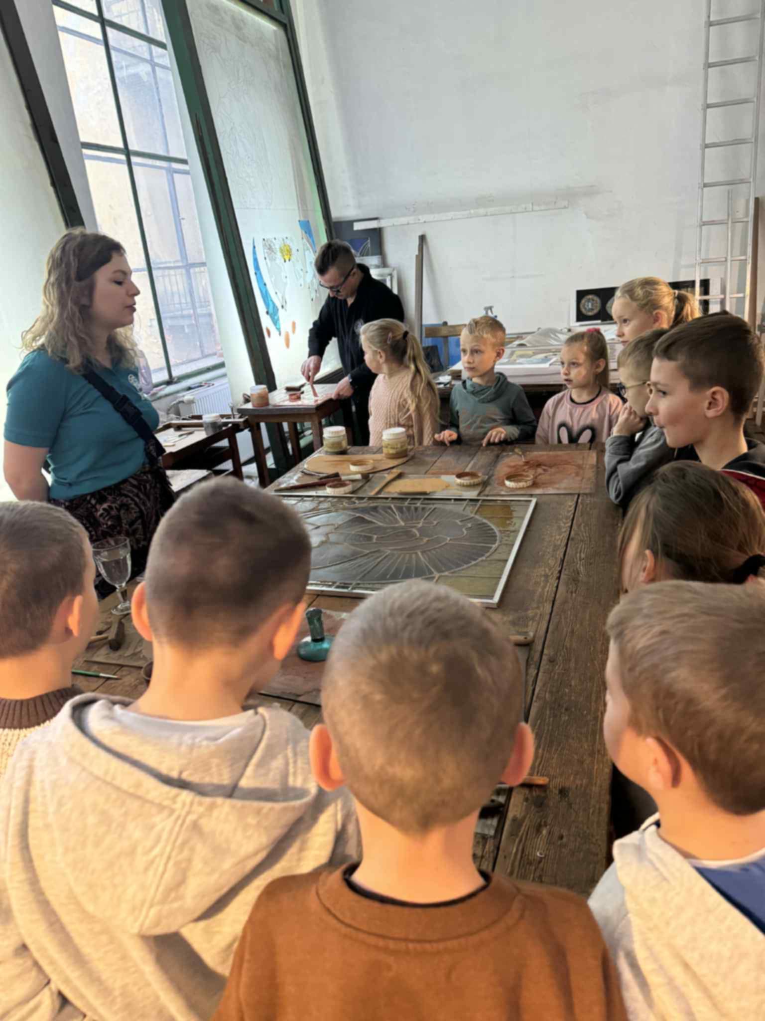Uczniowie obserwowali artystów podczas pracy, poznawali kolejne etapy powstawania witraży oraz narzędzia wykorzystywane przez mistrzów tego rzemiosła. Podziwiali także niezwykłe projekty wybitnych twórców – Stefana Matejki oraz Stanisława Wyspiańskiego – które zrobiły na wszystkich ogromne wrażenie.