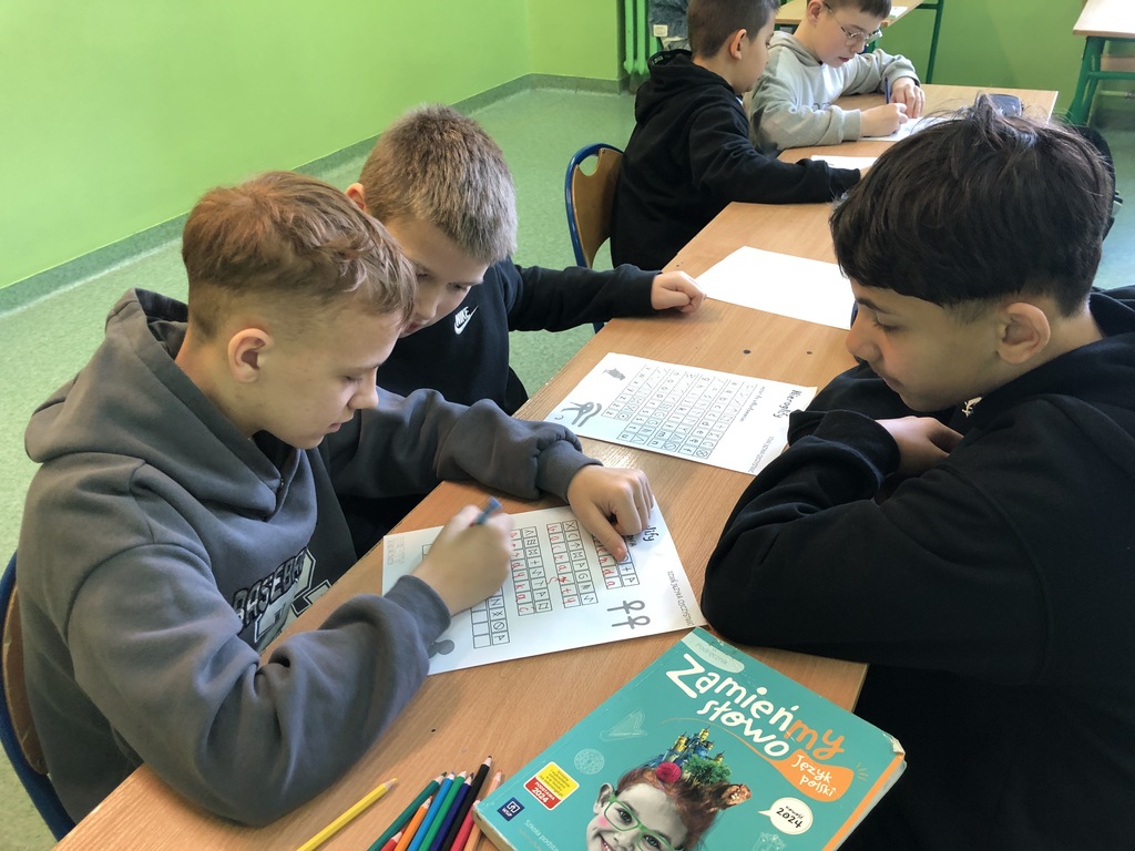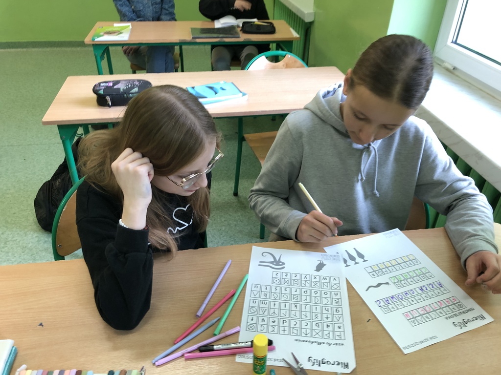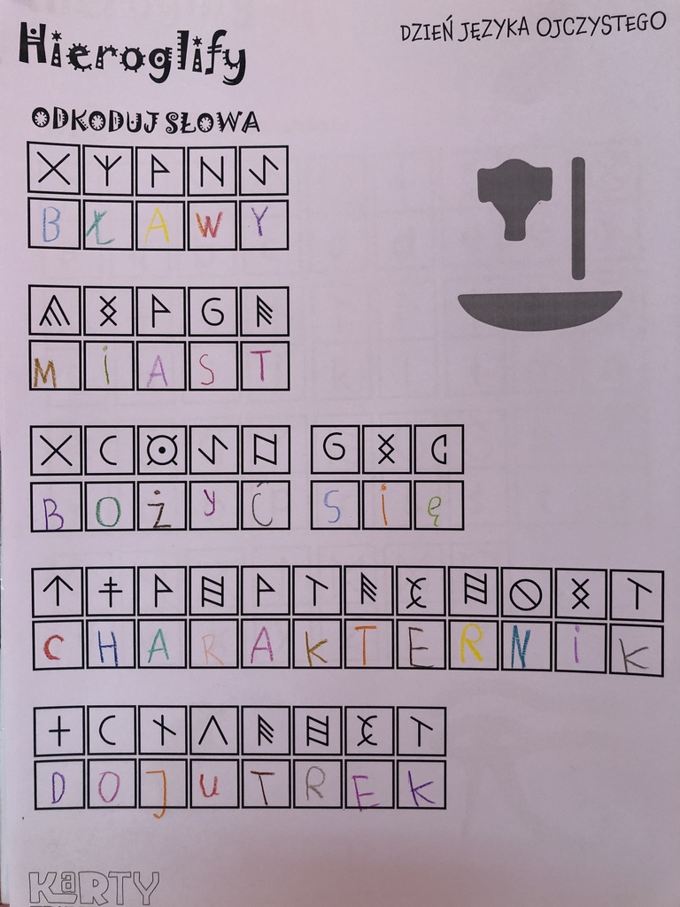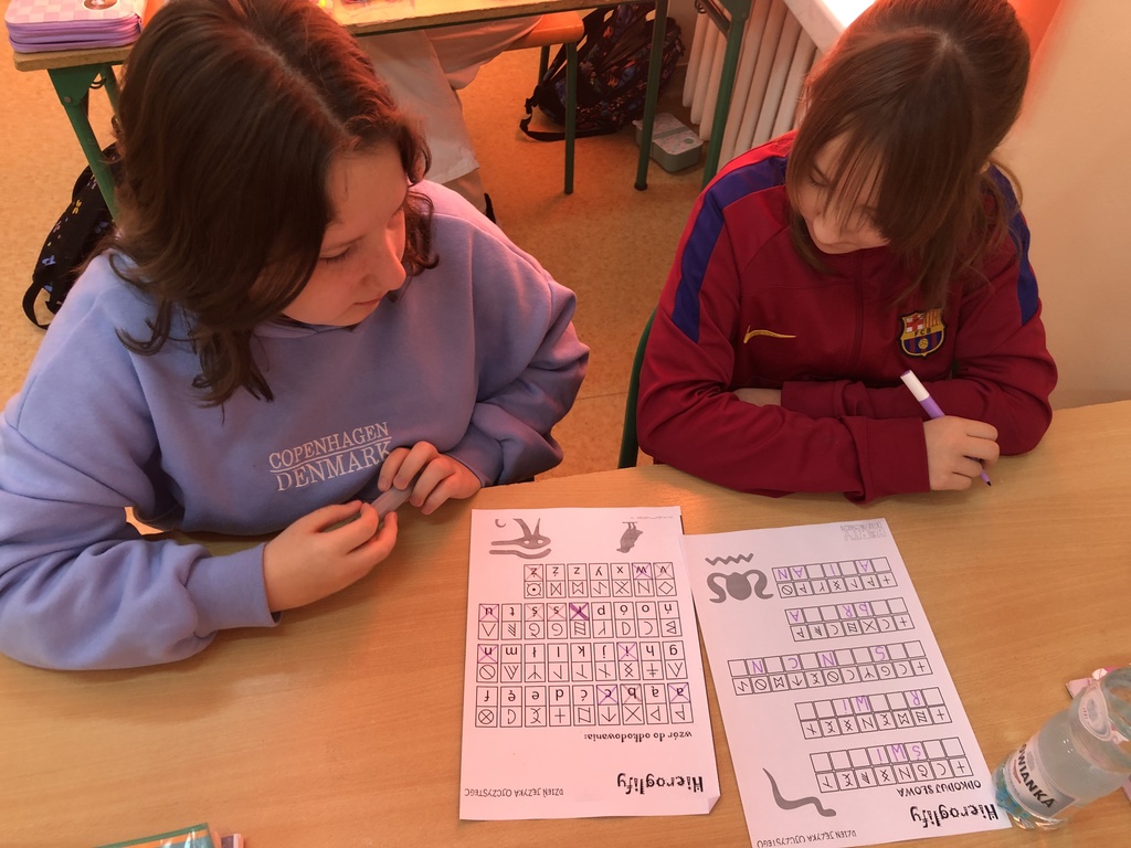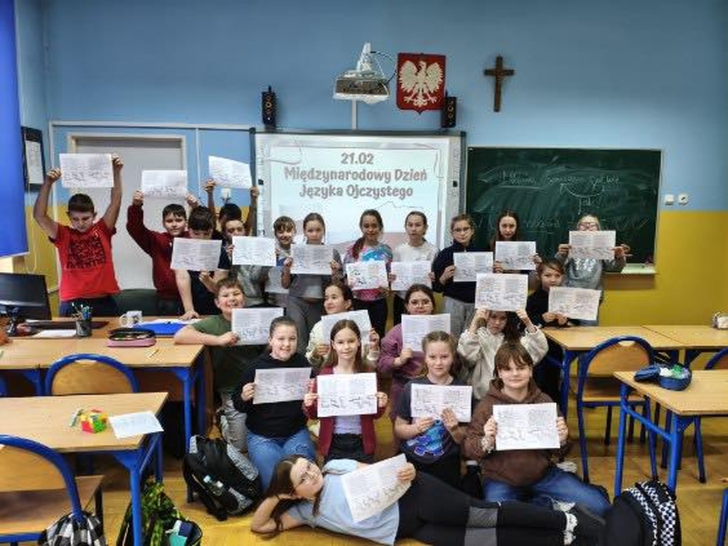 Uczniowie naszej szkoły w ostatni tydzień lutego brali udział w różnego rodzaju działaniach zwiększających świadomość na temat tego, jak ważna jest troska o prawidłowe posługiwanie się polszczyzną. Po zapoznaniu się z prezentacją ukazującą historię języka polskiego, jego bogactwo i piękno, a także ciekawostki z nim związane, poszczególne klasy przystąpiły do działań praktycznych. Młodsi uczniowie utrwalali znajomość alfabetu, odgadywali polskie powiedzenia i przysłowia. Starsi zmagali się m.in. z rozszyfrowaniem hieroglifów. Dzięki nim mogli poznać zaskakujące archaizmy, kiedyś powszechnie używane, a obecnie niewiele mówiące wyrazy, których znaczenia dziś trudno się nawet domyślić. Wspólnymi siłami próbowali także wykonać plakat, by odgadnąć najstarsze zapisane w języku polskim zdanie: „Daj, ać ja pobruszę, a ty poczywaj.” Dodatkowo na drzwiach sal lekcyjnych na uczniów czekała niespodzianka w postaci karteczek do zerwania, zawierających wyrazy z trudnościami ortograficznymi.