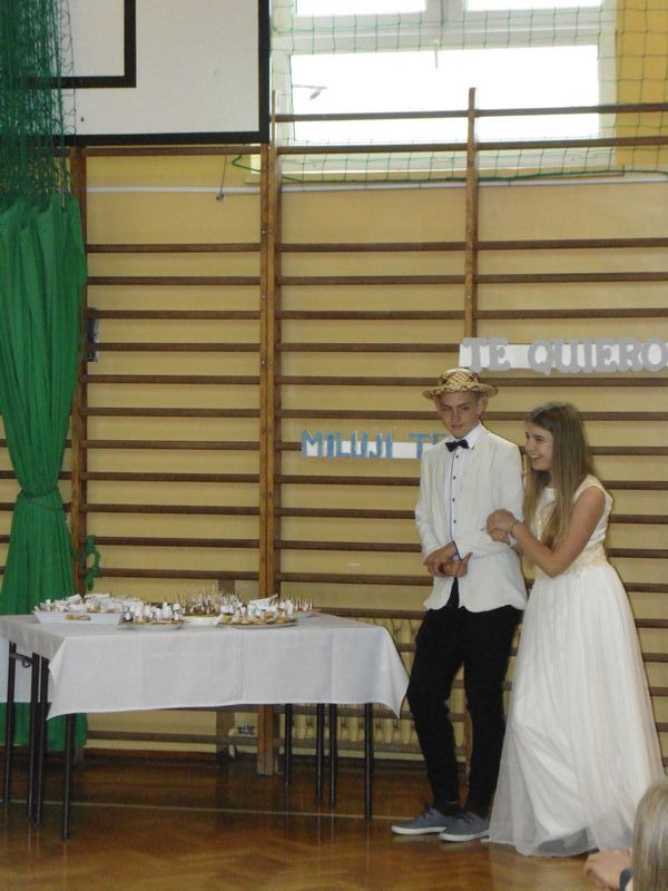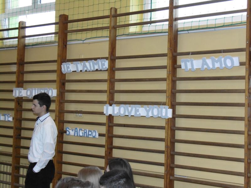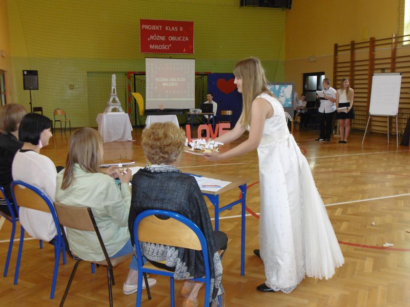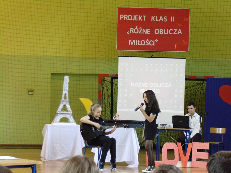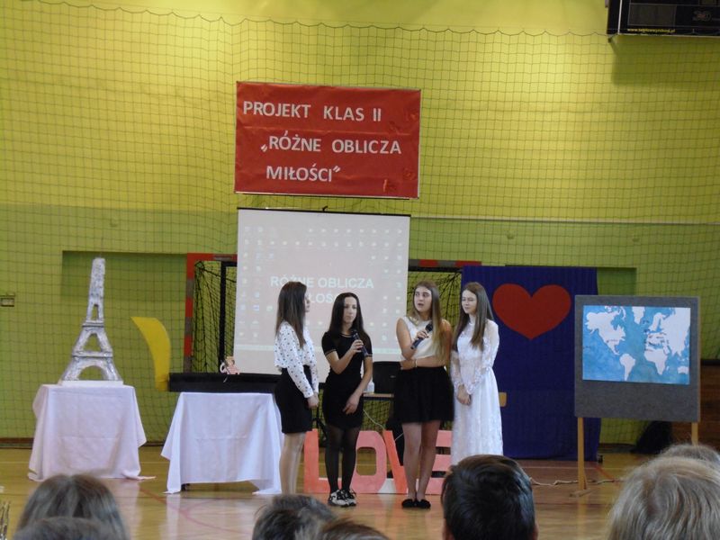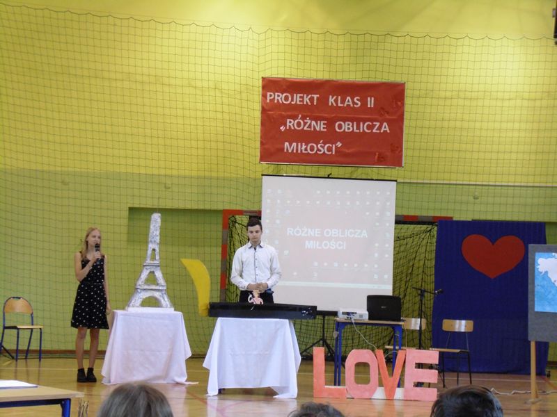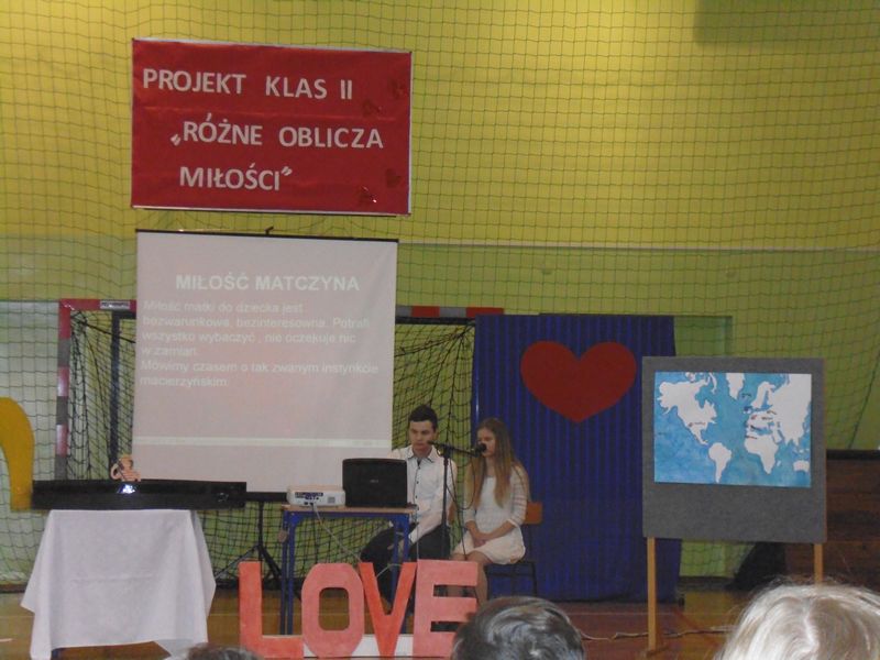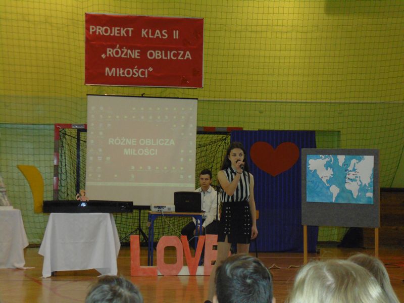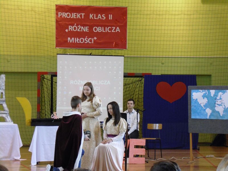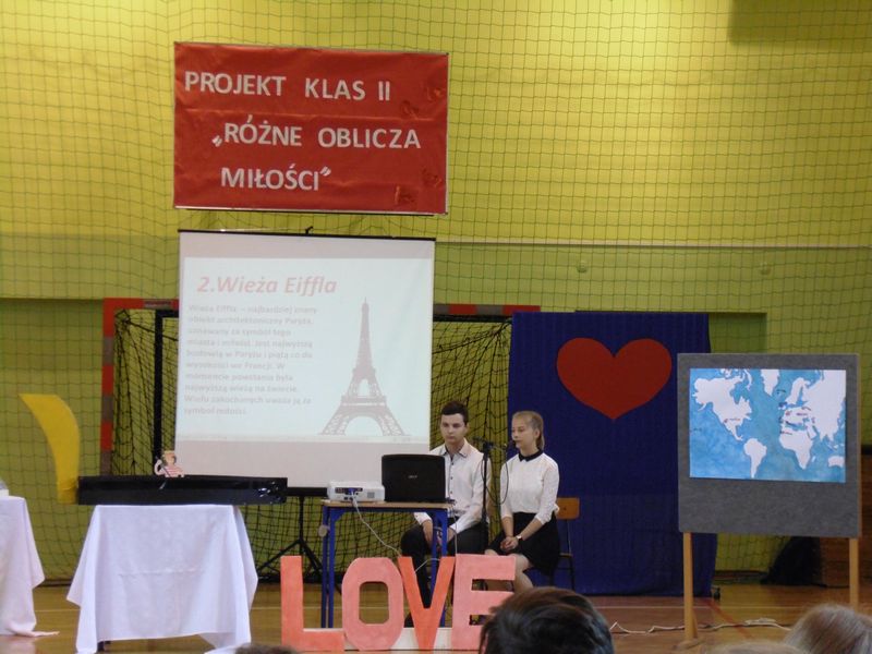 Prezentacja rozpoczęła się sceną z „Nocy i dni” oraz walcem w wykonaniu uczniów klas drugich. Następnie mogliśmy zobaczyć makiety symboli miłości: LOVE, serce, wieża Eiffla oraz wenecka gondola. Obejrzeliśmy prezentacje multimedialne: „Różne rodzaje miłości”, „Symbole miłości”, „Miasta miłości”, a także analizę ankiet przeprowadzonych wśród uczniów naszej szkoły „Czy wierzysz w miłość od pierwszego wejrzenia?”. Wysłuchaliśmy piosenek o miłości: „Kiedy nie ma w nas miłości”, „Zawsze tam, gdzie ty” oraz po niemiecku „Liebe ist alles”. Uczniowie zaprezentowali nam scenki: miłość po szlachecku oraz współcześni zakochani. Mieliśmy okazję zetknąć się z wielką sztuką w postaci sceny balkonowej z „Romea i Julii” przedstawionej po angielsku. Ponadto Obejrzeliśmy również słynne sceny filmowe oraz filmiki „Typy związków na wesoło”. Wysłuchaliśmy recytacji wierszy: „Hymn o miłości” i „Gawęda o miłości ziemi ojczystej”. Okazało się, że nawet matematyka ma związki z miłością, którą można przedstawić w formie równań. Uczennice zachęcały też do lektury książek o miłości. Jako podsumowanie projektu odbyła się degustacja ciasteczek w kształcie serca z cytatami o miłości.