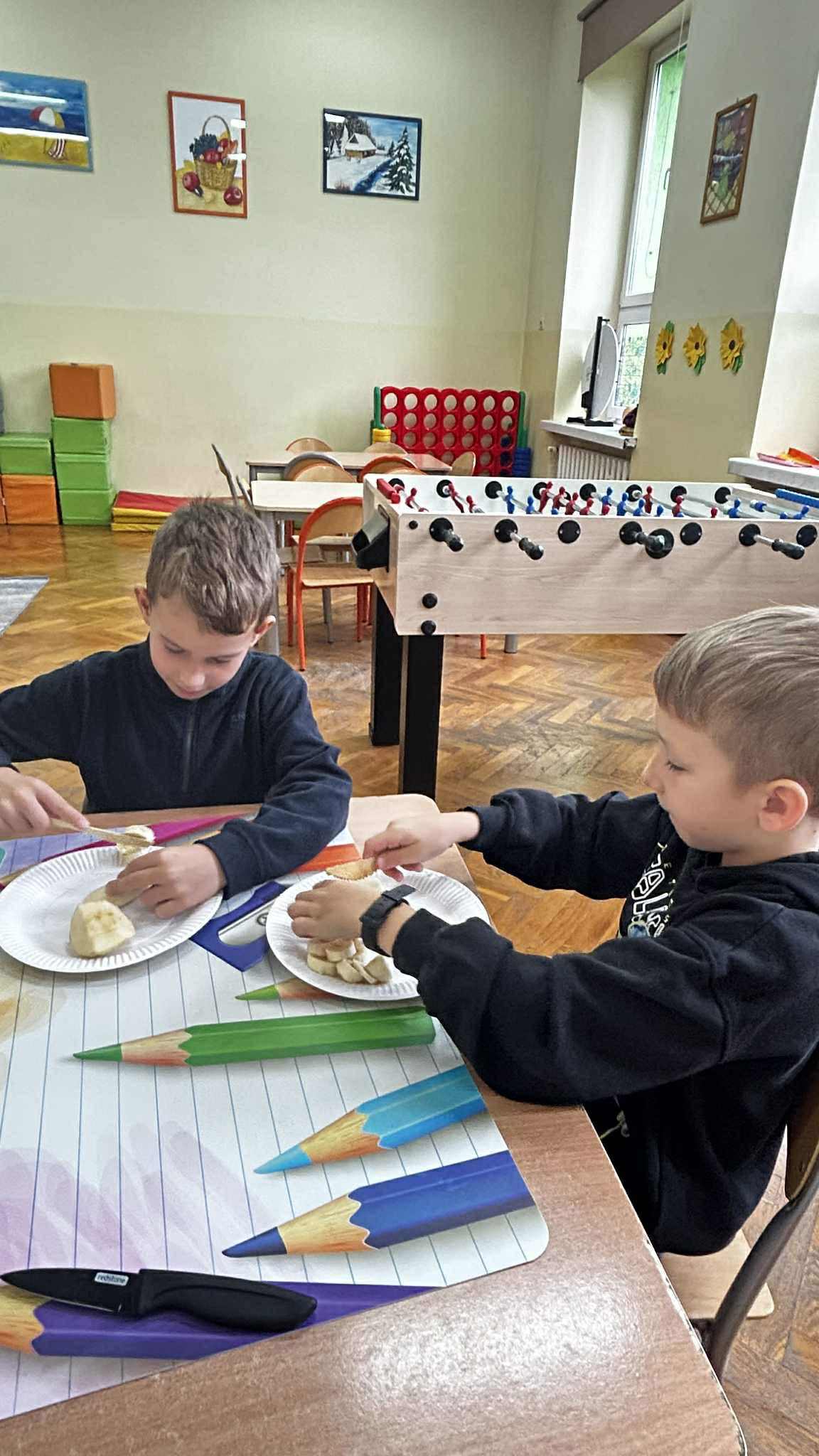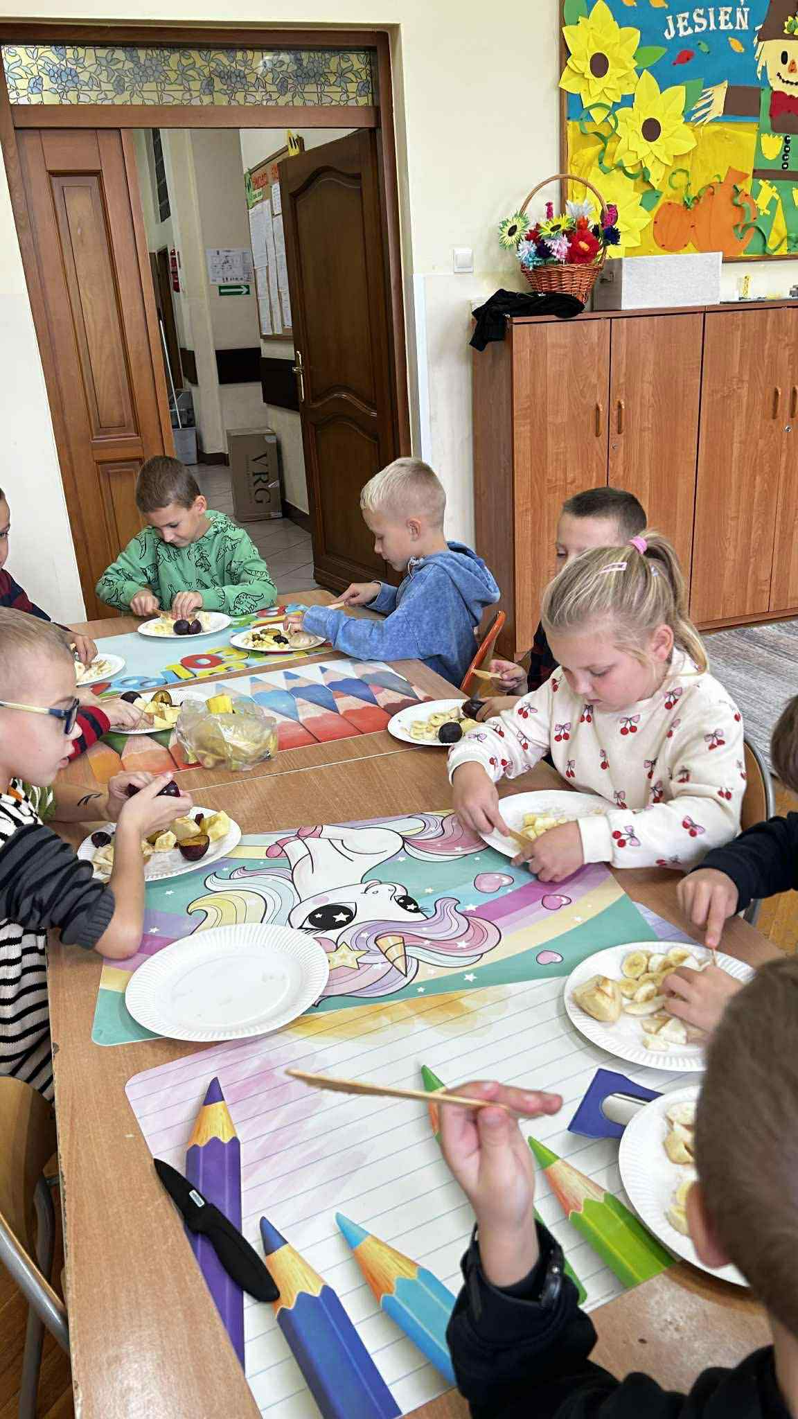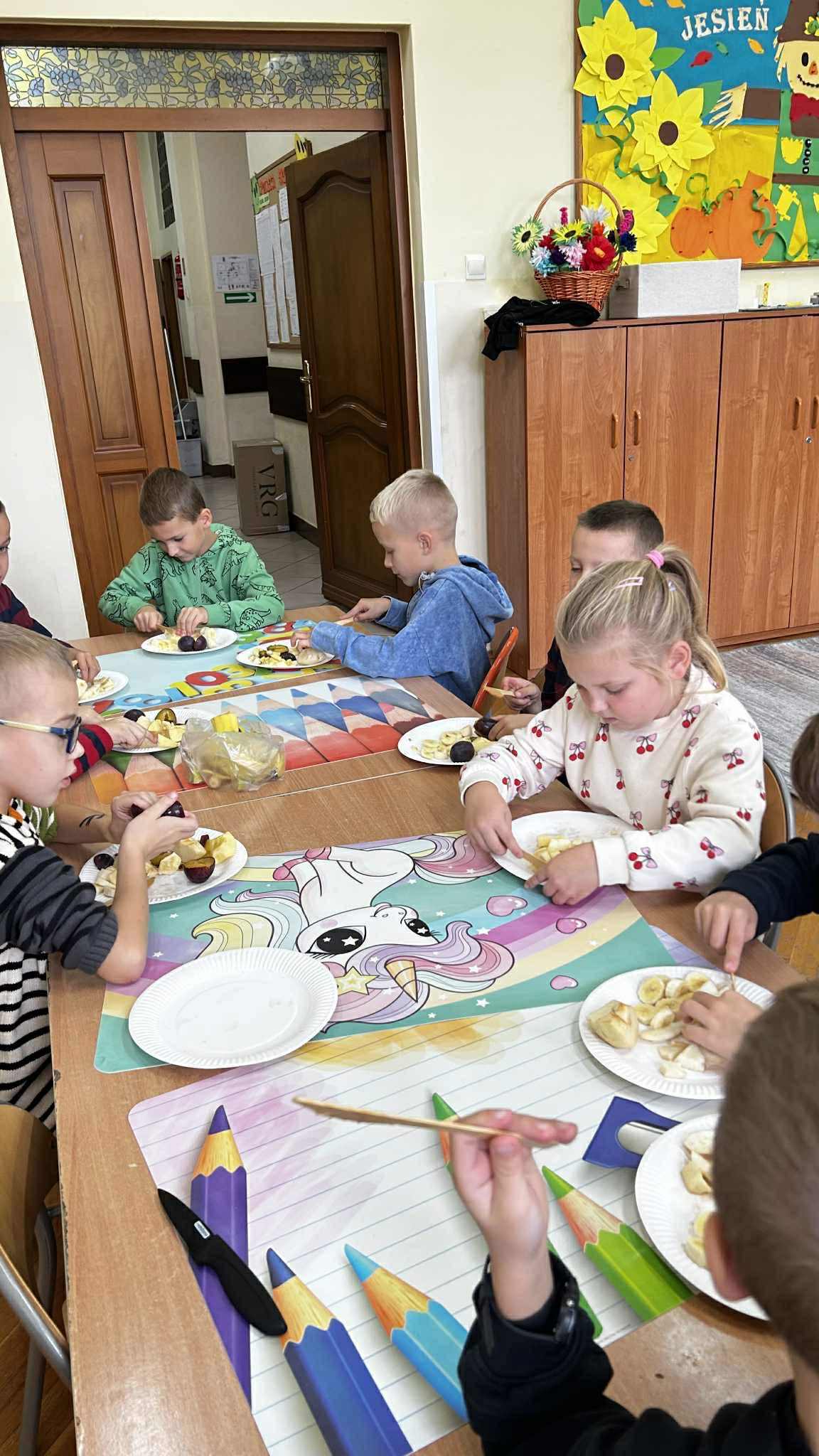 Podczas dzisiejszych zajęć na świetlicy szkolnej, dzieci poznały zasady zdrowego odżywiania oraz rozmawiały o wartościach odżywczych różnych produktów. Zwieńczeniem zajęć było wspólne przygotowanie sałatki owocowej. Uczniowie z ogromnym zaangażowaniem kroili jabłka, banany i śliwki. Gotowa sałatka nie tylko pięknie wyglądała, ale i wyśmienicie smakowała!