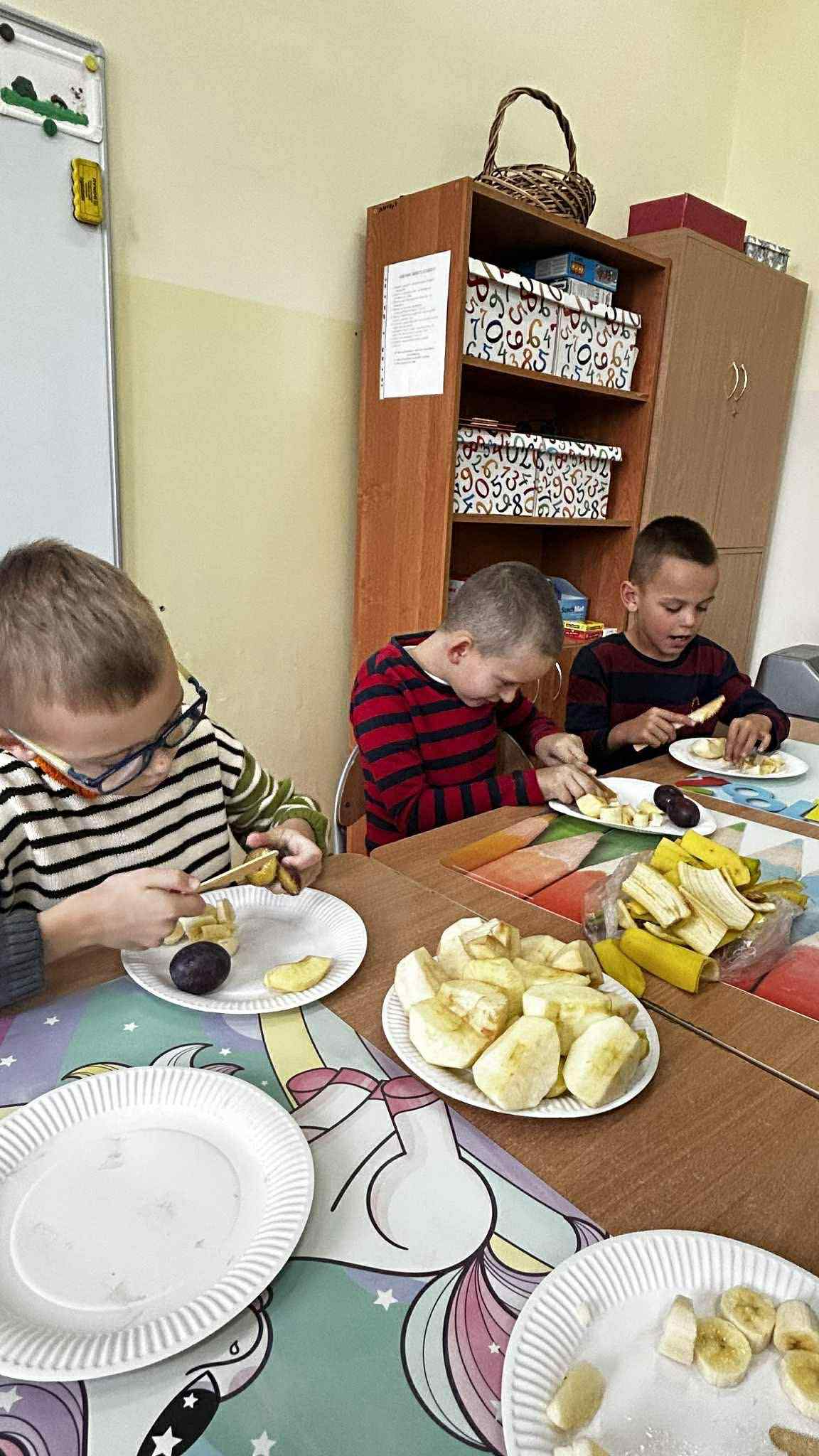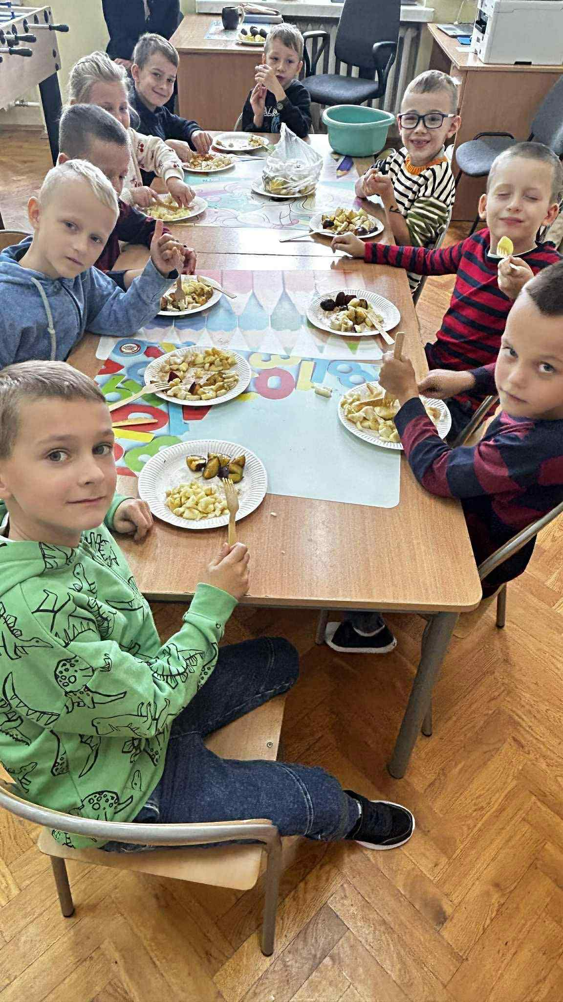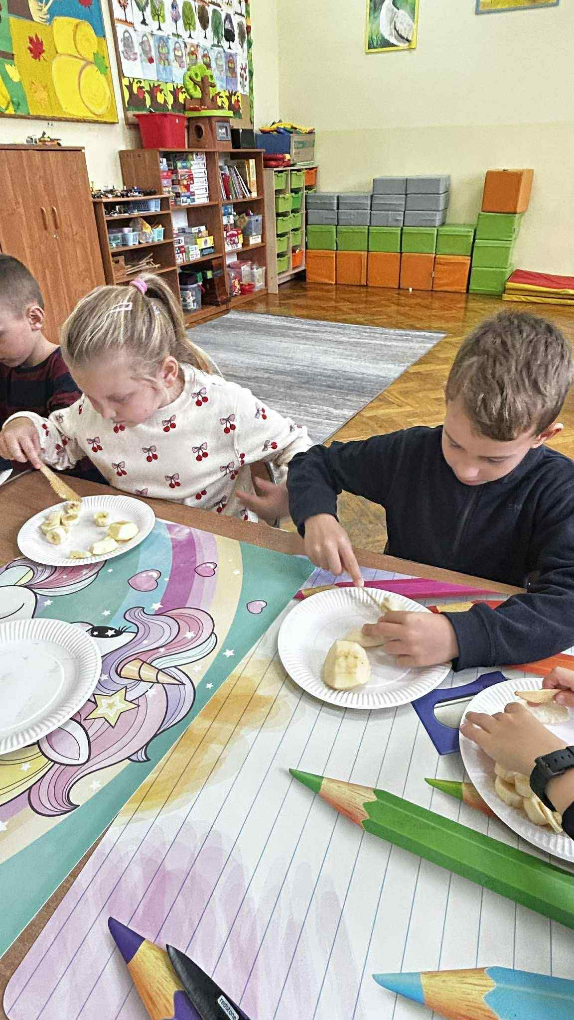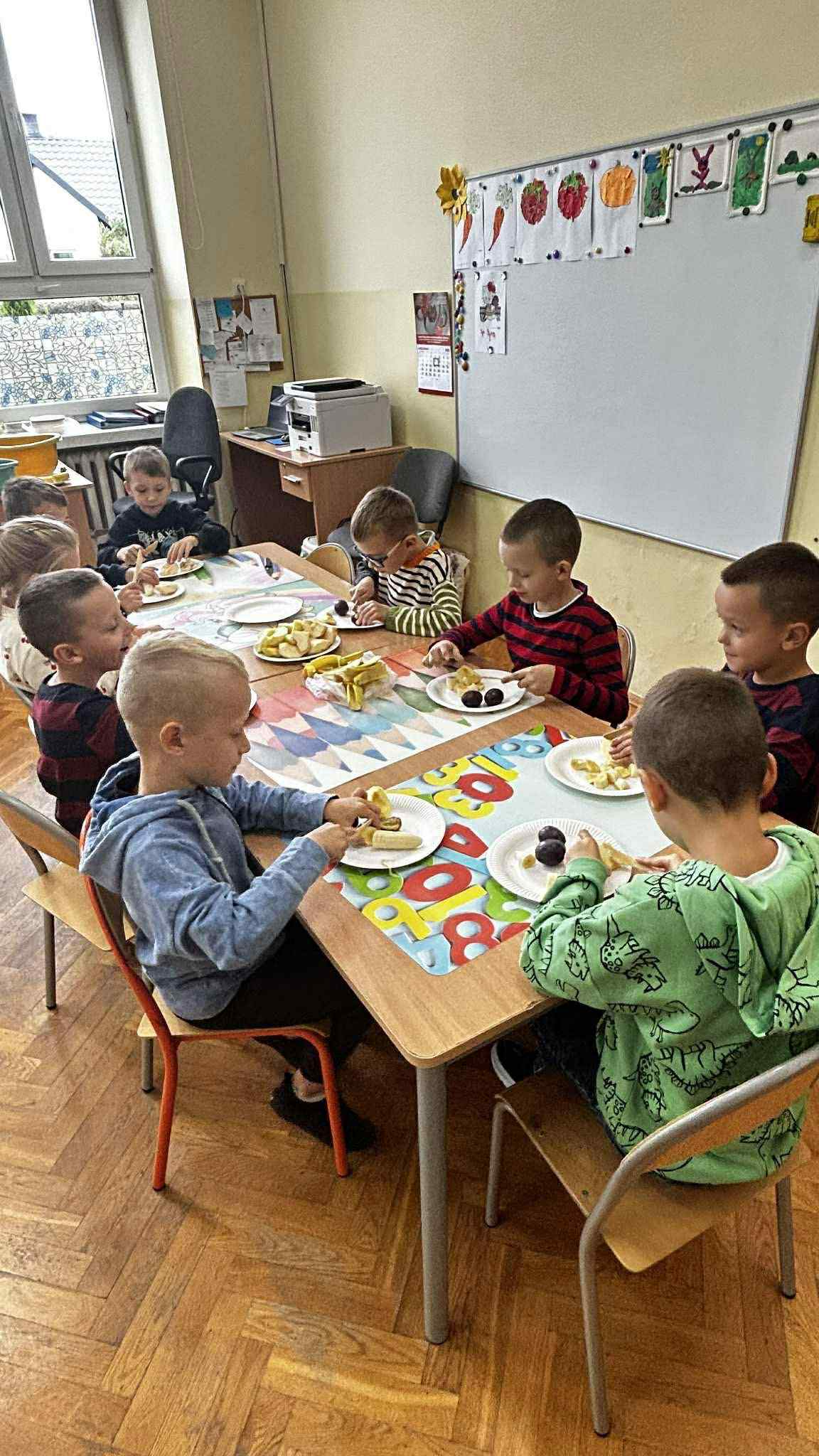 Podczas dzisiejszych zajęć na świetlicy szkolnej, dzieci poznały zasady zdrowego odżywiania oraz rozmawiały o wartościach odżywczych różnych produktów. Zwieńczeniem zajęć było wspólne przygotowanie sałatki owocowej. Uczniowie z ogromnym zaangażowaniem kroili jabłka, banany i śliwki. Gotowa sałatka nie tylko pięknie wyglądała, ale i wyśmienicie smakowała!