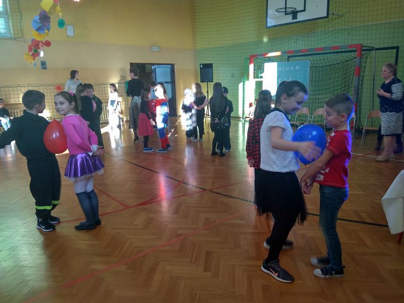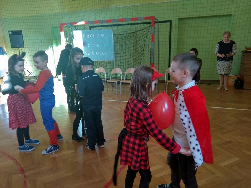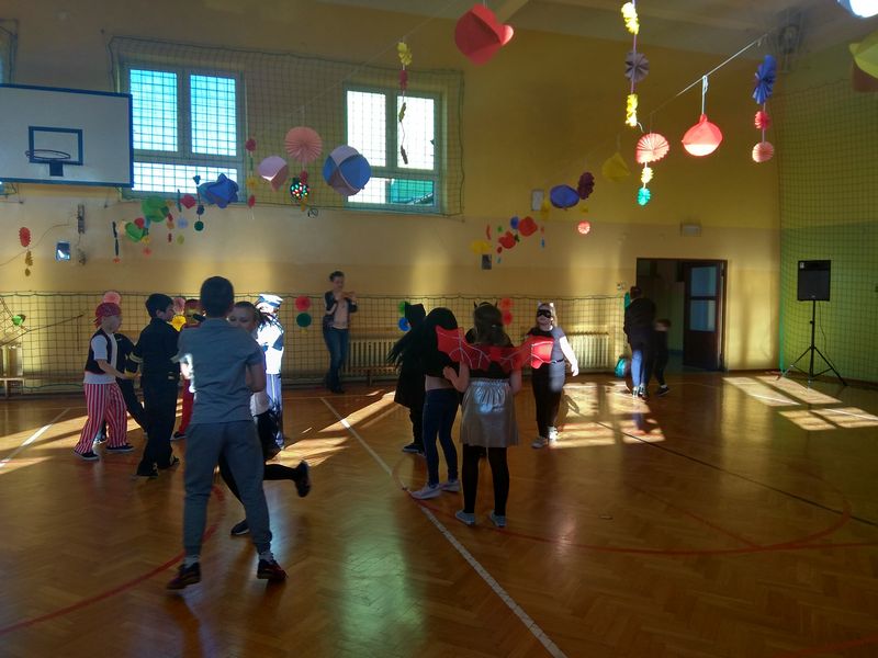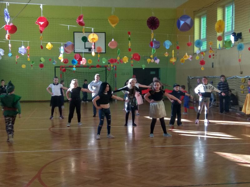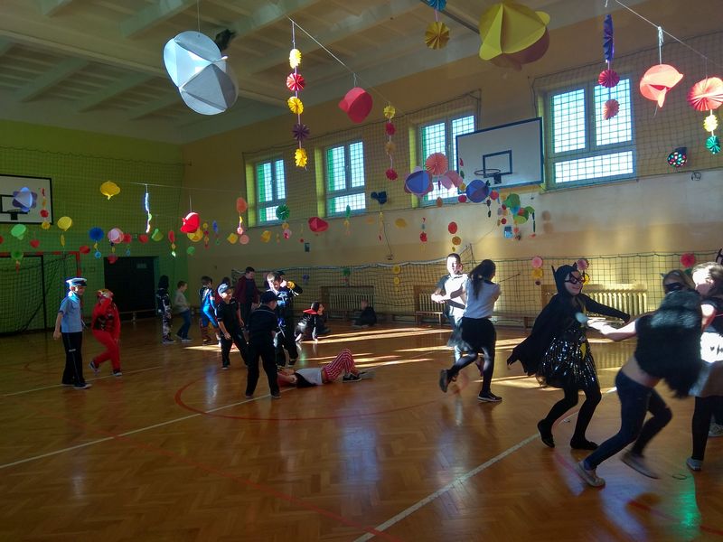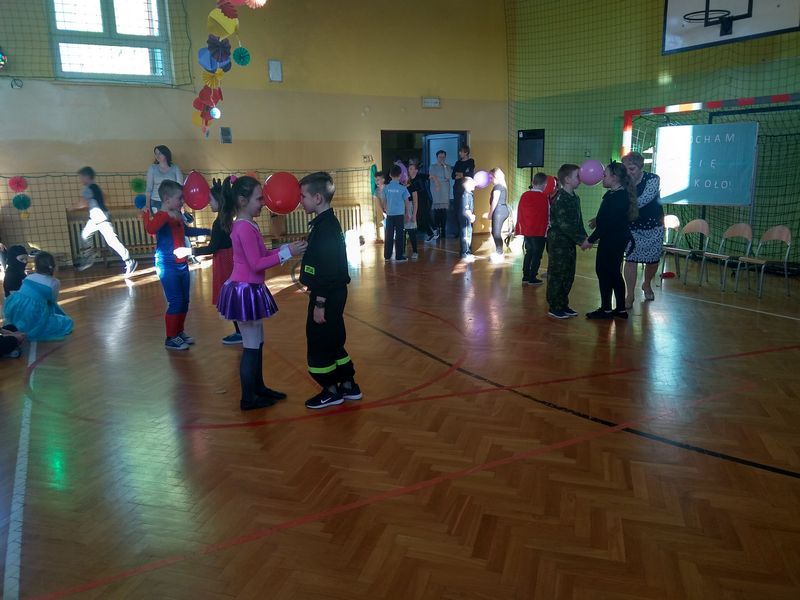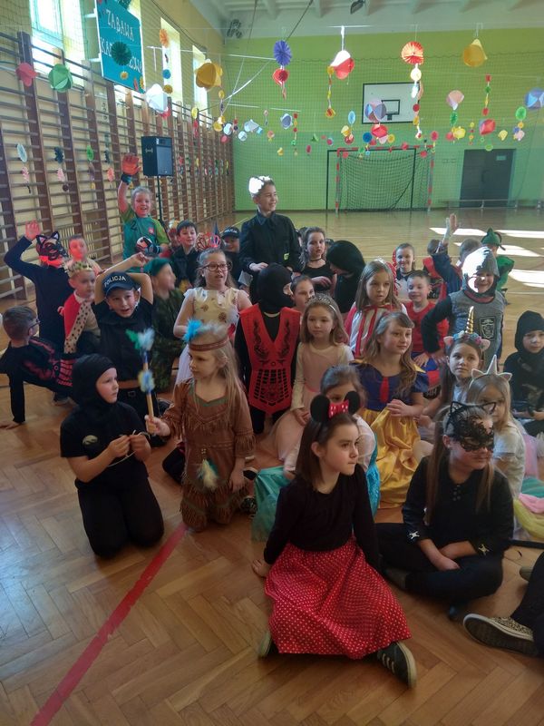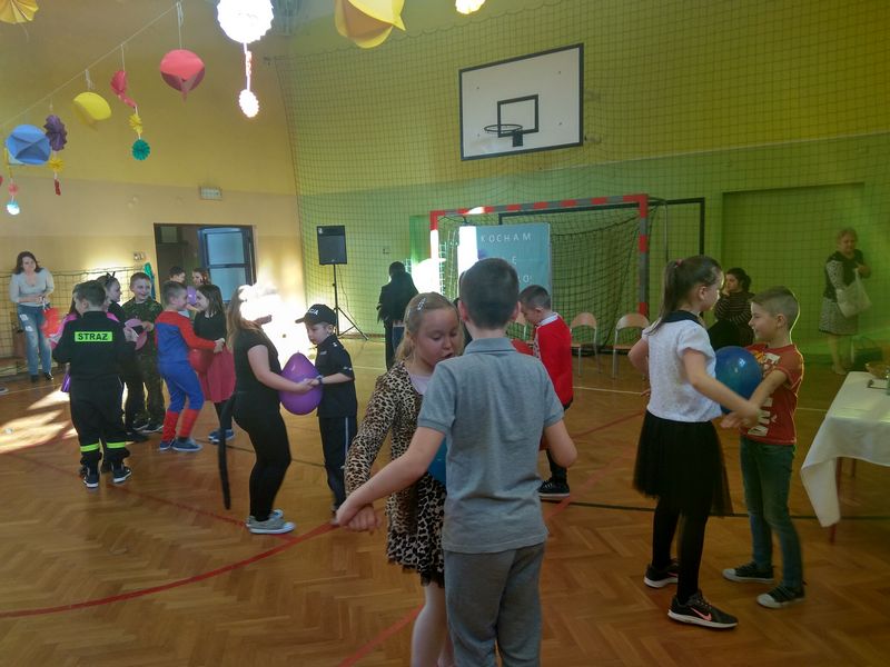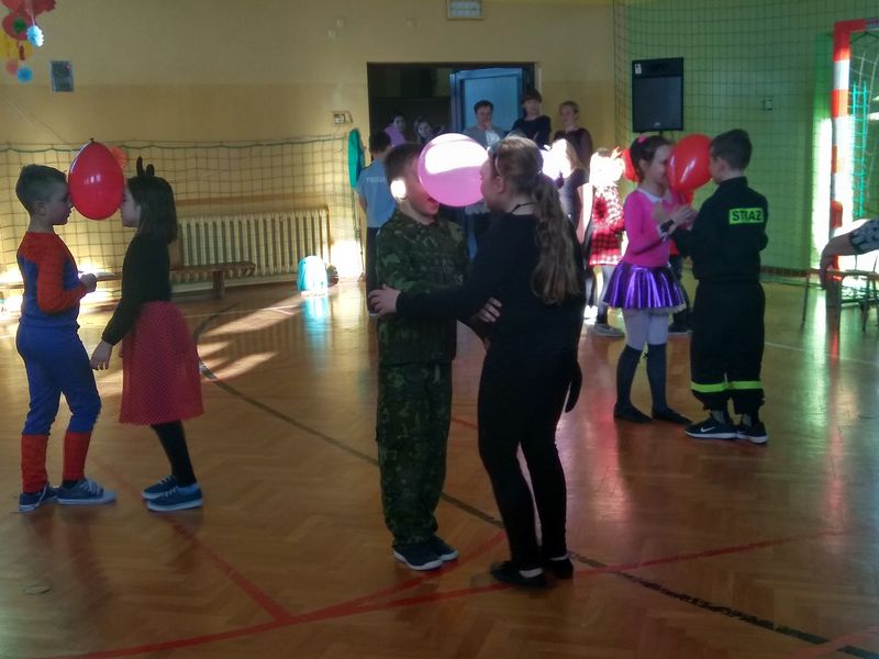 W dniu 7 lutego 2019 r. w naszej szkole odbyła się zabawa karnawałowa. Najwcześniej tańce rozpoczęły dzieci z klas młodszych. Wspaniale prezentowały się w swoich kostiumach nie tylko podczas wspólnych zabaw, ale także w trakcie konkursu na najciekawszy strój. Jury pod przewodnictwem pani dyrektor Barbary Kondziołki wyróżniło w tej kategorii 5 uczniów, którzy otrzymali słodkie nagrody. Dzieci brały również udział w konkurencji tanecznej z balonami. Ich starsi koledzy rywalizowali natomiast w specjalnym wydaniu „Kocham Cię szkoło” w kategorii „polszczyzna”. Przedstawiciele danej klasy musieli w jak najkrótszym czasie odgadnąć zagadkę i jej rozwiązanie ułożyć z liter, które mieli umieszczone na kamizelkach. W tym konkursie zwyciężyła klasa VII, drugie miejsce zajęła klasa Vb, a trzecia lokata przypadła klasie III b gimnazjum. Wszyscy uczestnicy otrzymali słodkie nagrody. Na bawiących się uczniów czekały również przygotowane przez rodziców ciasta, pizza oraz inne przekąski.