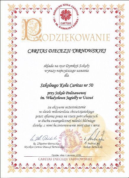 Koło Caritas działające w naszej szkole otrzymało statuetkę Fructus Caritatis. Nagrodę i dyplom wręczył pani dyrektor Barbarze Kondziołce biskup tarnowski Leszek Leszkiewicz podczas XIII Zjazdu Szkolnych Kół Caritas diecezji tarnowskiej, który odbył się 4 czerwca w Pasierbcu.