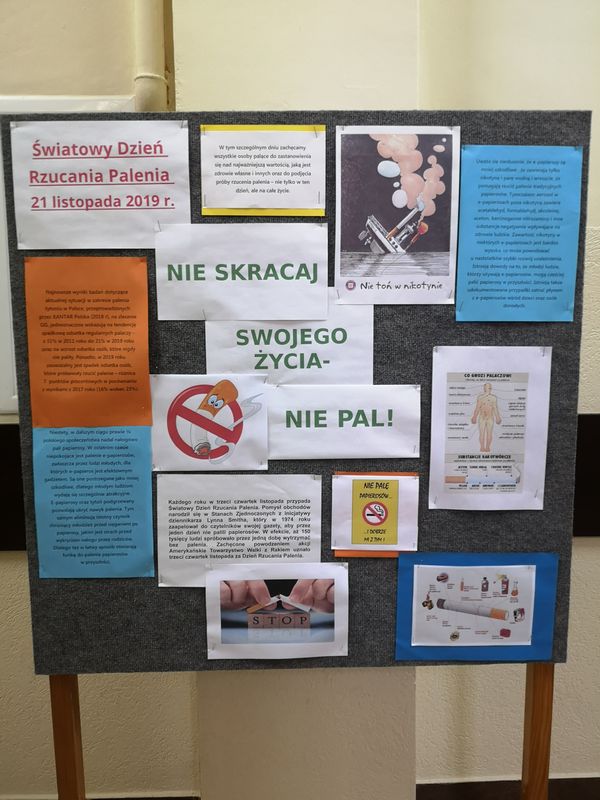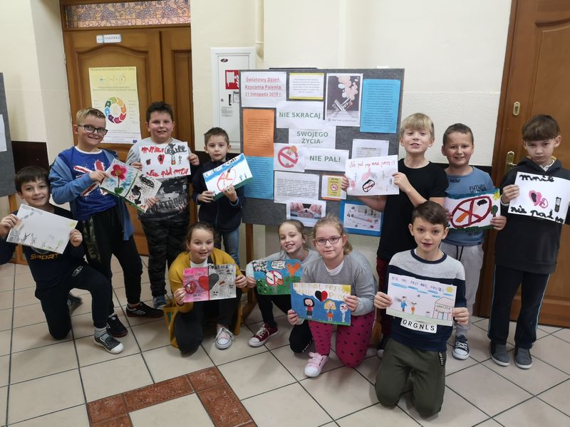 W tym roku szkolnym po raz kolejny realizowany jest w naszej szkole program edukacji antynikotynowej „Nie pal przy mnie, proszę”. Cel główny programu to zmniejszenie narażenia dzieci na bierne palenie. Podstawowe zajęcia programowe umożliwiają przeprowadzenie pięciu zajęć warsztatowych w ciągu roku szkolnego. W programie zawarte zostały uporządkowane treści dotyczące zdrowia (dostosowane do poziomu percepcji dzieci). Oczekiwane efekty działań edukacyjnych to m. in. uwrażliwienie dzieci na szkodliwe oddziaływanie dymu papierosowego związane z biernym paleniem, wykształcenie u dzieci umiejętności radzenia sobie w sytuacjach, gdy inni ludzie przy nich palą oraz wzrost świadomości rodziców i opiekunów w zakresie szkodliwości palenia. Co roku, w trzeci czwartek listopada (21.11.2019 r.) obchodzimy Światowy Dzień Rzucania Palenia, kiedy to zachęca się palaczy do odstawienia papierosów przynajmniej na jeden dzień.