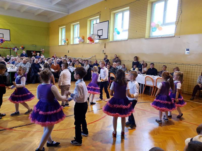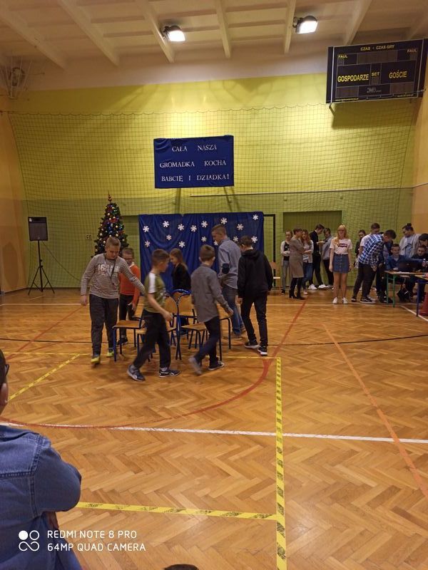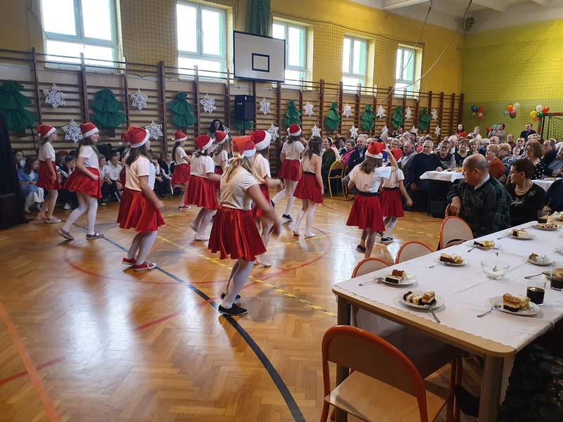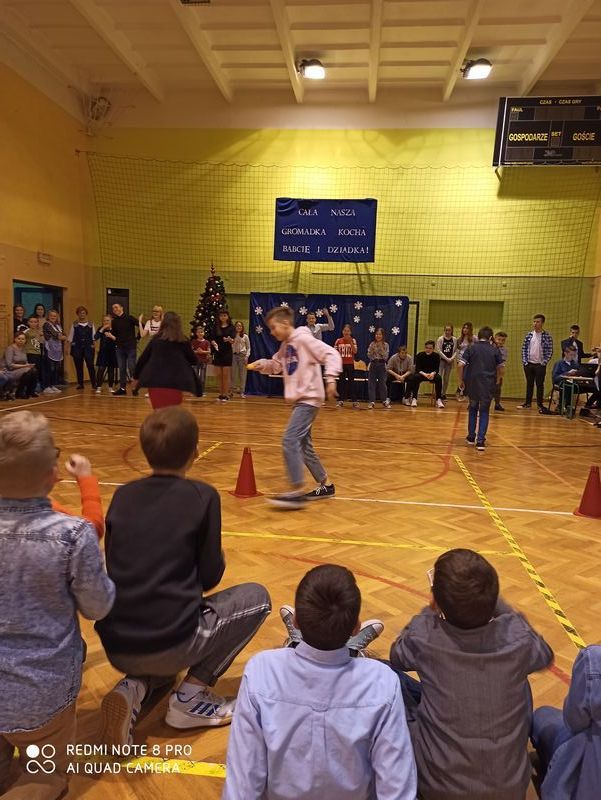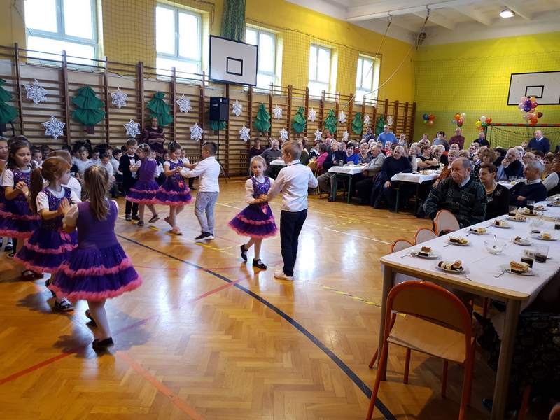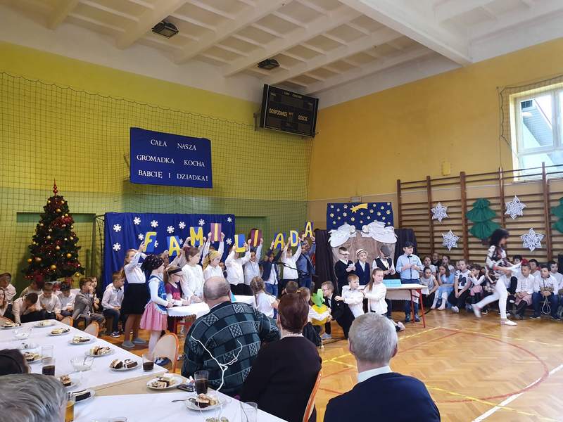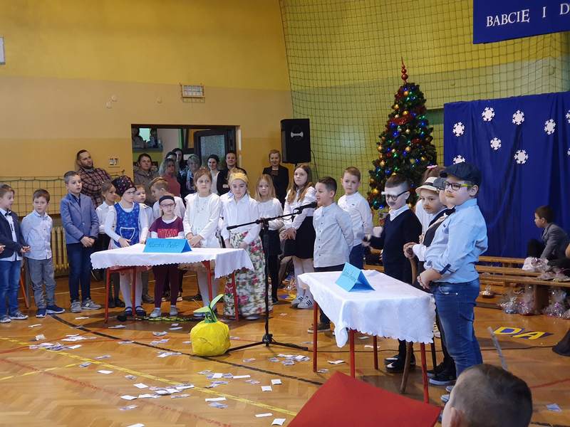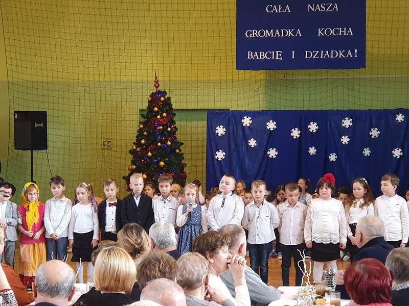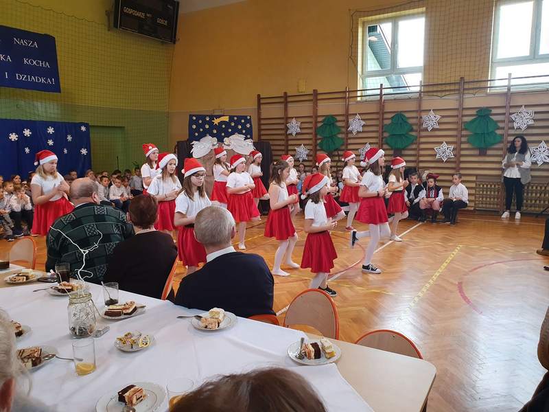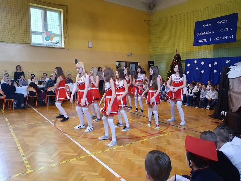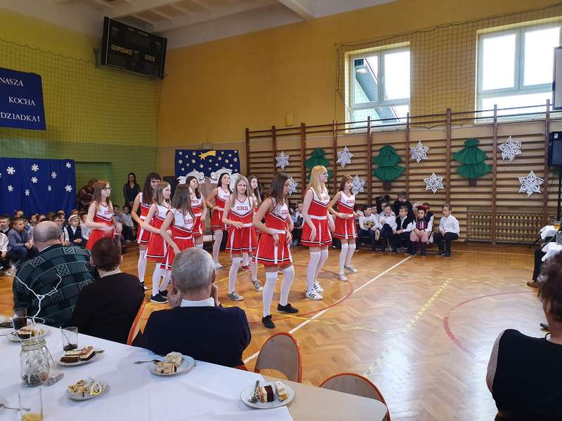 Obchody święta naszych babć i dziadków są tradycją na stałe wpisaną w kalendarz imprez szkolnych. To dzień pełen uśmiechów, wzruszeń i radości. Ta wspaniała uroczystość odbyła się 22 stycznia pod hasłem „Cała nasza gromadka kocha babcię i dziadka”. W pięknie udekorowanej sali gimnastycznej babcie i dziadkowie mogli podziwiać swoje pociechy w różnych formach artystycznych. Były to wiersze, okolicznościowe piosenki, scenki humorystyczne, Familiada oraz jasełka. Goście obejrzeli także pokazy taneczne w wykonaniu swoich wnuczek i wnuczków, którzy uczęszczają na zajęcia zespołu tanecznego oraz występ szkolnych cheerleaderek. Mali artyści z przejęciem odtwarzali swoje role, a szanowni goście ze wzruszeniem odbierali czułe słowa kierowane pod ich adresem. Następnie dzieci obdarowały swoich ukochanych dziadków własnoręcznie wykonanymi upominkami. Frekwencja jak co roku była wysoka. Spotkanie upłynęło w miłej i serdecznej atmosferze. Dzieci poprzez wiersz, piosenkę i taniec mogły wyrazić kochanym babciom i dziadkom swoje uczucia oraz podziękować za trud włożony w ich wychowanie. Serdeczne podziękowania dla rodziców, którzy pomogli w organizacji poczęstunku, a także upiekli ciasta.