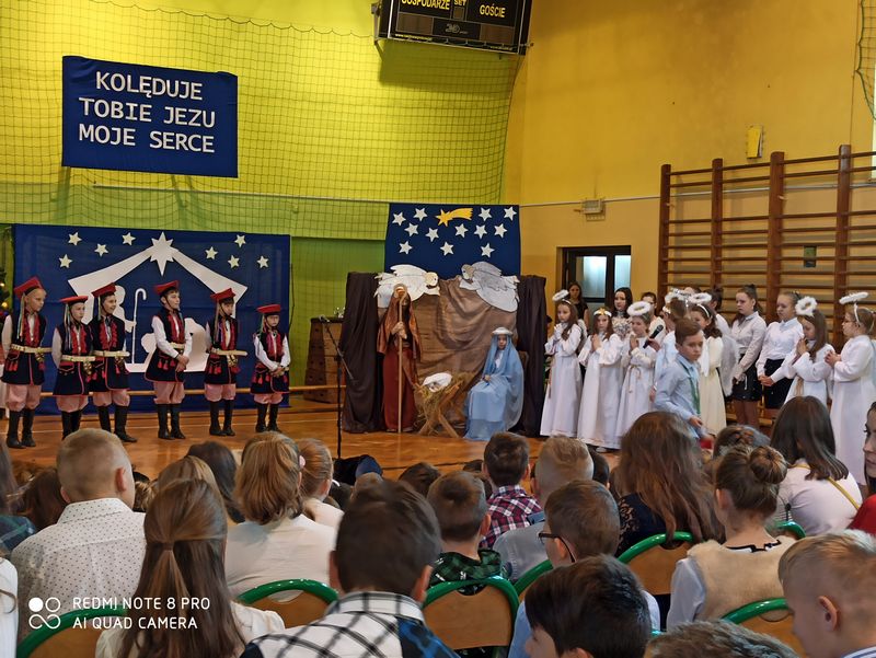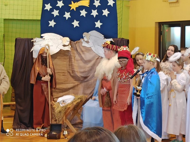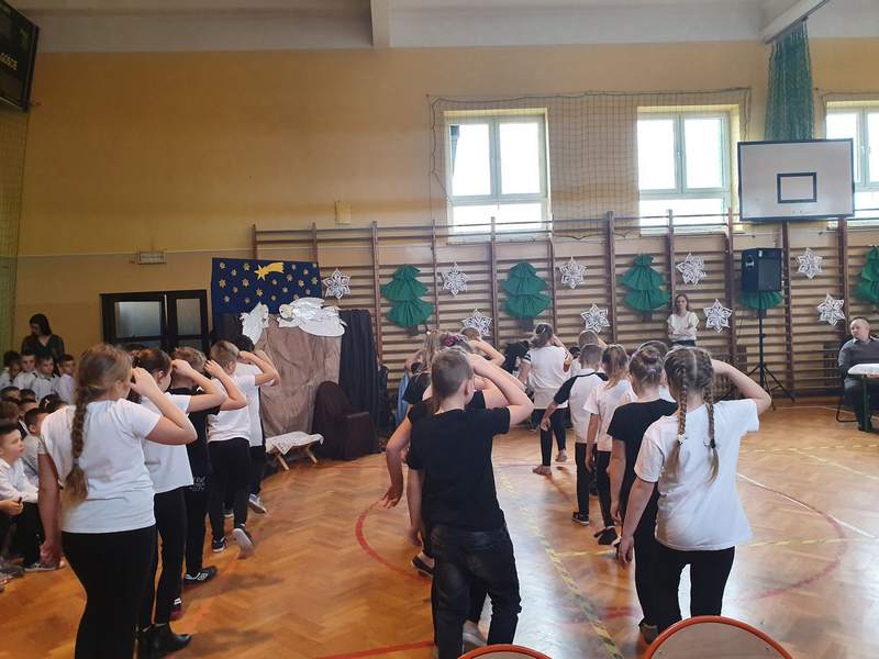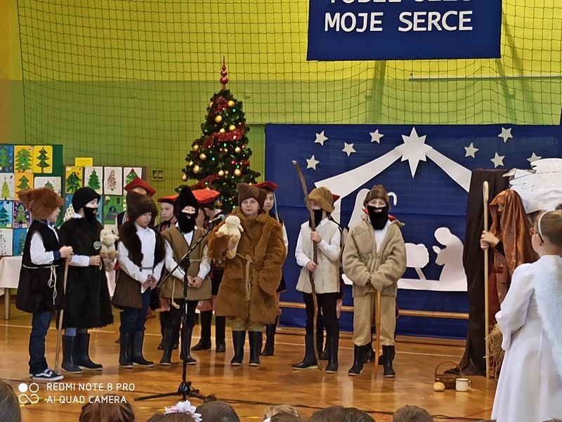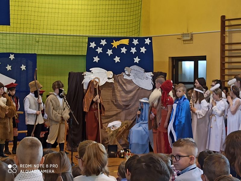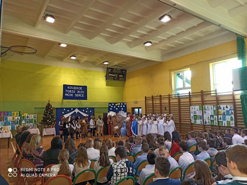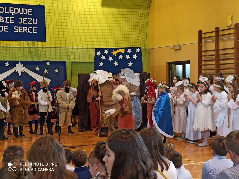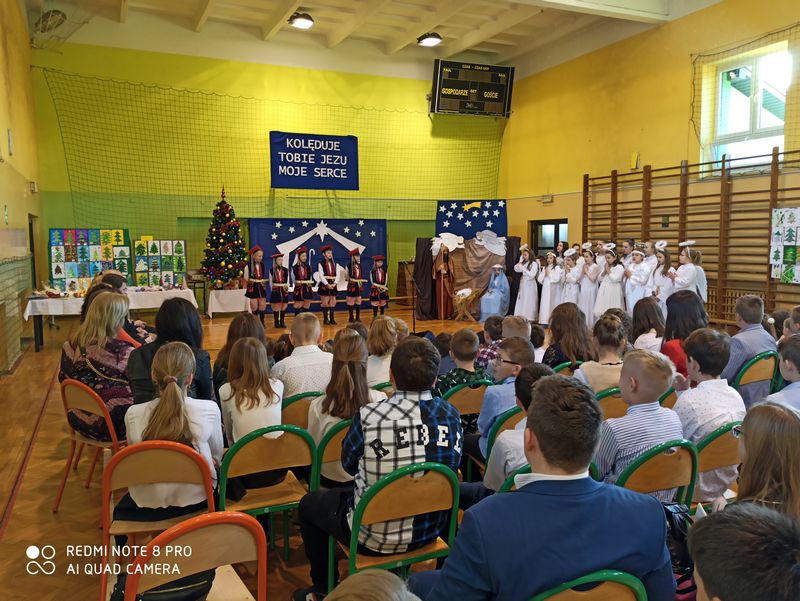 20 grudnia 2019 r. w naszej szkole odbyło się uroczyste spotkanie świąteczne, podczas którego zostało zaprezentowane widowisko o tematyce bożonarodzeniowej. Główne role odegrali w nim uczniowie klas IIIa i IIIb. Ubrani w przepiękne stroje przypomnieli historię związaną z przyjściem na świat Jezusa i zaśpiewali najpiękniejsze kolędy. Jasełka zakończyła pastorałka „Biegną mali pastuszkowie”. Następnie pani Dyrektor złożyła wszystkim życzenia świąteczne, po czym zebrani na sali uczniowie i nauczyciele odśpiewali kilka kolęd przy akompaniamencie pana Jakuba Kądziołki. Po zakończeniu spotkania odbyły się wigilie klasowe. Dzień ten był wolny od zajęć dydaktycznych.