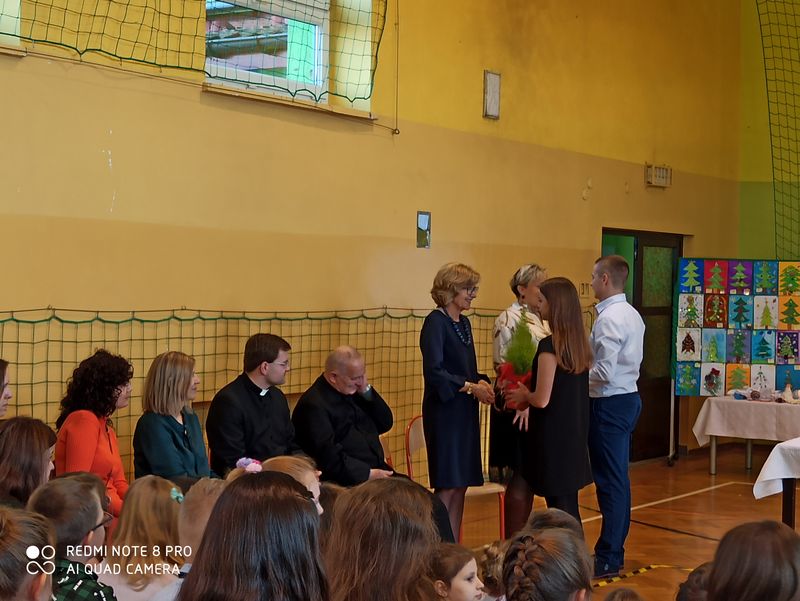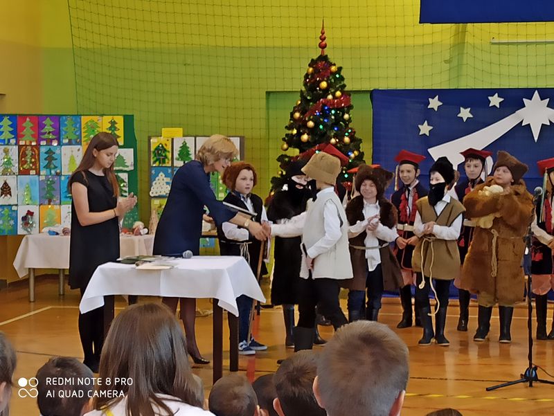Korzystając z obecności na sali wszystkich uczniów pani Dyrektor Barbara Kondziołka wręczyła nagrody uczniom biorącym udział w konkursach: recytatorskim, ortograficznym oraz plastycznym na najładniejszą choinkę i ozdobę choinkową.