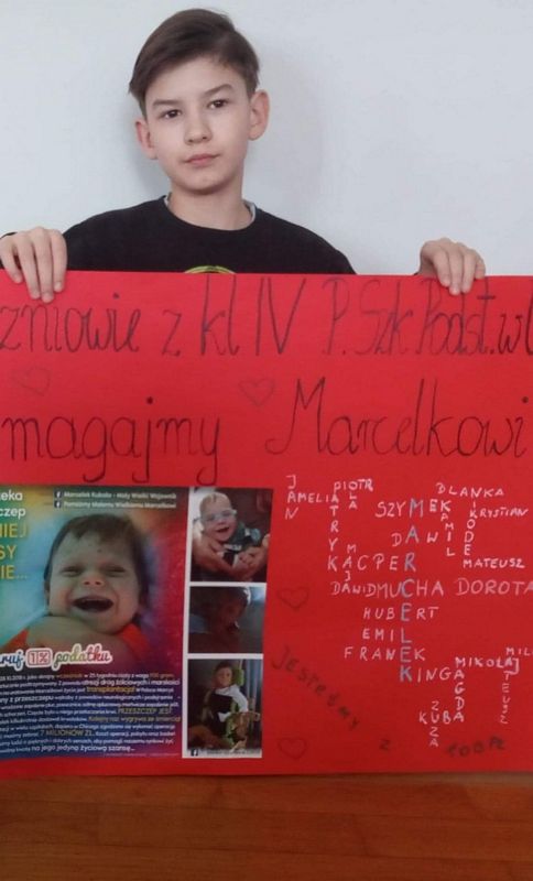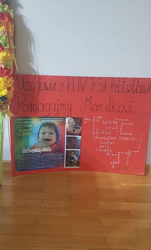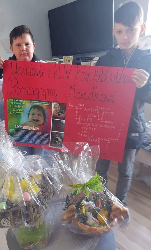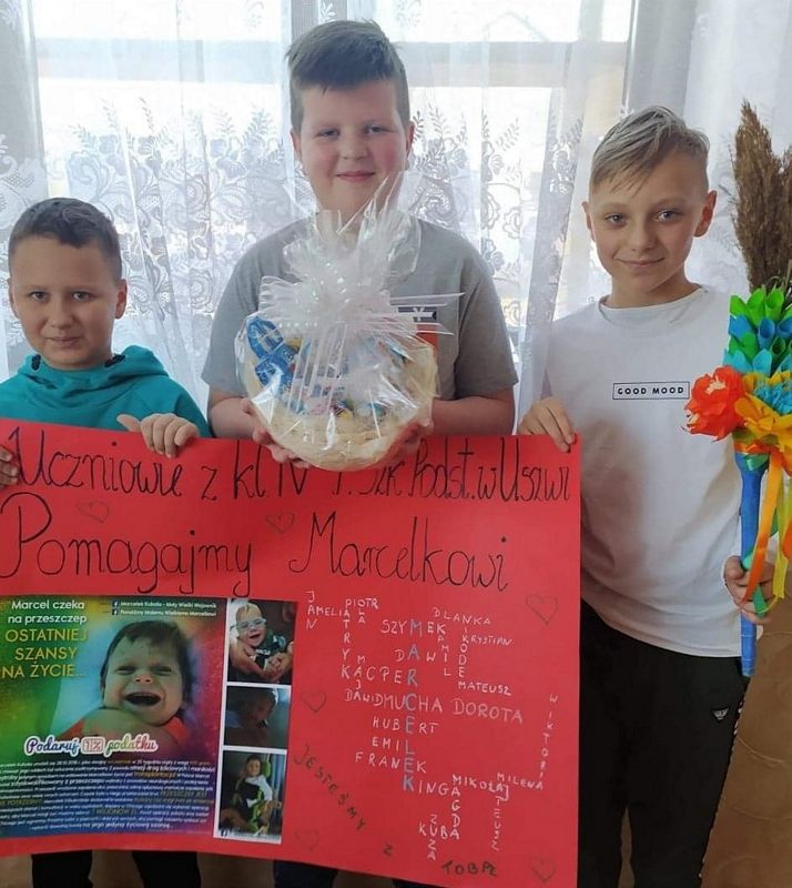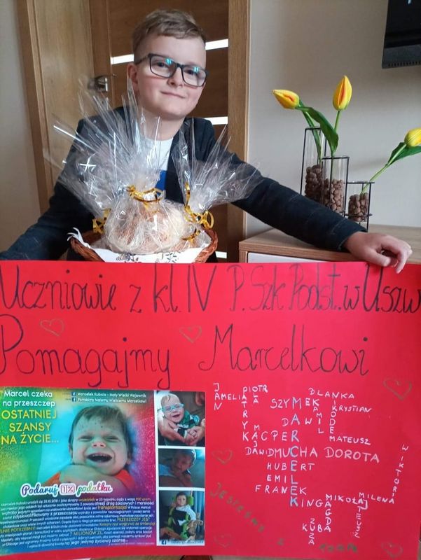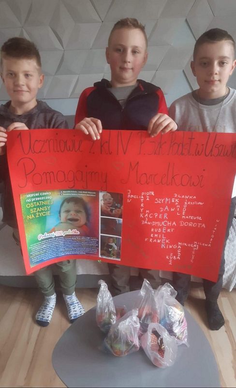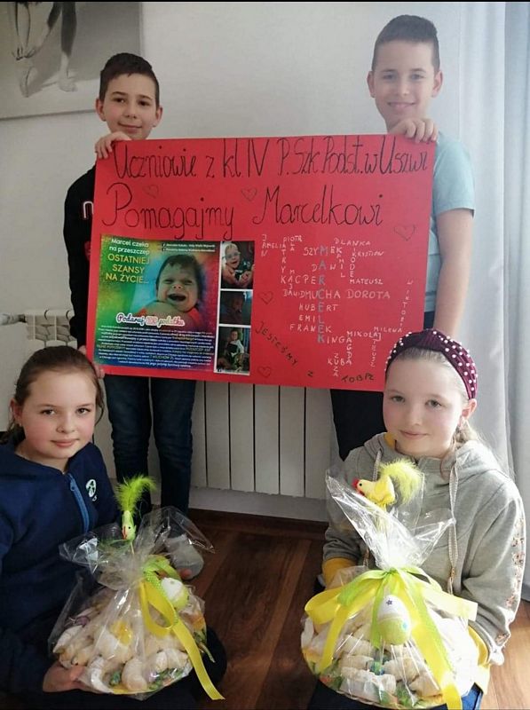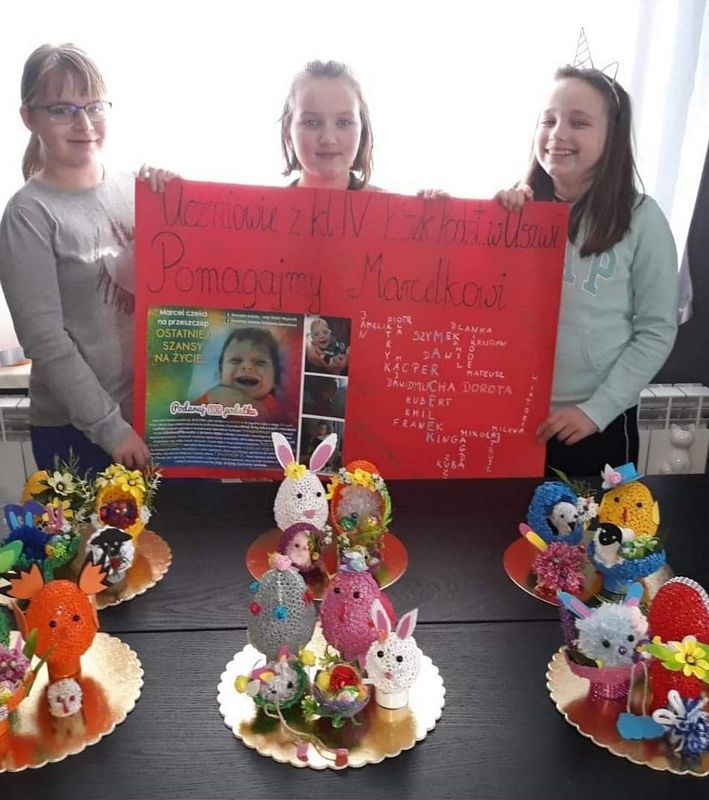 Najpierw w marcu i kwietniu byli członkami armii Marcelka Kubali z Jadownik, dla którego zbierano pieniądze na przeszczep wątroby. Czwartoklasiści z pomocą swoich rodzin piekli różne ciasta i ciasteczka, chleby, smażyli pączki, wykonywali palmy i stroiki wielkanocne, przygotowywali paczki. Wszystko to wystawialiśmy na licytacje. Łącznie zebraliśmy 4.076 zł. Dzieci bardzo się ucieszyły, że mogły wesprzeć młodszego kolegę, ale najwięcej radości wszystkim nam sprawił fakt, że operacja Marcelka się udała i chłopiec czuje się coraz lepiej.
