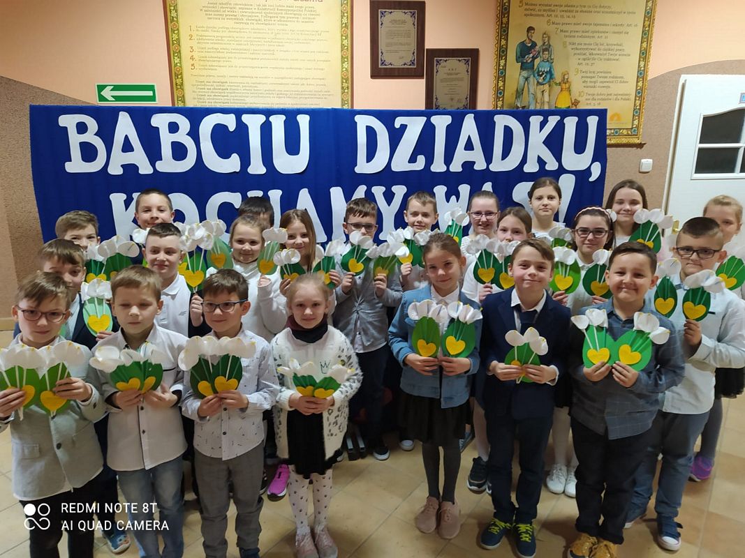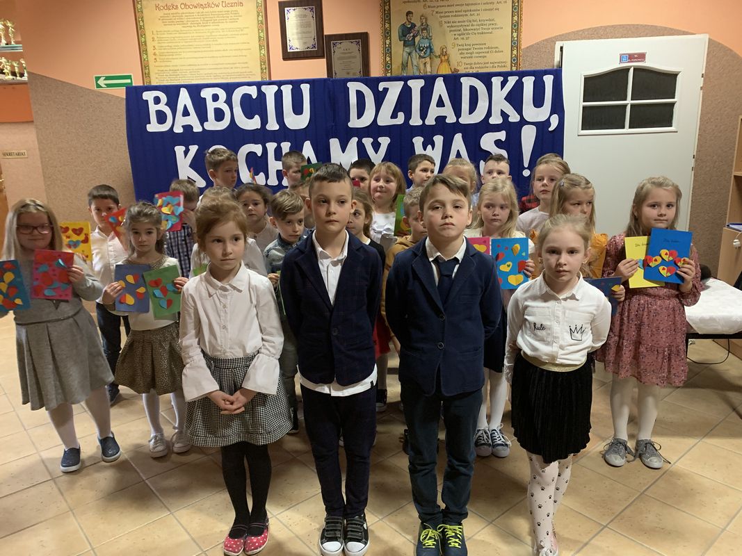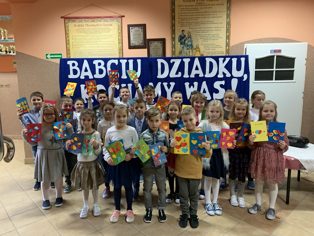 Z tej okazji dnia 22 stycznia uczniowie klas I-III pod opieką wychowawczyń przygotowali krótki montaż słowno-muzyczny. Dzieci poprzez życzenia, wiersze i piosenkę podziękowały wszystkim babciom i dziadkom za ich cierpliwość, zrozumienie, a przede wszystkim za czas, który zawsze mają dla wnuków. Wykonały także dla swoich dziadków drobne upominki oraz laurki.