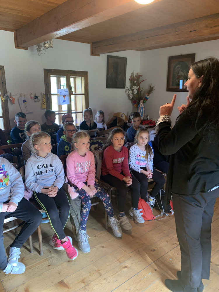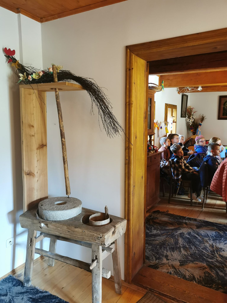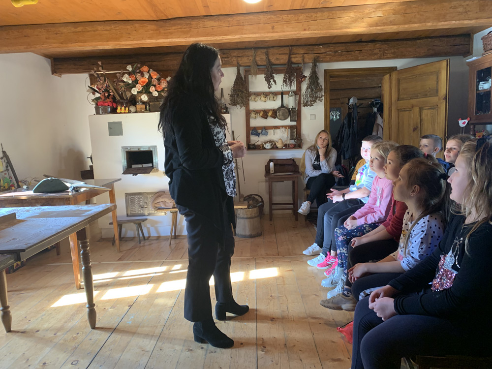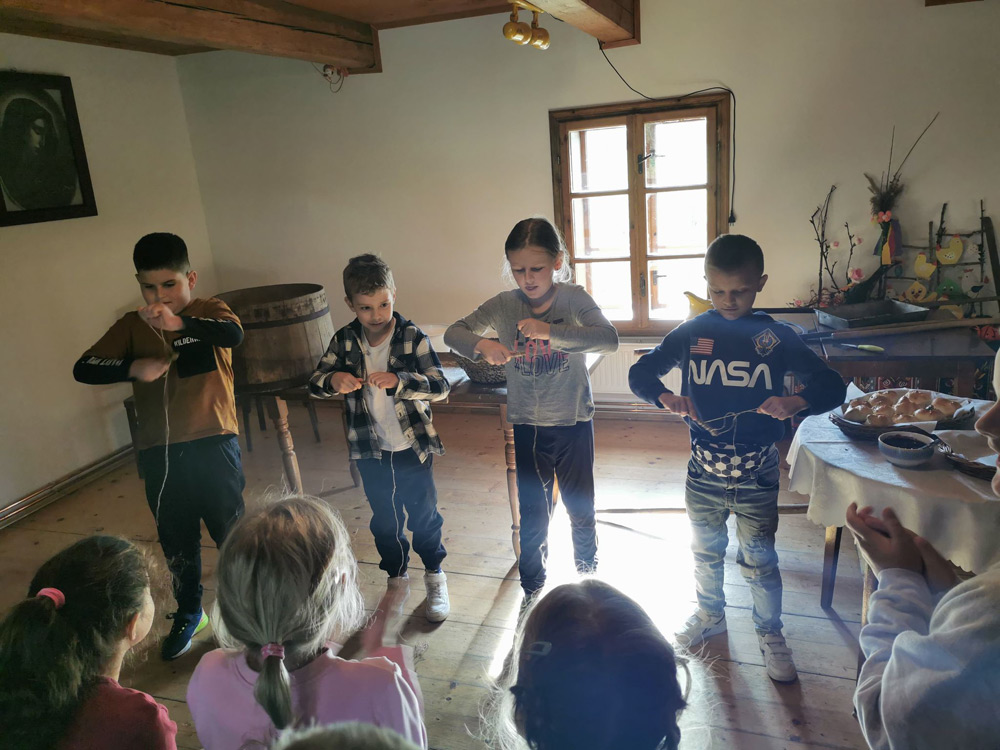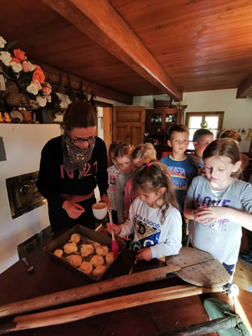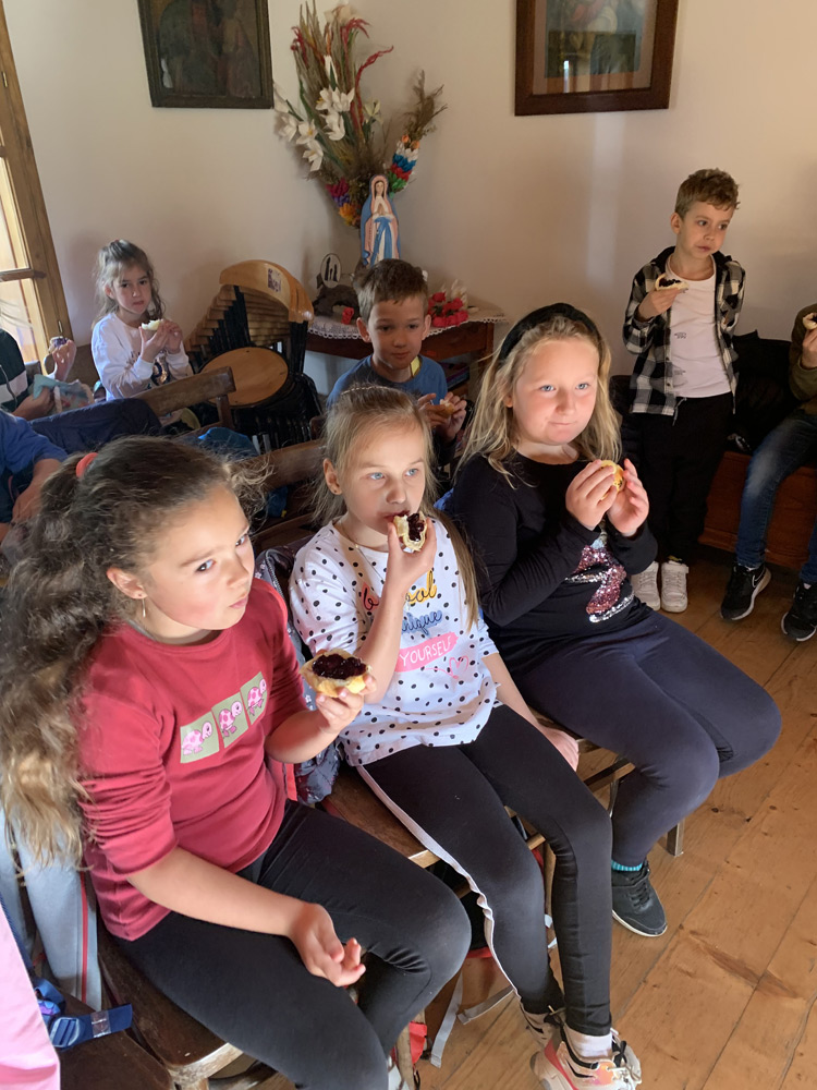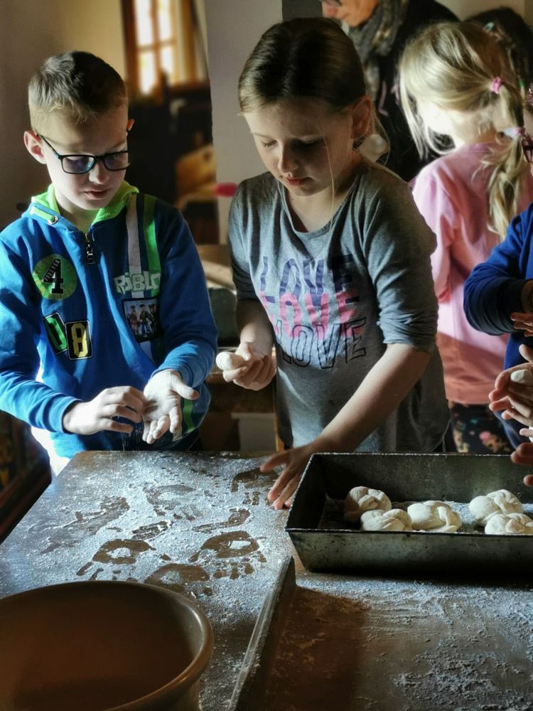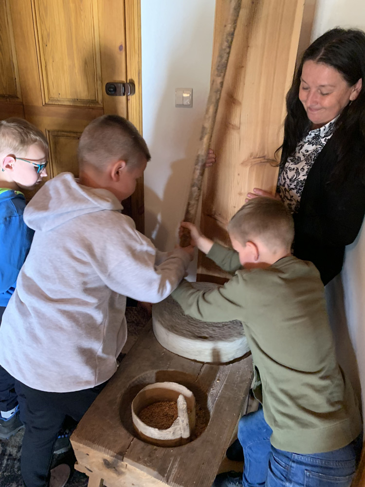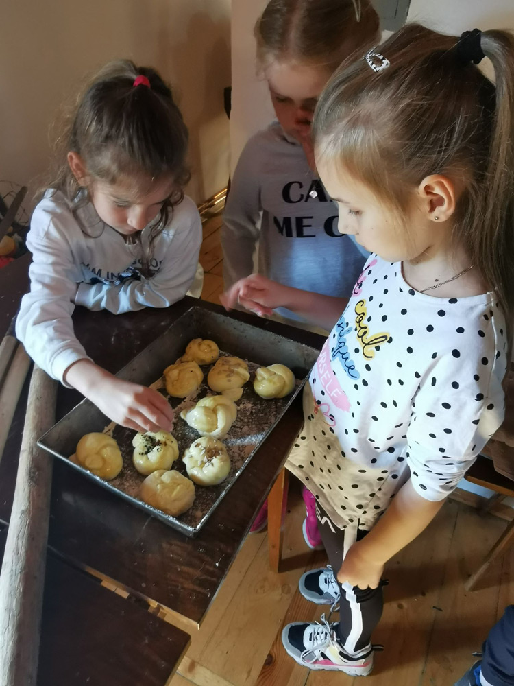 26 października 2021 r. klasa II wybrała się do Ośrodka Kultury Regionalnej w Starym Wiśniczu na specjalną lekcję połączoną z warsztatami. Podczas tych zajęć dzieci poznawały tradycyjne gospodarstwo chłopskie sprzed stu lat, m.in. obowiązki członków rodziny, obyczaje i przesądy związane z pracą w polu czy nazewnictwo różnych narzędzi dziś już nieużywanych. Głównym tematem lekcji było pochodzenie chleba na ziemiach polskich, sposoby młócenia zbóż, wyrabiania ciasta oraz pieczenia chleba w piecu. Uczniowie mogli dokładnie przyjrzeć się takim sprzętom, jak: cep, sierp, żarna, słomianka, dzieża. W trakcie warsztatów dzieci mełły zboże, wyrabiały ciasto, zwijały sznurek na czas, a na koniec ze smakiem zajadały upieczone przez siebie bułeczki z konfiturą.