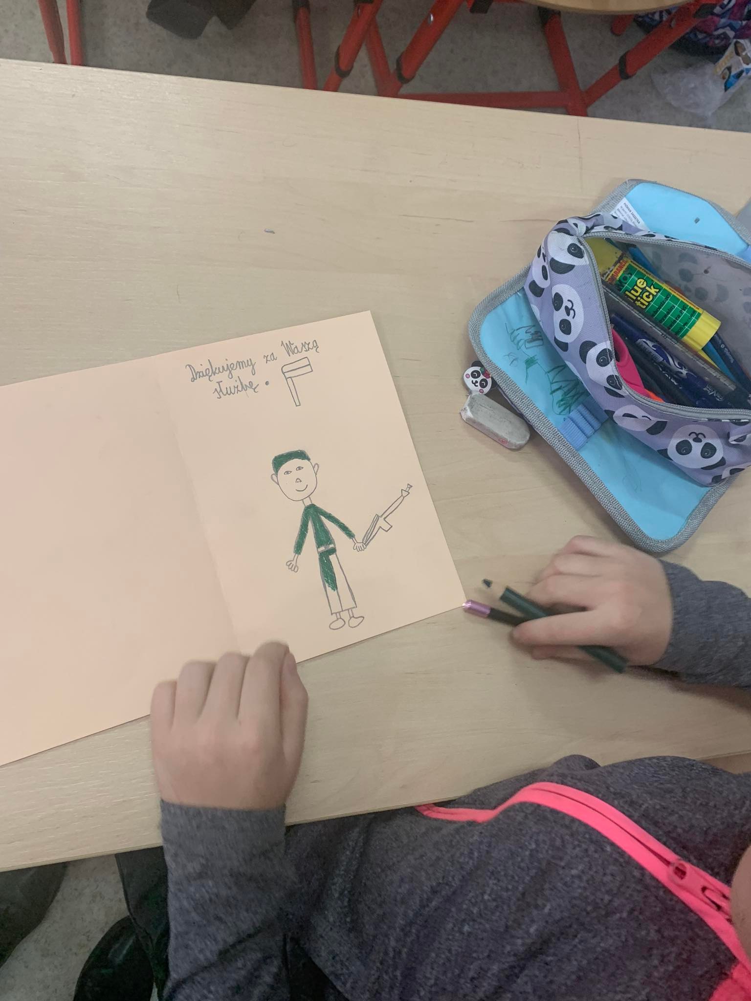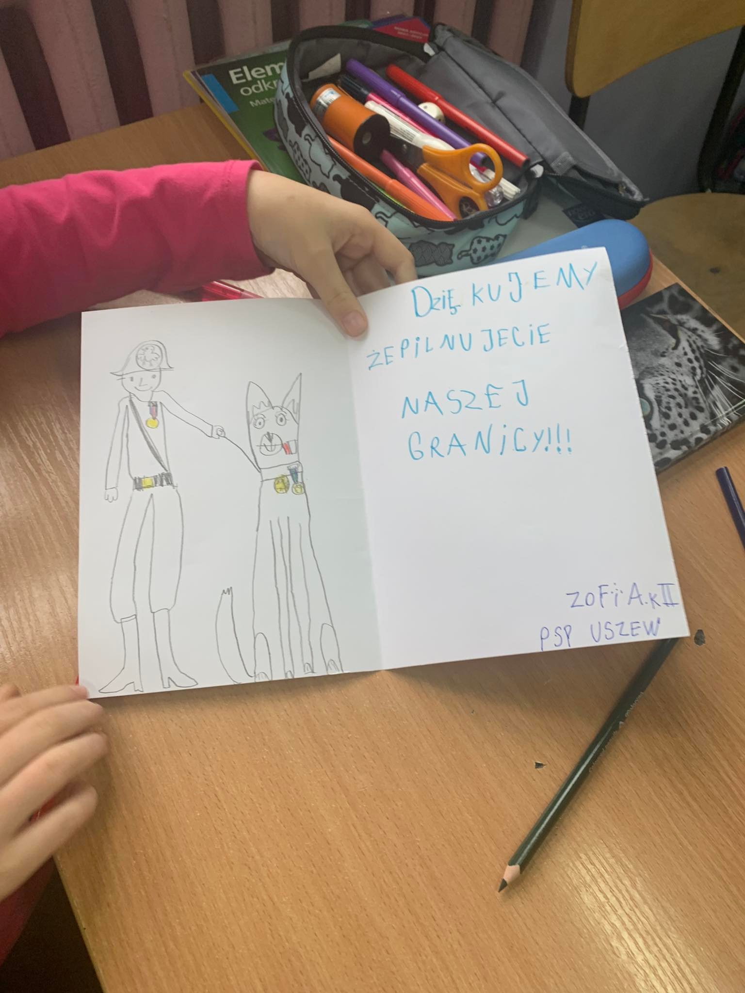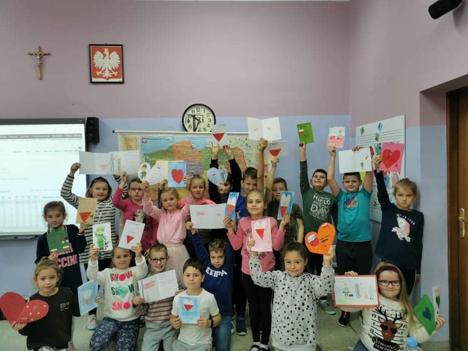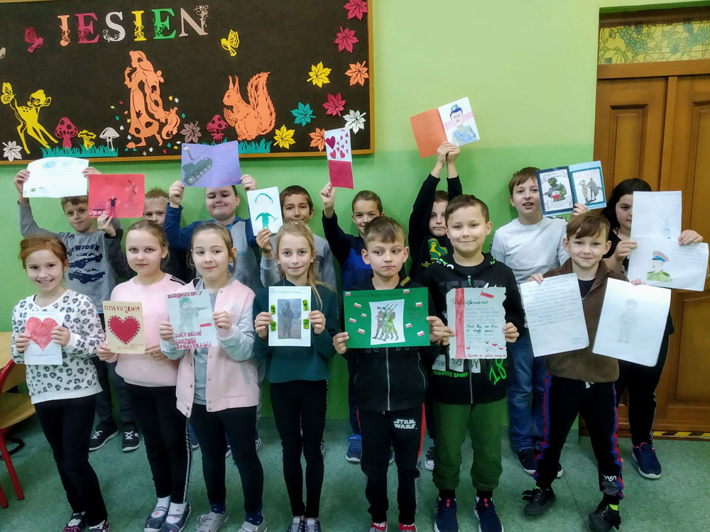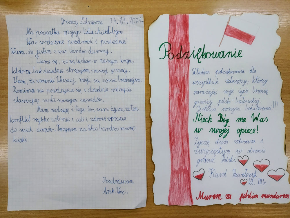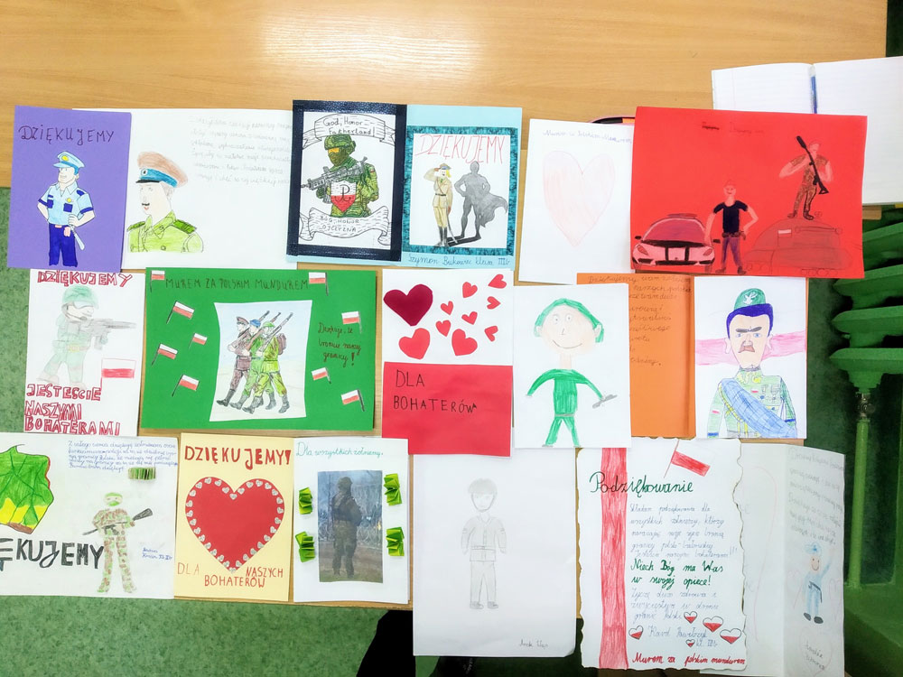 Młodsi uczniowie naszej szkoły bardzo chętnie i z wielkim zapałem włączyli się do tej szczytnej akcji poprzez własnoręczne wykonanie laurek z wyrazami wsparcia, wdzięczności i podziękowania służbom mundurowym. Stworzyli piękne prace, które trafią do polskich służb broniących wschodniej granicy.