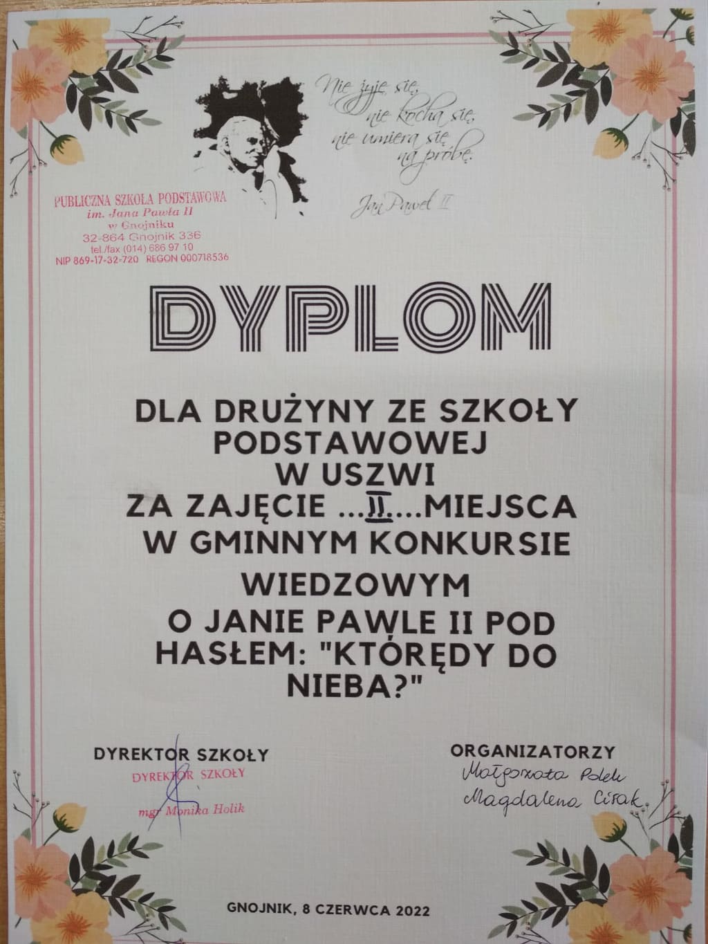 8 czerwca odbył się gminny etap Konkursu wiedzy o Janie Pawle II pod hasłem „Którędy do nieba" zorganizowany przez PSP w Gnojniku. Drużyna z naszej szkoły: Paulina Górak i Aleksandra Kowalczyk z kl. 7a zajęły w nim II miejsce. Gratulujemy!