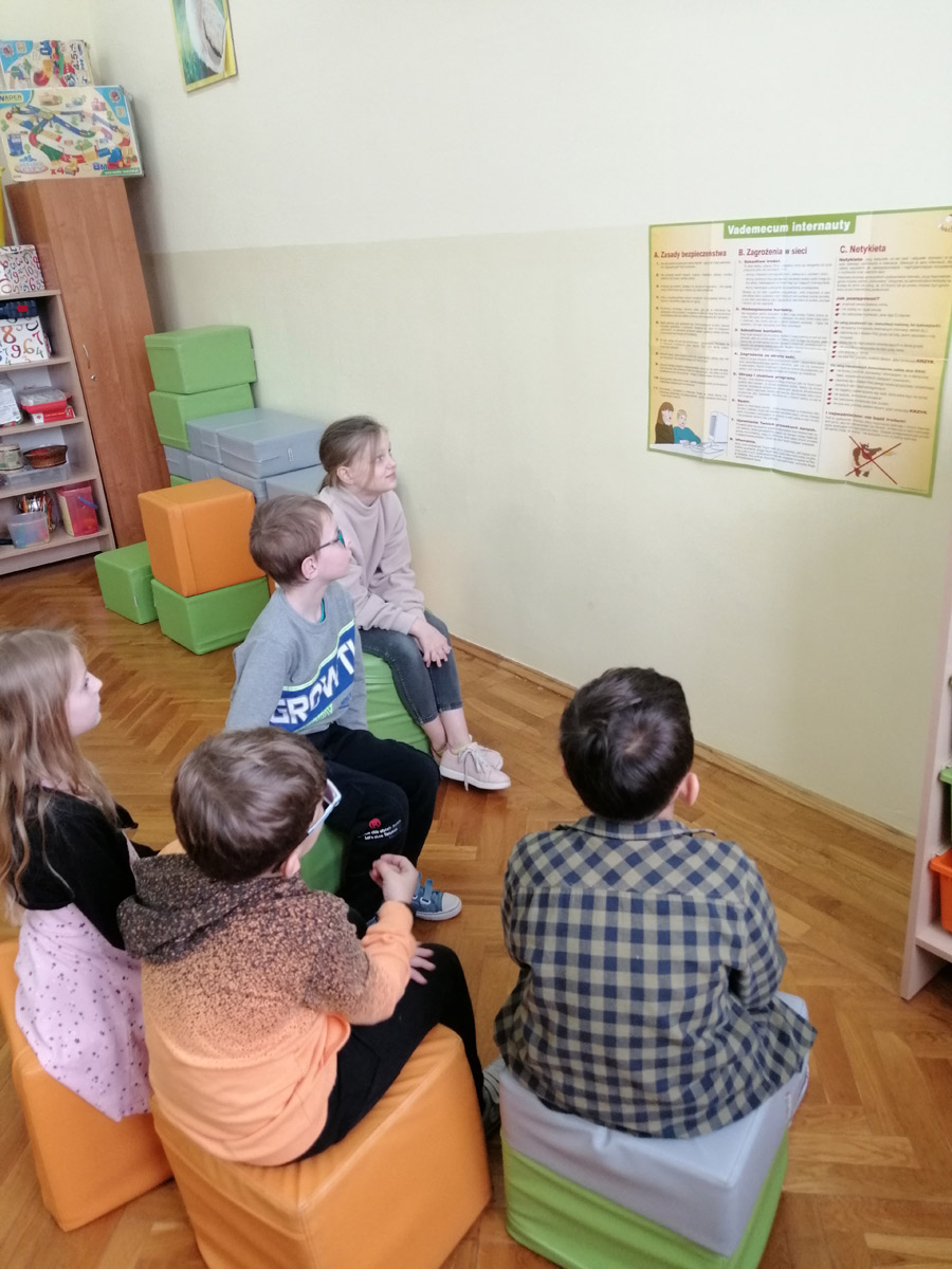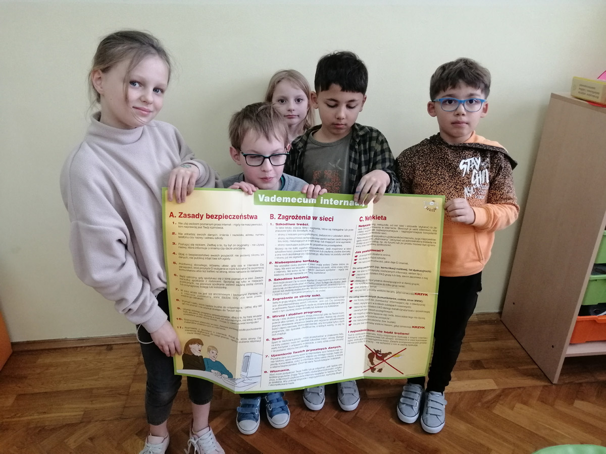 Dzień Bezpiecznego Internetu został ustanowiony z inicjatywy Komisji Europejskiej i jest obchodzony w całej Europie w pierwszej połowie lutego. Inicjatywa ta ma na celu propagowanie działań na rzecz świadomego korzystania dzieci i młodzieży z zasobów Internetu. Nasza szkoła ponownie włączyła się w tę ważną akcję, która w tym roku odbyła się 8 lutego. Na lekcjach wychowawczych oraz na zajęciach z informatyki zostały przeprowadzone pogadanki oraz zaprezentowano filmiki i animacje związane z tematyką bezpieczeństwa w sieci, natomiast w świetlicy szkolnej dzieci zapoznały się z Vademecum internauty.