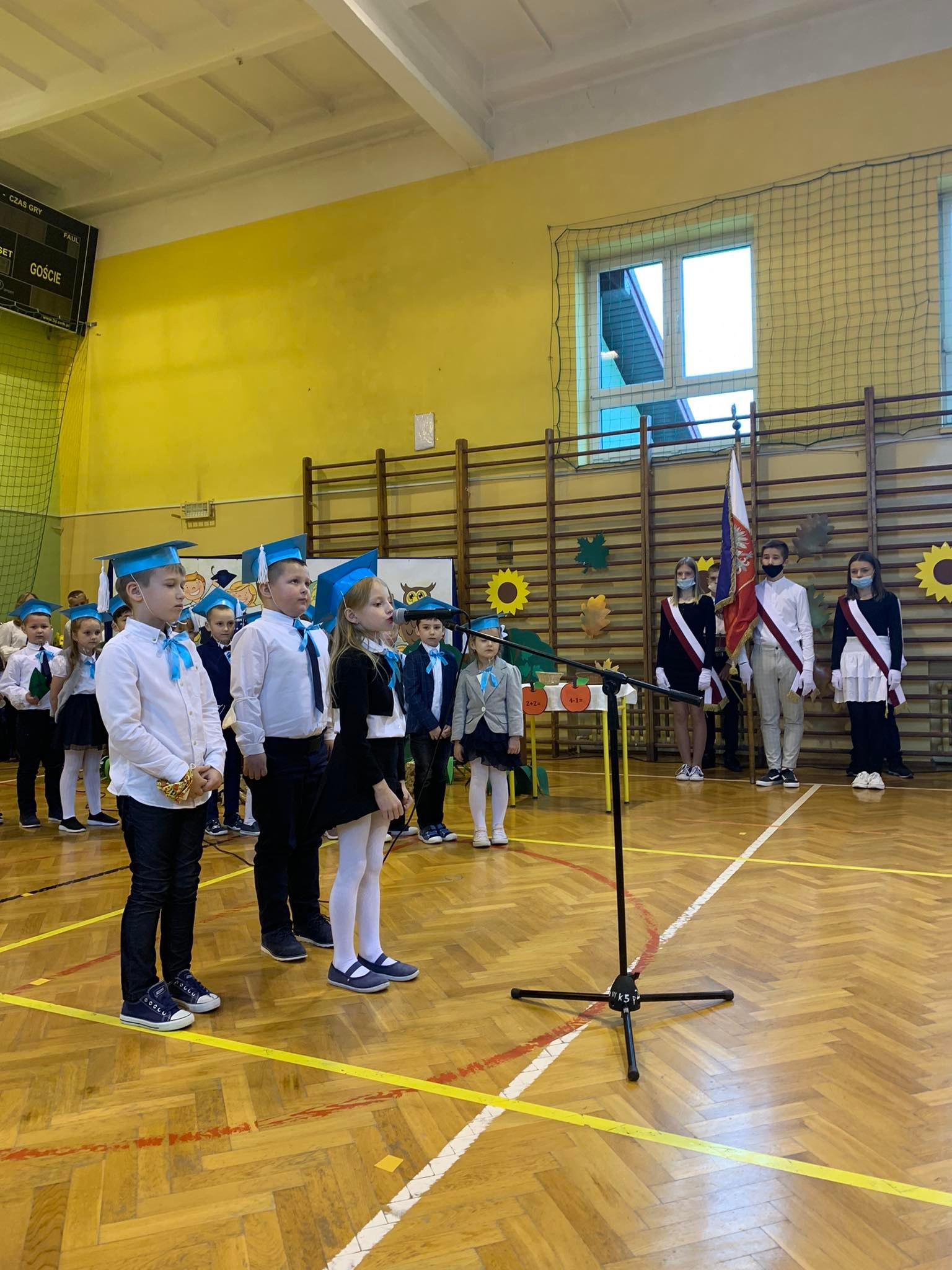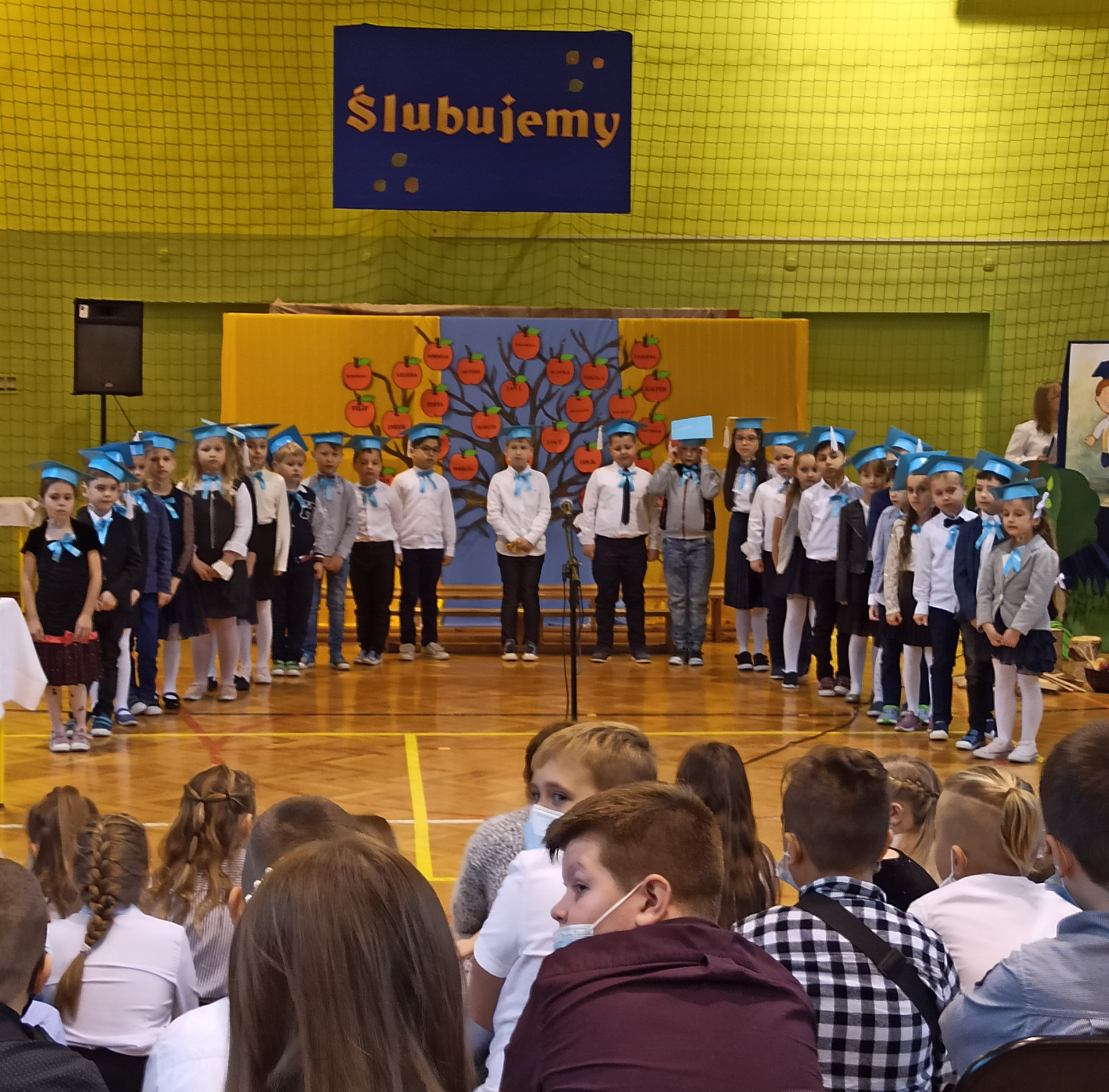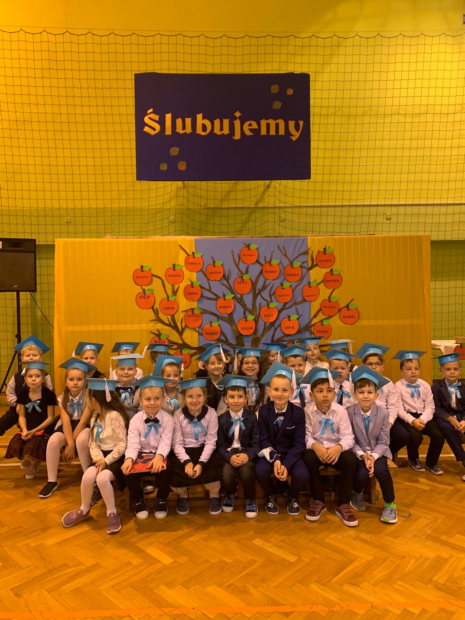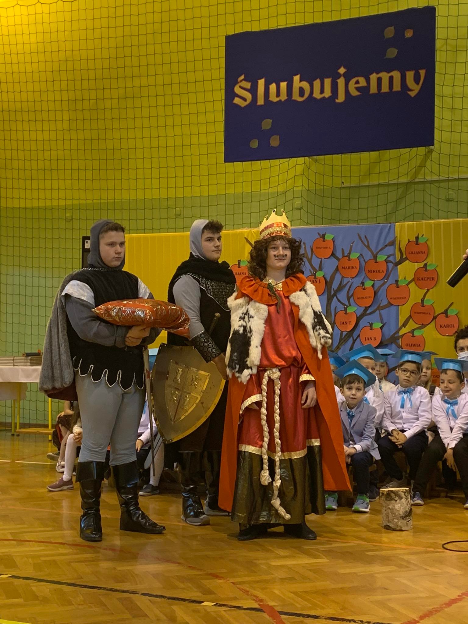 16 listopada obchodziliśmy Święto Szkoły połączone z uroczystym ślubowaniem uczniów klas I, którzy przygotowywali się do tej uroczystości od początku roku szkolnego. Uczyli się tekstów, wierszy, piosenek, wytrwale ćwiczyli występ podczas prób. Uroczystość, w której uczestniczyła cała społeczność szkolna, rozpoczął występ uczniów klasy VIII a. Przedstawili oni inscenizację legendy o powstaniu szkoły w Uszwi, w której pojawiła się postać naszego patrona – króla Władysława Jagiełły. Następnie zaprezentowali się pierwszoklasiści ubrani w tym dniu w odświętne, okolicznościowe stroje. Udowodnili, że wiedzą, jak zachowywać się w szkole, znają zasady ruchu drogowego, umieją tańczyć, śpiewać i liczyć. Podczas występu dzieci wykazały się nie tylko wiedzą i umiejętnościami, ale także pokazały swoje talenty, za co publiczność nagrodziła ich gromkimi brawami. Po części artystycznej nastąpił uroczysty moment ślubowania. W niezwykle podniosłej atmosferze uczniowie klas pierwszych na sztandar szkoły ślubowali być pilnymi, wzorowymi uczniami, należycie wypełniać obowiązki ucznia, pomagać słabszym i młodszym od siebie. Kolejnym punktem uroczystości było pasowanie na ucznia, którego dokonała pani wicedyrektor Lukrecja Chochlińska. Pierwszoklasiści otrzymali także drobne upominki od szkoły i swoich rodziców. Po zakończeniu uroczystości uczniowie wszystkich klas udali się na poczęstunek przygotowany przez Radę Rodziców oraz spotkali się z wychowawcami.