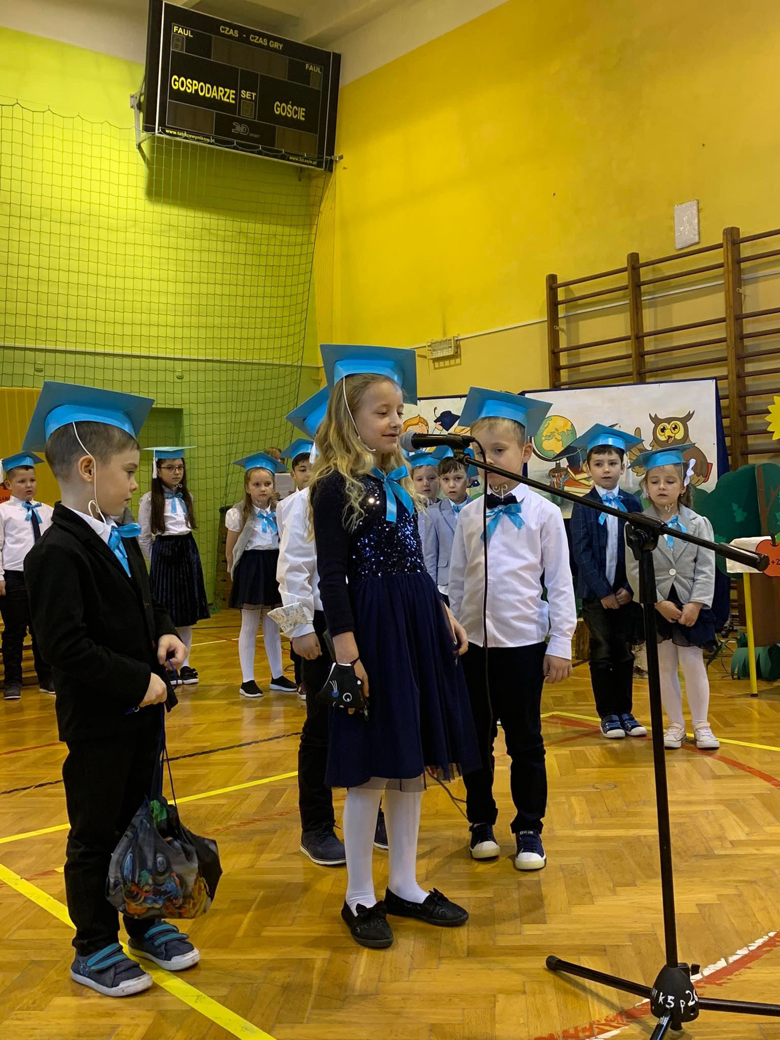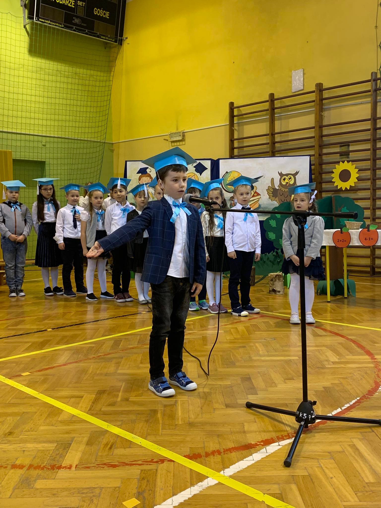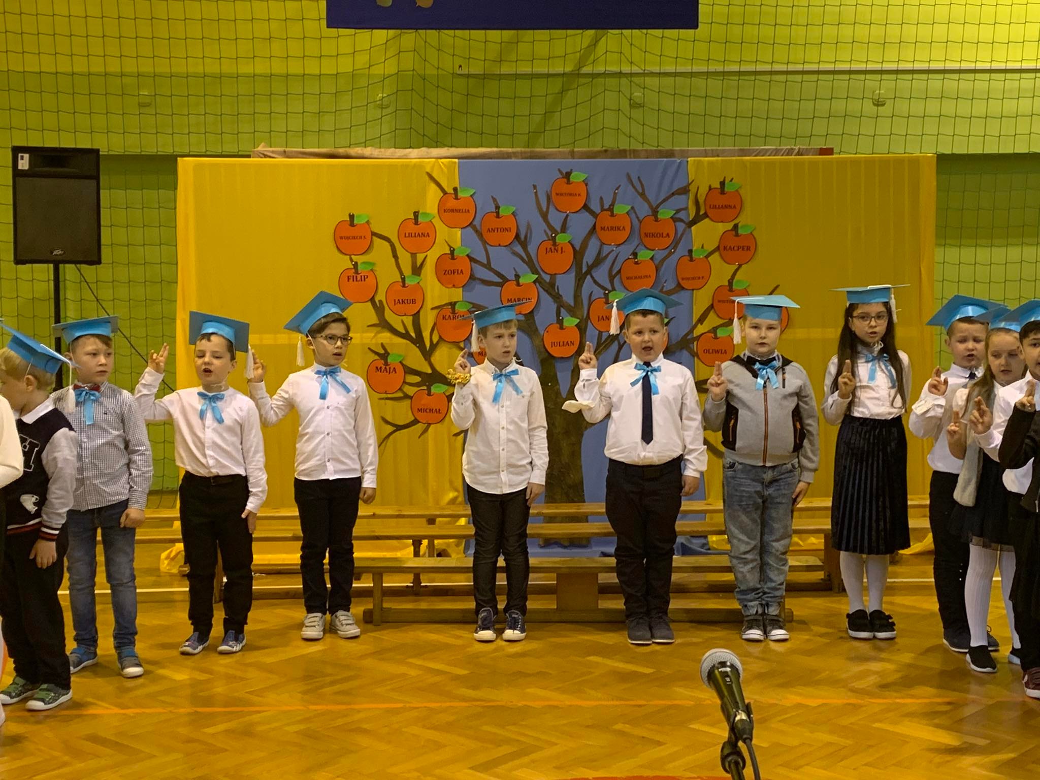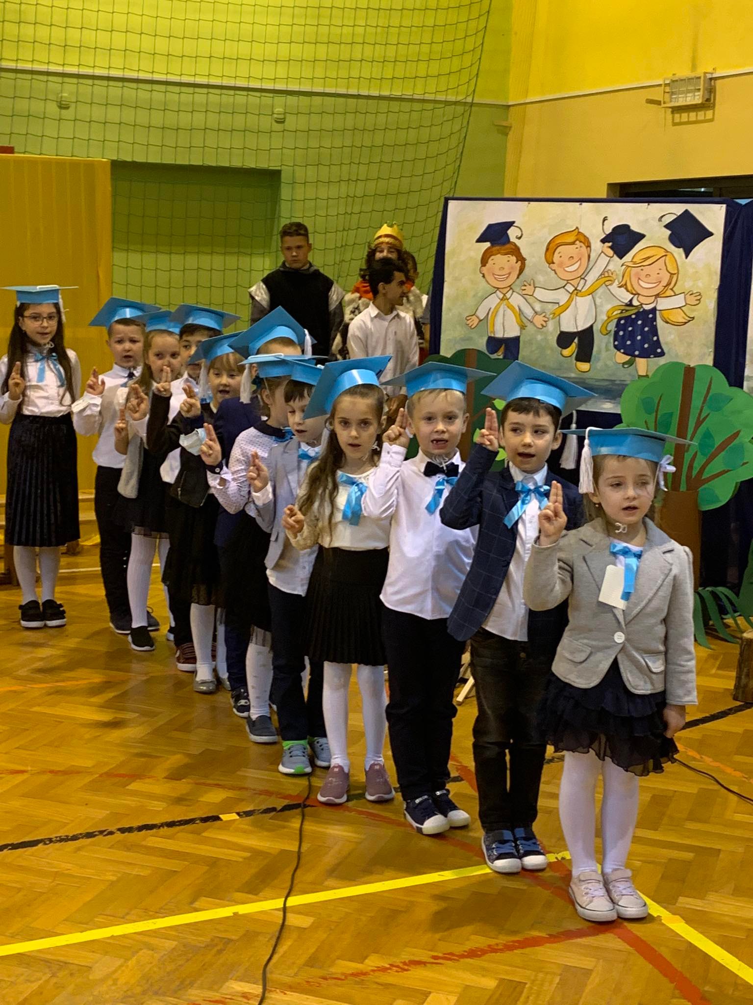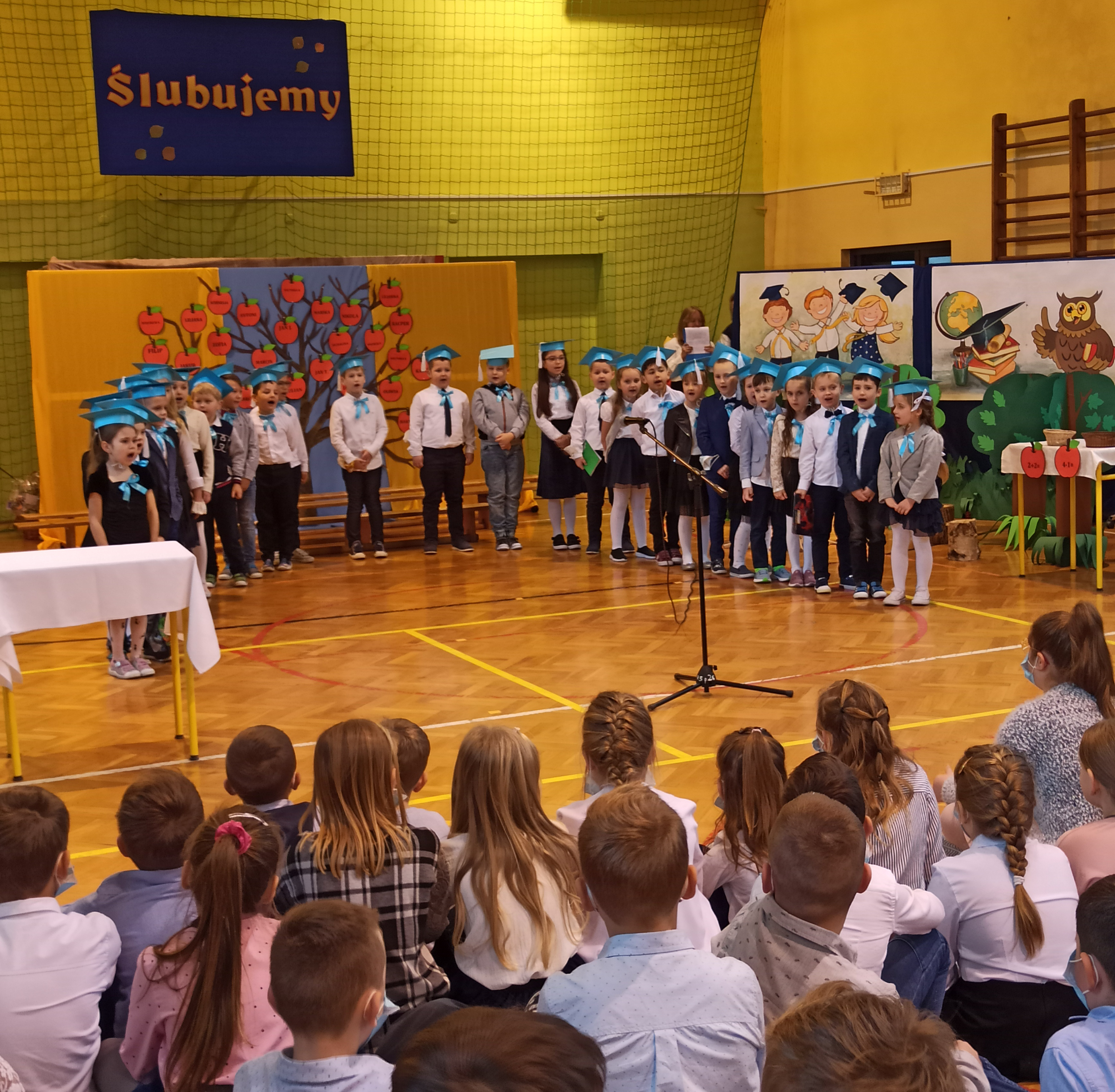 16 listopada obchodziliśmy Święto Szkoły połączone z uroczystym ślubowaniem uczniów klas I, którzy przygotowywali się do tej uroczystości od początku roku szkolnego. Uczyli się tekstów, wierszy, piosenek, wytrwale ćwiczyli występ podczas prób. Uroczystość, w której uczestniczyła cała społeczność szkolna, rozpoczął występ uczniów klasy VIII a. Przedstawili oni inscenizację legendy o powstaniu szkoły w Uszwi, w której pojawiła się postać naszego patrona – króla Władysława Jagiełły. Następnie zaprezentowali się pierwszoklasiści ubrani w tym dniu w odświętne, okolicznościowe stroje. Udowodnili, że wiedzą, jak zachowywać się w szkole, znają zasady ruchu drogowego, umieją tańczyć, śpiewać i liczyć. Podczas występu dzieci wykazały się nie tylko wiedzą i umiejętnościami, ale także pokazały swoje talenty, za co publiczność nagrodziła ich gromkimi brawami. Po części artystycznej nastąpił uroczysty moment ślubowania. W niezwykle podniosłej atmosferze uczniowie klas pierwszych na sztandar szkoły ślubowali być pilnymi, wzorowymi uczniami, należycie wypełniać obowiązki ucznia, pomagać słabszym i młodszym od siebie. Kolejnym punktem uroczystości było pasowanie na ucznia, którego dokonała pani wicedyrektor Lukrecja Chochlińska. Pierwszoklasiści otrzymali także drobne upominki od szkoły i swoich rodziców. Po zakończeniu uroczystości uczniowie wszystkich klas udali się na poczęstunek przygotowany przez Radę Rodziców oraz spotkali się z wychowawcami.