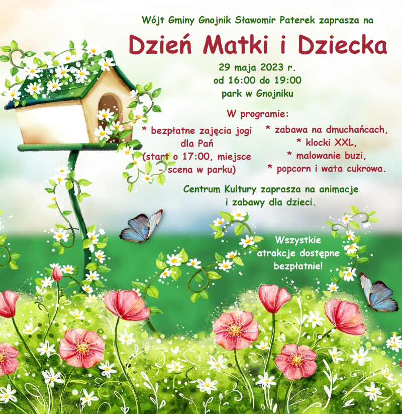 W imieniu Pana Wójta zapraszamy całą społeczność przedszkolną i szkolną na Dzień Matki i Dziecka, który odbędzie się 29 maja br. (poniedziałek) w godz. 16:00 – 19:00 w parku w Gnojniku.