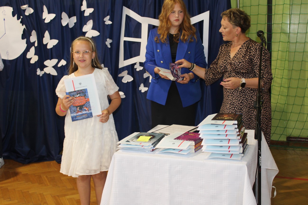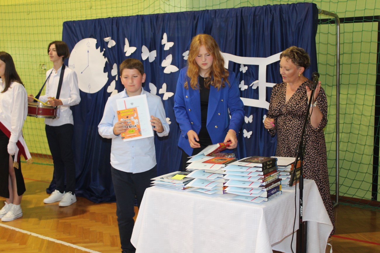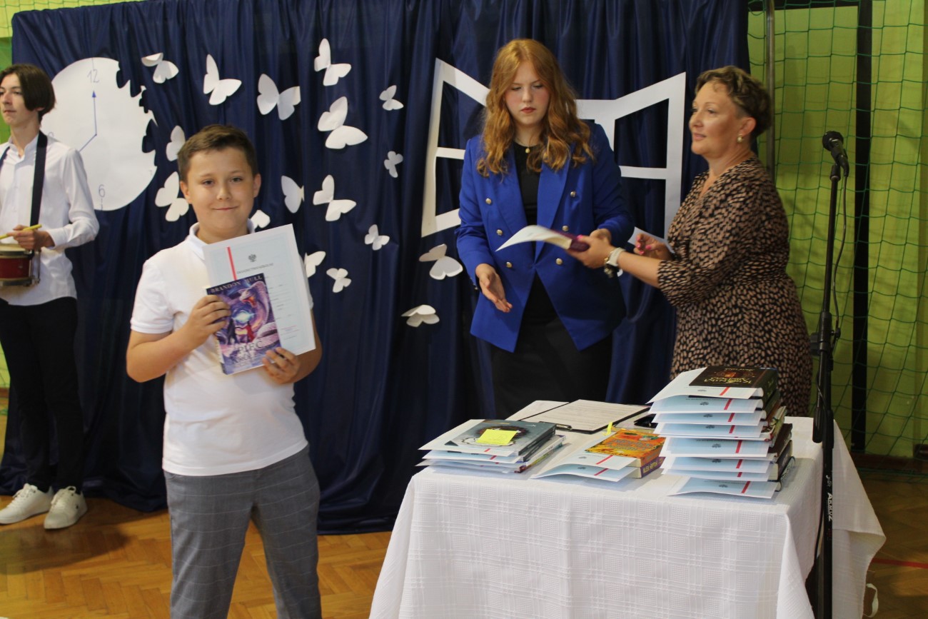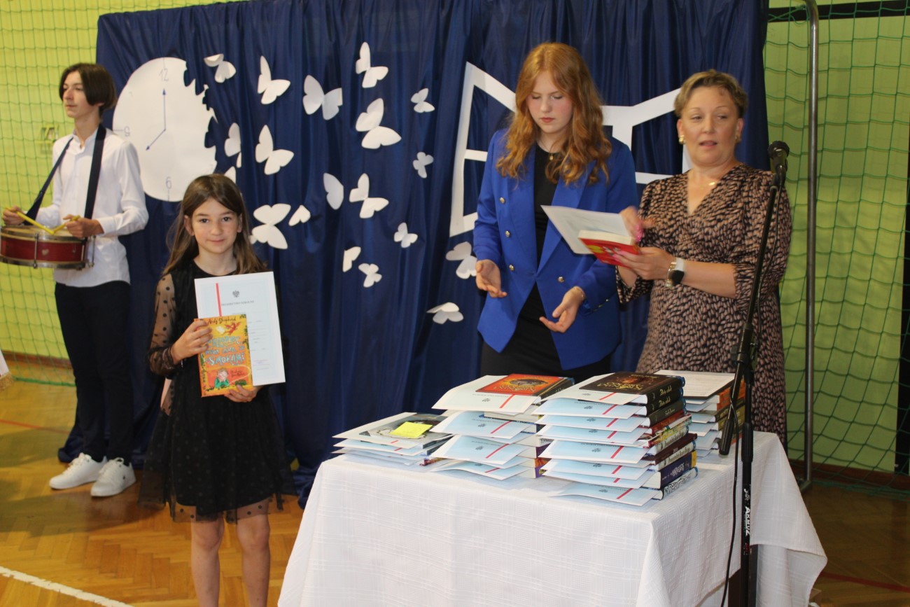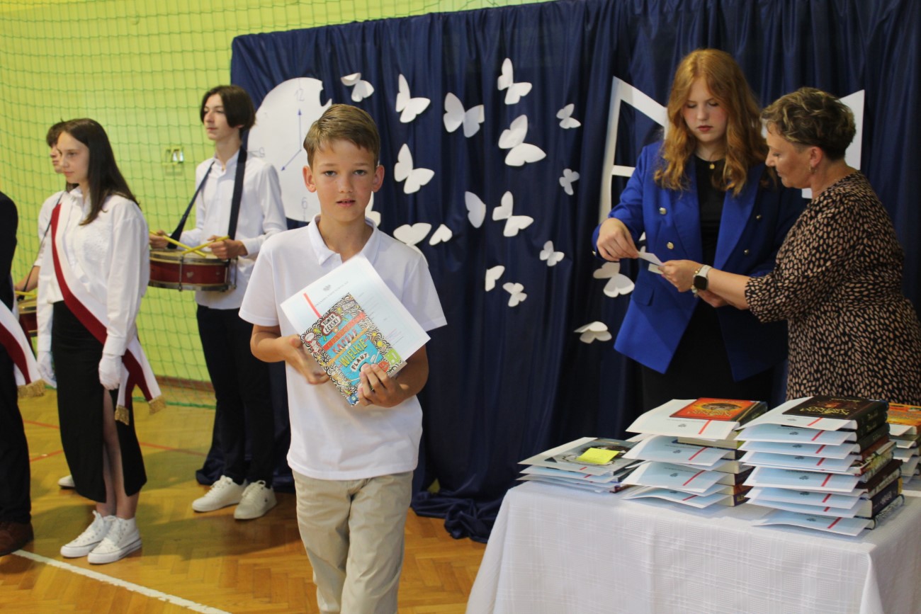 21 czerwca zakończyliśmy rok szkolny 2023/2024. Podczas uroczystej akademii Pani dyrektor podsumowała pracę szkoły oraz wręczyła prymusom świadectwa z wyróżnieniem i nagrody ufundowane przez Radę Rodziców. Tytuł Ucznia Roku 2023/2024 zdobyła Martyna Grzegórzek z kl. V b. Pani dyrektor podziękowała również nauczycielom, pracownikom niepedagogicznym, rodzicom i uczniom za pracę w kończącym się roku szkolnym oraz życzyła udanych, bezpiecznych wakacji. Następnie uczniowie poszczególnych klas spotkali się z wychowawcami.