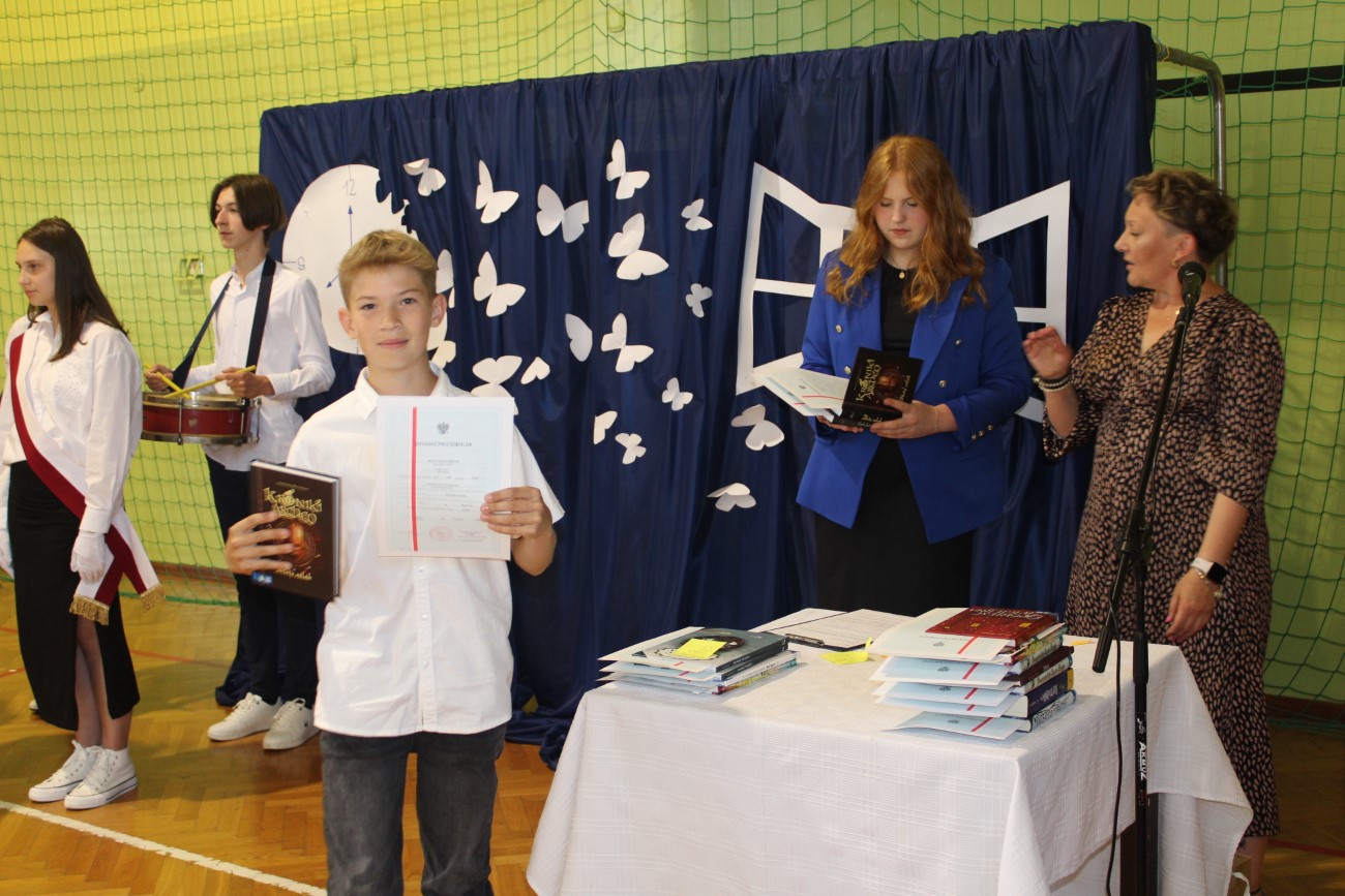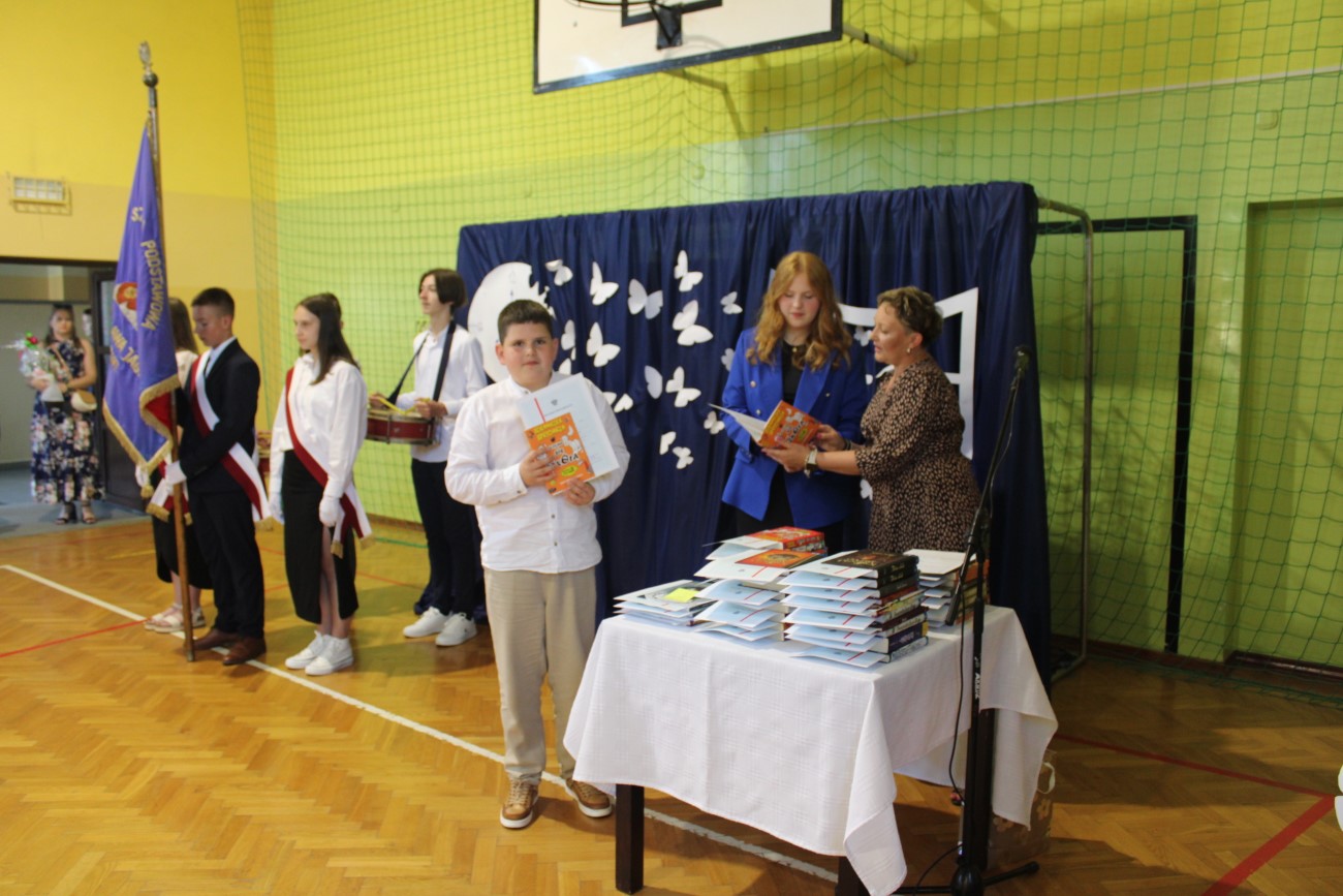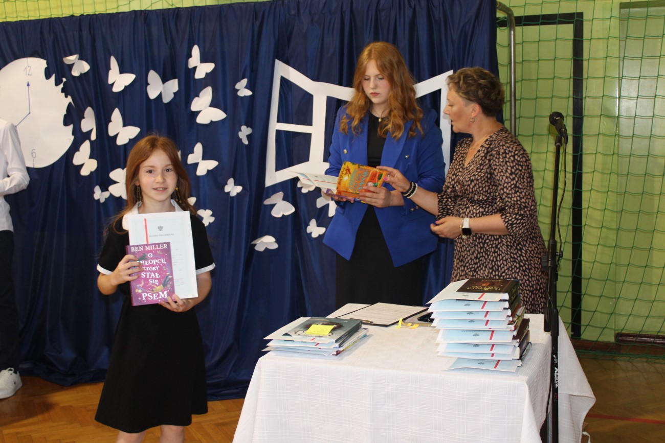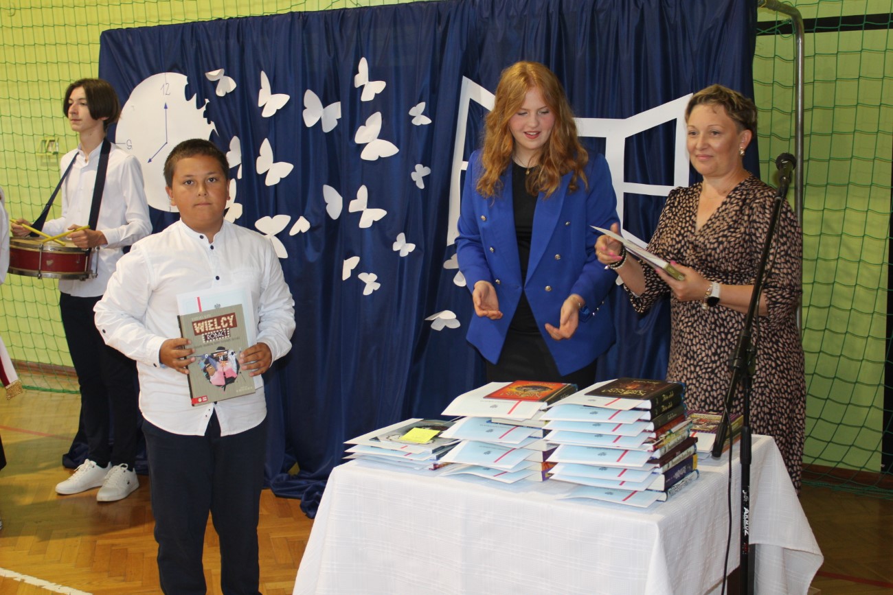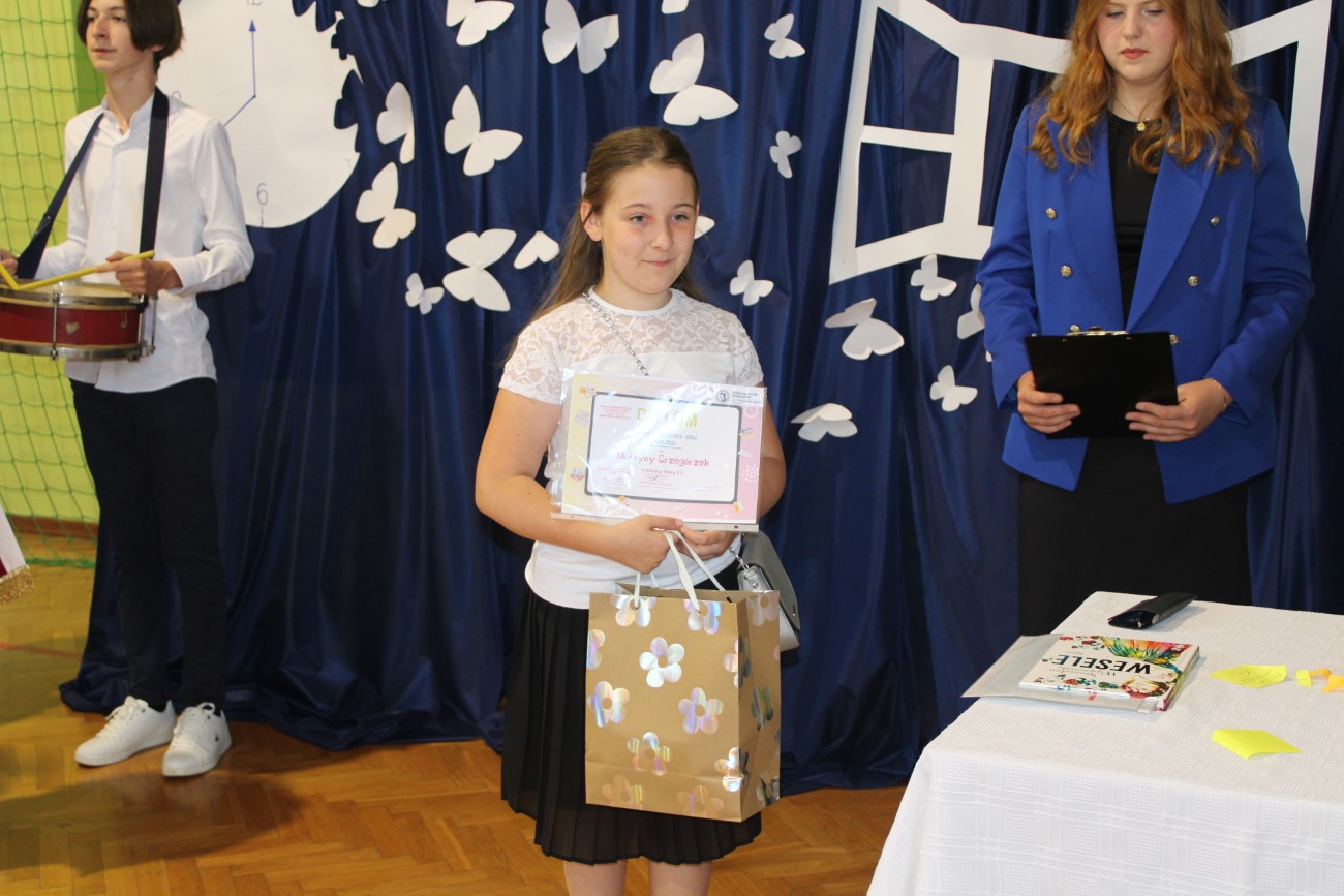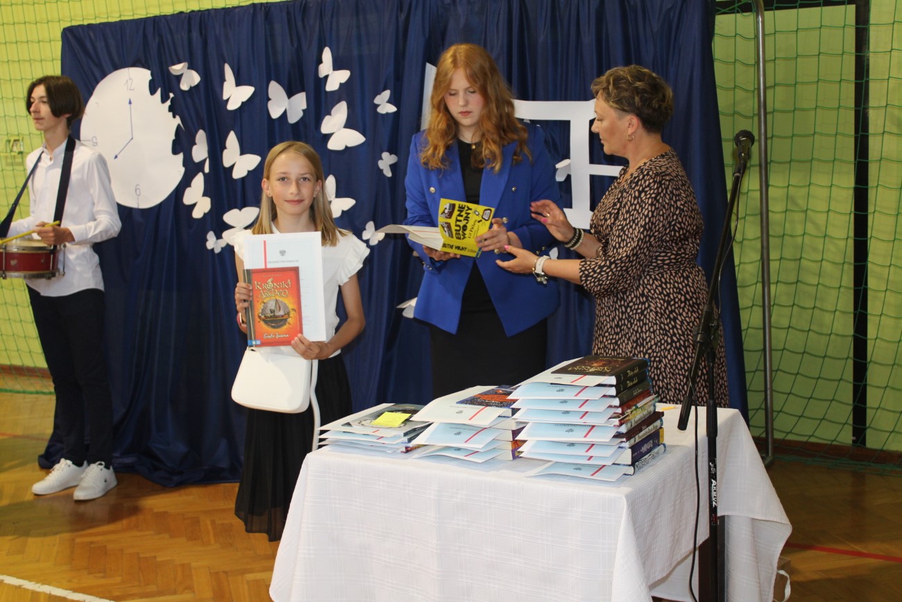 21 czerwca zakończyliśmy rok szkolny 2023/2024. Podczas uroczystej akademii Pani dyrektor podsumowała pracę szkoły oraz wręczyła prymusom świadectwa z wyróżnieniem i nagrody ufundowane przez Radę Rodziców. Tytuł Ucznia Roku 2023/2024 zdobyła Martyna Grzegórzek z kl. V b. Pani dyrektor podziękowała również nauczycielom, pracownikom niepedagogicznym, rodzicom i uczniom za pracę w kończącym się roku szkolnym oraz życzyła udanych, bezpiecznych wakacji. Następnie uczniowie poszczególnych klas spotkali się z wychowawcami.