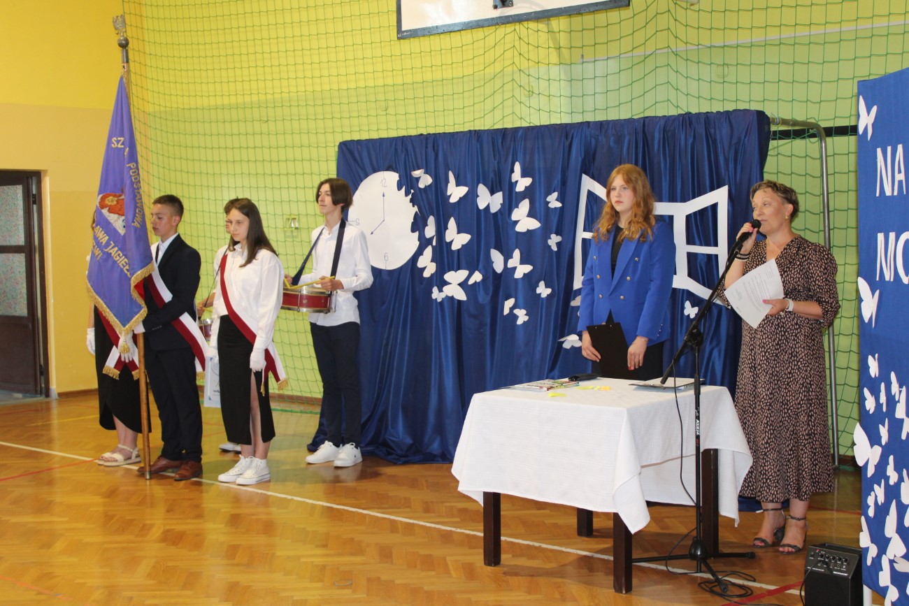 Dnia 20 czerwca pożegnaliśmy uczniów klasy VIII. Podczas uroczystości nastąpiło przekazanie sztandaru szkoły nowemu pocztowi oraz przekazanie władzy wybranemu w czerwcu prezydium Samorządu Szkolnego. Okolicznościowy występ dedykowany ósmoklasistom zaprezentowali uczniowie klasy VII, którzy także wręczyli swoim starszym kolegom upominki. Natomiast przyszli absolwenci pożegnali szkołę na wesoło, przedstawiając kabaretową część artystyczną dotyczącą życia szkoły. Publiczność, w skład której wchodzili rodzice, nauczyciele oraz uczniowie klas młodszych, nagrodziła występujących gromkimi brawami. W tym dniu zostały również wręczone nagrody za stuprocentową frekwencję oraz medale za wybitne osiągnięcia sportowe. Na zakończenie uroczystości, uczniowie klasy VIII podziękowali Pani dyrektor i nauczycielom za ich pracę. Pani dyrektor życzyła ósmoklasistom powodzenia w dalszej edukacji oraz udanych wakacji.
