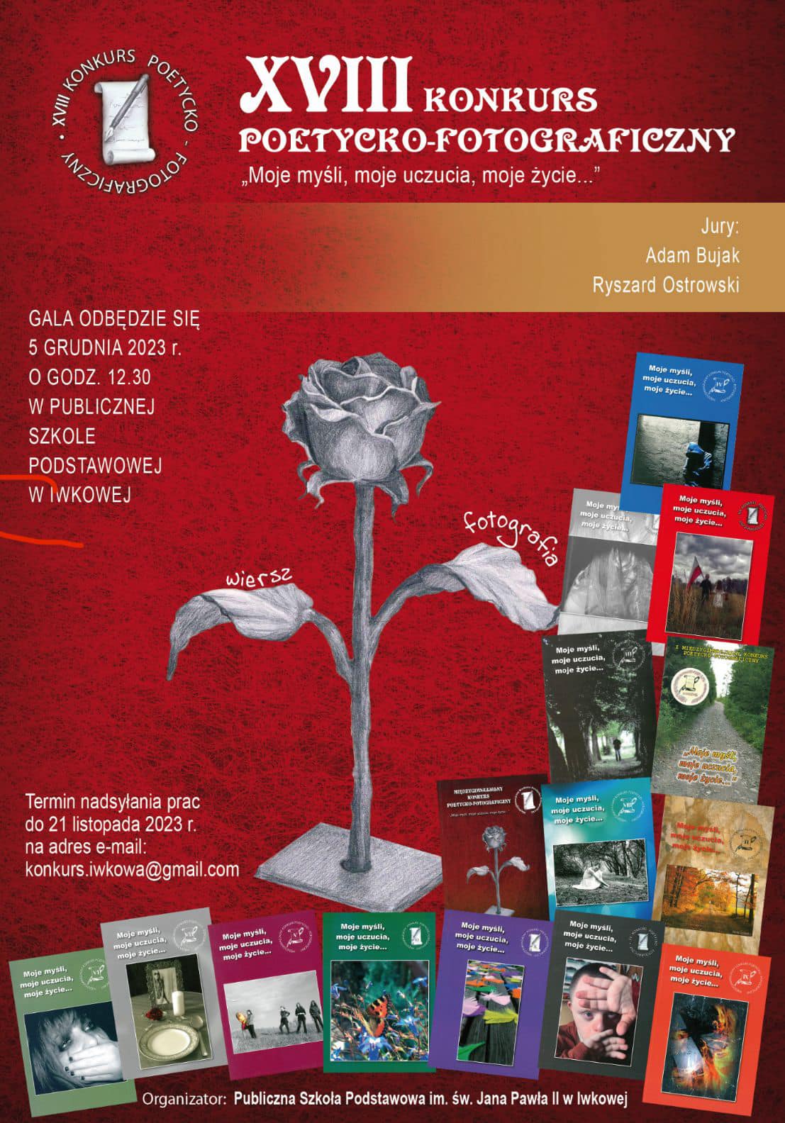 We wtorek 5 grudnia w Szkole Podstawowej im. Jana Pawła II w Iwkowej odbyła się gala podsumowująca XVIII Konkurs Poetycko-Fotograficzny pt. „Moje myśli, moje uczucia, moje życie…”. Z dumą informujemy, że dwoje uczniów naszej szkoły: Aleksandra Rabjasz z klasy VII oraz Arkadiusz Wąs z klasy V, decyzją jury otrzymało wyróżnienia w tym konkursie.