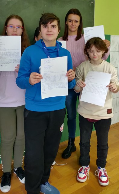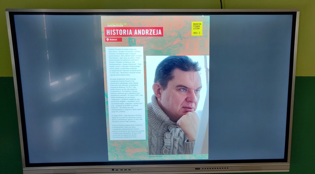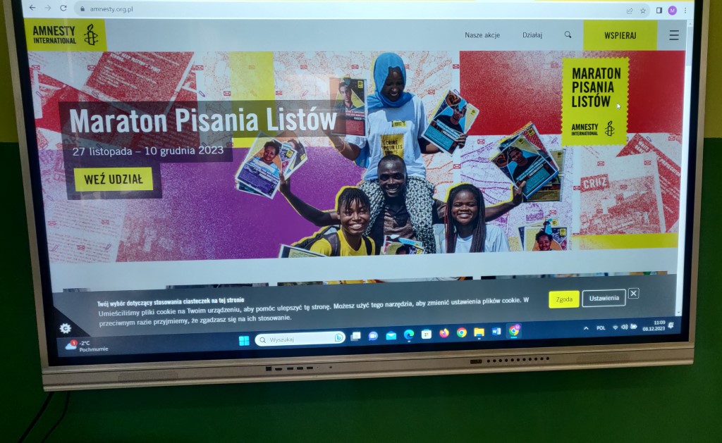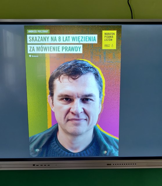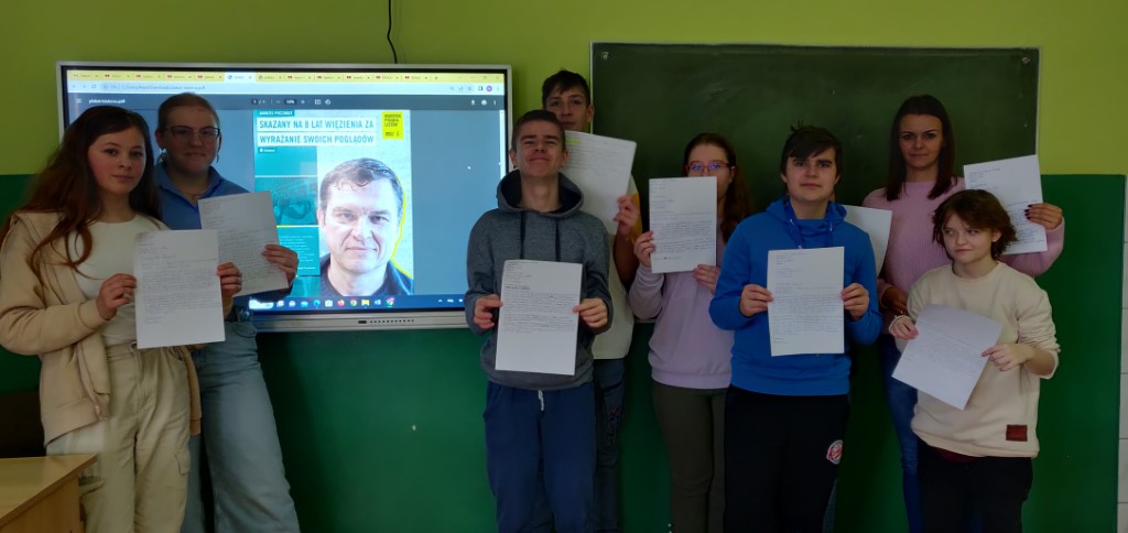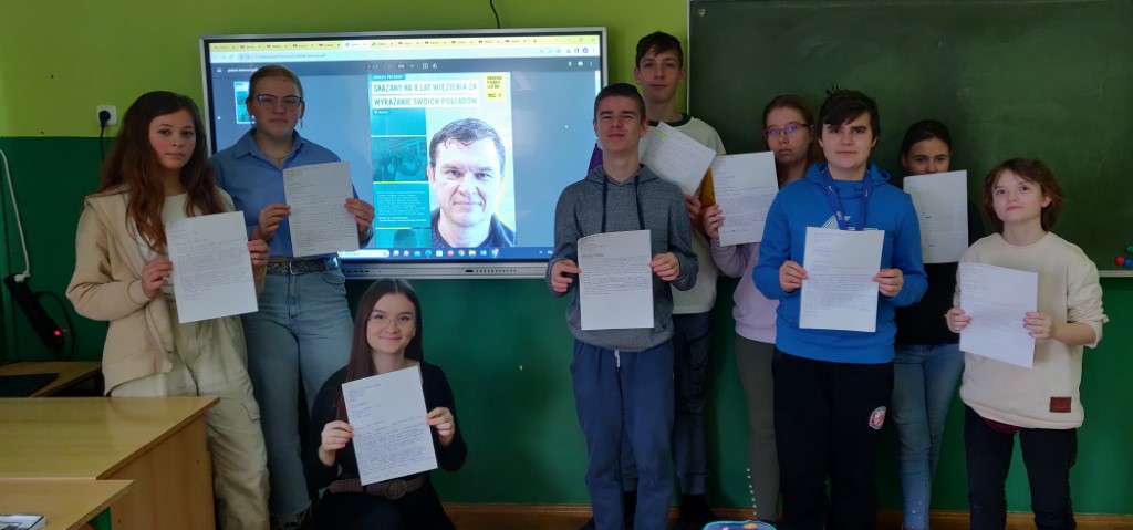 8 grudnia uczniowie klasy VIII wraz ze swoją wychowawczynią uczestniczyli w Maratonie Pisania Listów, największej światowej akcji na rzecz praw człowieka organizowanej przez Amnesty International. Co roku z okazji Międzynarodowego Dnia Praw Człowieka (10 grudnia) ludzie na całym świecie jednoczą siły, żeby upomnieć się o konkretne osoby, których prawa są łamane. Piszą listy do decydentów, którzy mają realny wpływ na ich los. Wśród tegorocznych bohaterów akcji są osoby, które zostały niesłusznie skazane, doświadczyły tortur, pozbawiono je kontaktu z rodziną, przebywają w więzieniach tylko dlatego, że działały w słusznej sprawie. Uczniowie napisali listy skierowane do władz Białorusi z żądaniem zmiany sytuacji represjonowanej osoby, jaką jest Andrzej Poczobut- dziennikarz z Białorusi, który uprawiając swój zawód naraził się prezydentowi Łukaszence. Za krytykę białoruskiego reżimu został skazany na 8 lat więzienia w kolonii karnej o zaostrzonym rygorze.