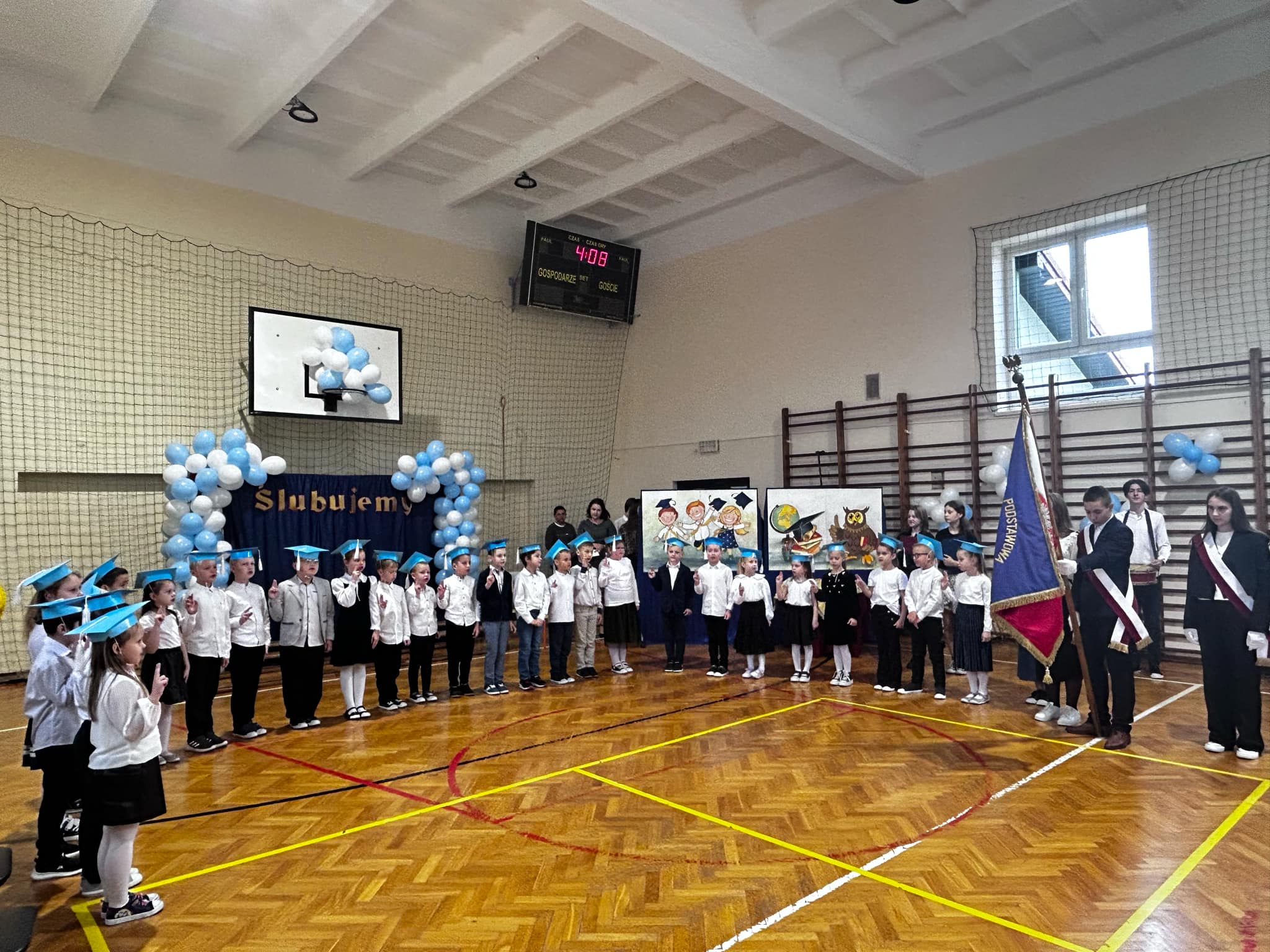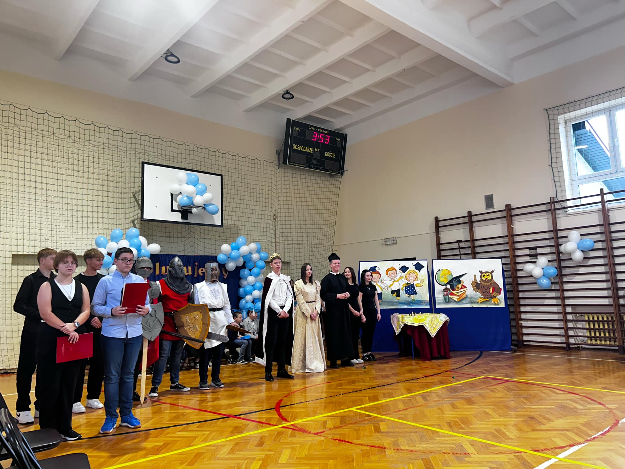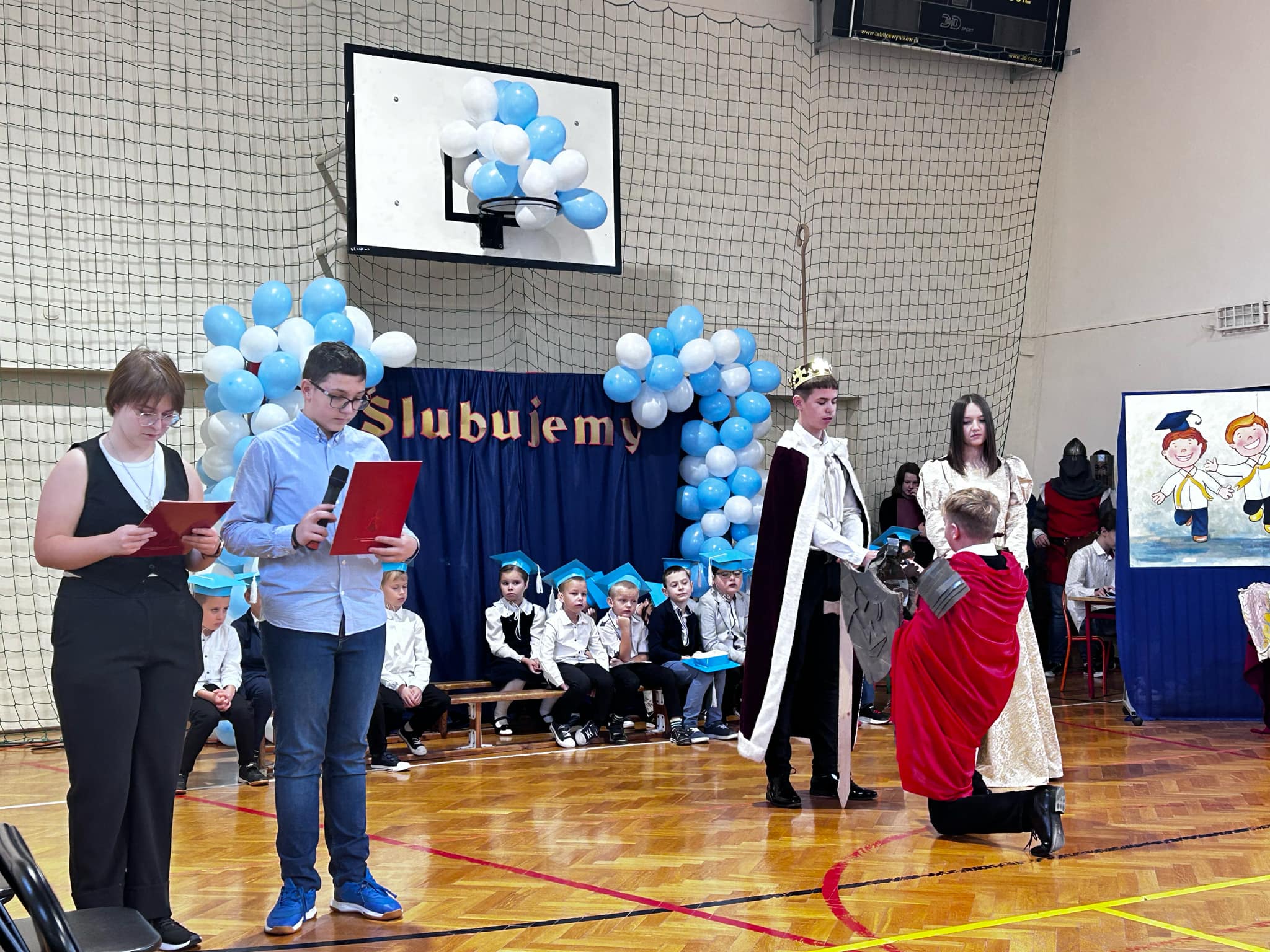 Dnia 14 listopada 2024 r. w naszej szkole obchodziliśmy Święto Szkoły, podczas którego odbyło się ślubowanie pierwszoklasistów W tym szczególnym dniu najmłodsi uczniowie oficjalnie stali się pełnoprawnymi członkami społeczności szkolnej. Uroczystość rozpoczęła się od występu przygotowanego przez uczniów klasy VIII, którzy przedstawili scenkę z życia patrona szkoły – Władysława Jagiełły. Następnie pierwszoklasiści ubrani w odświętne stroje zaprezentowali swoje umiejętności recytatorskie, taneczne i wokalne. Ich występ przeplatały tańce w wykonaniu szkolnych cheerleaderek. Głównym punktem programu było uroczyste ślubowanie. Pierwszoklasiści obiecali być pilnymi uczniami, szanować szkołę, dbać o jej tradycje oraz przestrzegać zasad. Po ceremonii otrzymali oni pamiątkowe dyplomy i symboliczne upominki. W uroczystości wzięli także udział rodzice uczniów klas pierwszych, którzy z dumą i wzruszeniem oglądali występy swoich pociech. To ważne wydarzenie na stałe zapisze się w pamięci pierwszoklasistów i ich bliskich jako początek nowej drogi edukacyjnej. Uroczystość ślubowania to nie tylko symboliczne włączenie nowych uczniów do społeczności szkolnej, ale także moment, kiedy uczą się oni odpowiedzialności, szacunku do tradycji i wartości, które będą towarzyszyć im przez cały okres nauki w szkole.