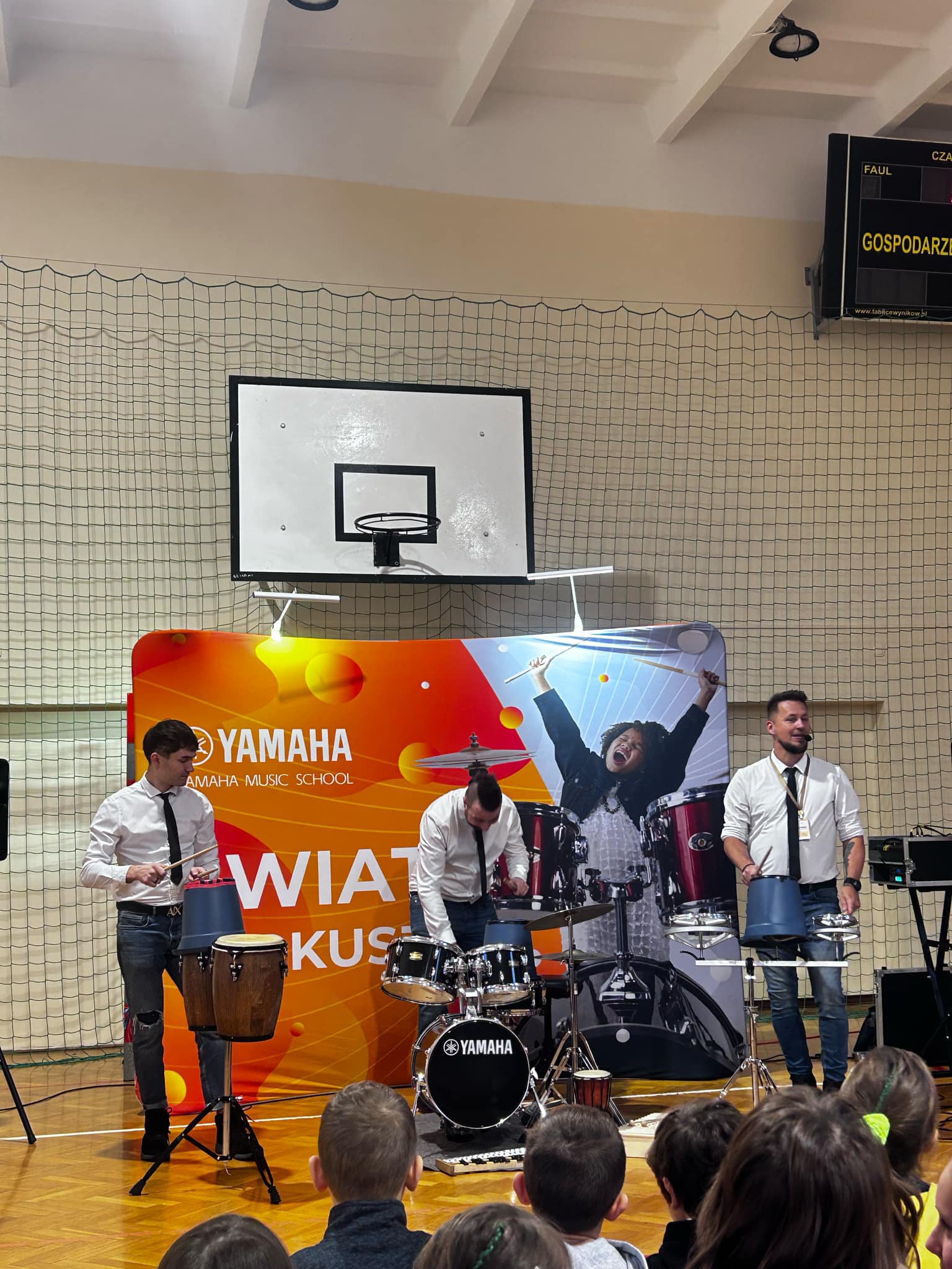 Dnia 13 stycznia uczestniczyliśmy w koncercie „Świat perkusji” w wykonaniu artystów z Yamaha Music School. Muzycy zaprezentowali różne instrumenty perkusyjne, m. in. djembe, dzwonki chromatyczne, ksylofon, perkusję elektroniczną i nawiązali bardzo dobry kontakt z publicznością. Uczniowie mieli okazję posłuchać brzmienia instrumentów, zagrać, zaśpiewać, a nawet wykonać afrykański taniec. Spotkanie upłynęło w radosnej atmosferze i już czekamy na kolejne.