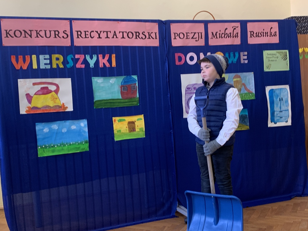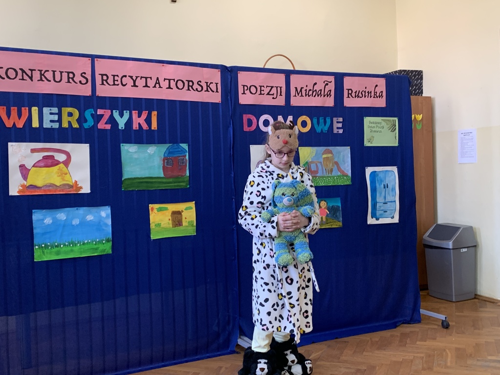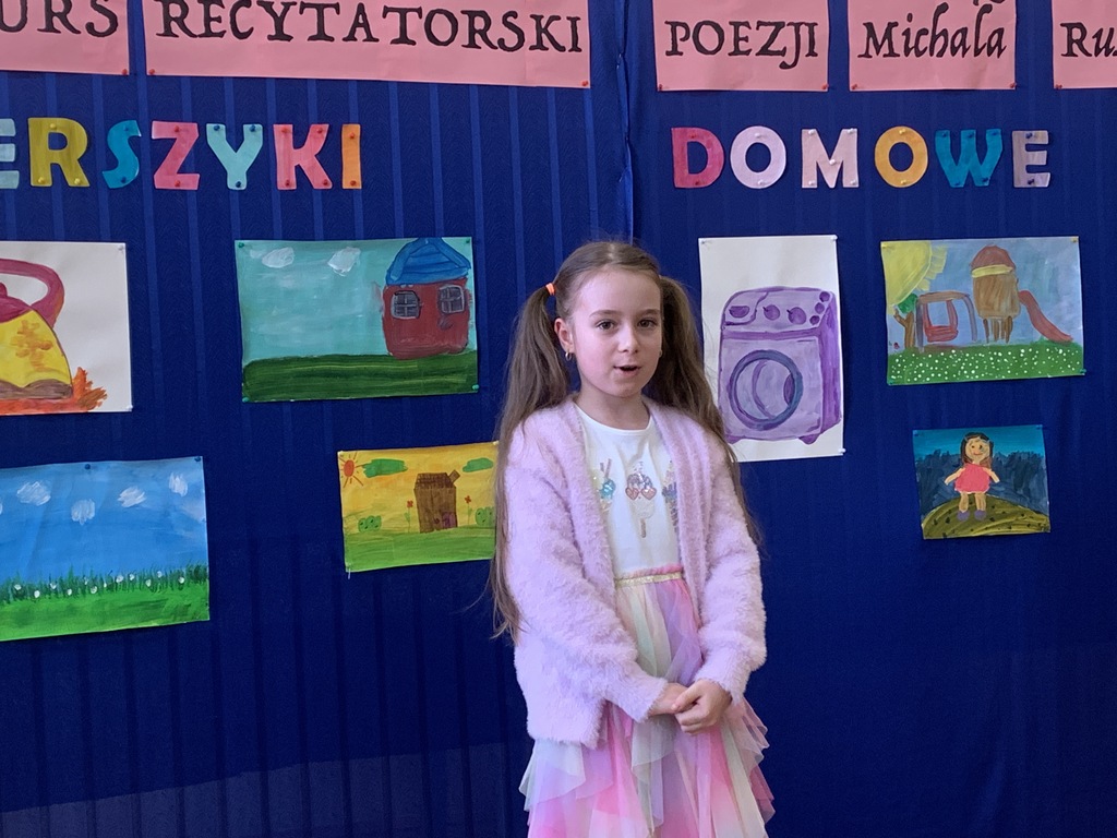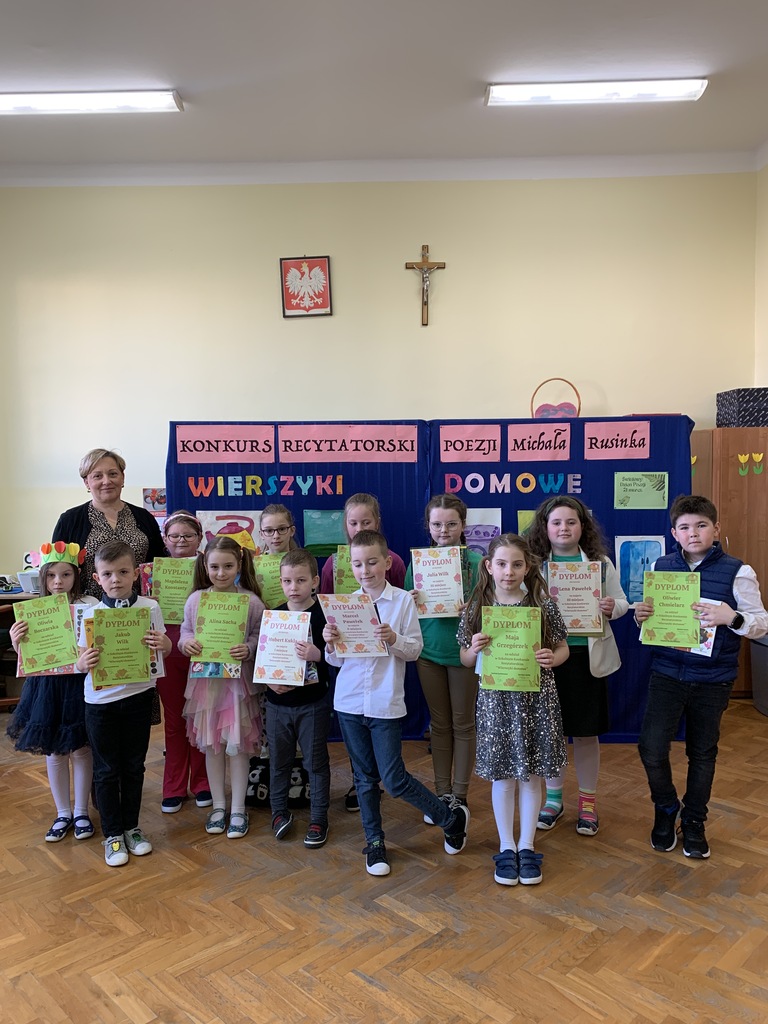 21 marca 2025r. obchodziliśmy Światowy Dzień Poezji, z tej okazji w naszej szkole odbył się Konkurs Recytatorski Poezji Michała Rusinka. Wzięły w nim udział dzieci z klas I-III. Recytowały wiersze z serii "Wierszyki domowe". Były więc wiersze o misiu, łopacie do śniegu, pralce, tosterze czy progu. Komisja konkursowa, pod przewodnictwem pani dyrektor Lukrecji Chochlińskiej, po przeliczeniu punktów przyznała:
