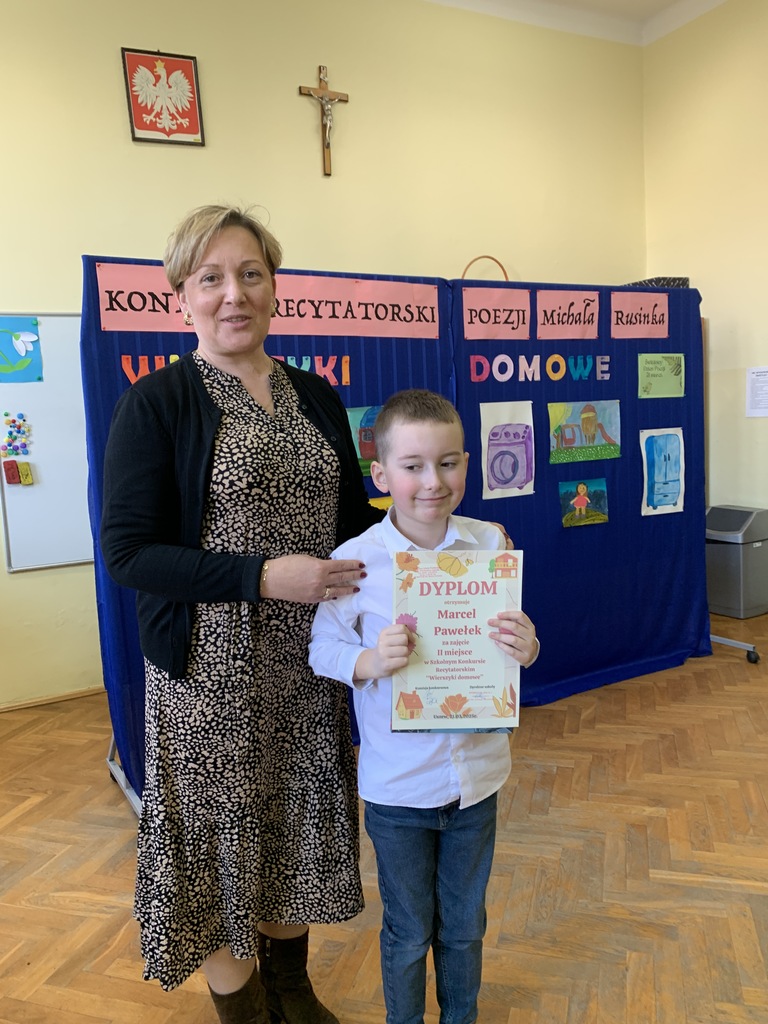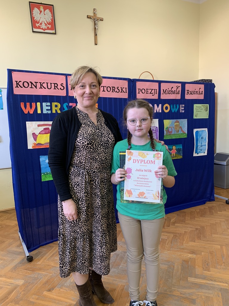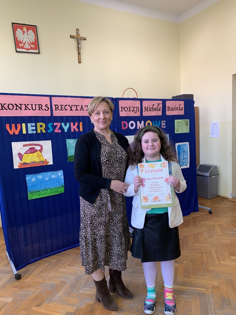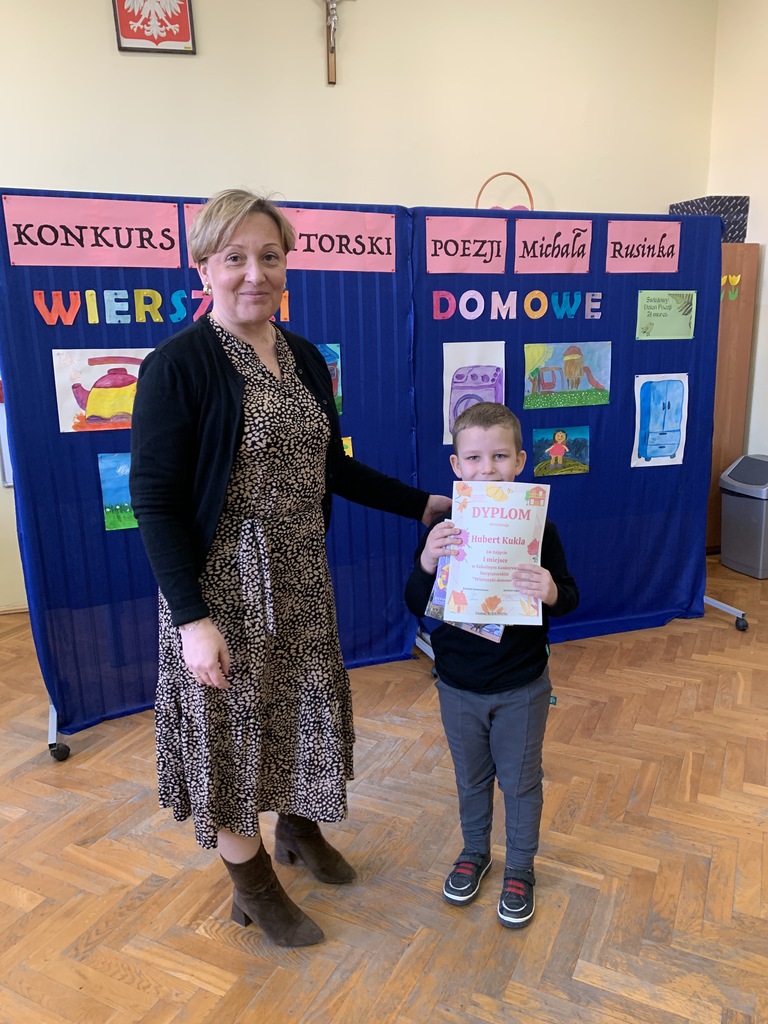 21 marca 2025r. obchodziliśmy Światowy Dzień Poezji, z tej okazji w naszej szkole odbył się Konkurs Recytatorski Poezji Michała Rusinka. Wzięły w nim udział dzieci z klas I-III. Recytowały wiersze z serii "Wierszyki domowe". Były więc wiersze o misiu, łopacie do śniegu, pralce, tosterze czy progu. Komisja konkursowa, pod przewodnictwem pani dyrektor Lukrecji Chochlińskiej, po przeliczeniu punktów przyznała: