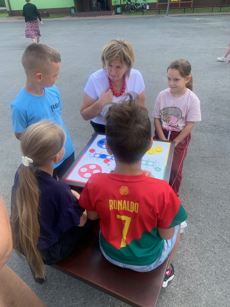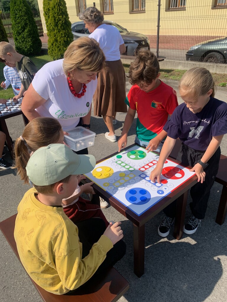Zabawom uczniów klas I–III towarzyszyli zaproszeni goście. Swoją obecnością zaszczyciła nas Pani Kamila Bielak przedstawicielka głównego sponsora projektu – CRS CANPACK, Panie z Koła Gospodyń Wiejskich Uszwianki oraz Rodzice. Dzieci poznały gry i zabawy swoich babć i dziadków i mogły doświadczyć emocji podczas gry w kapsle, w klasy czy w chińczyka oraz posłuchać opowiadań na temat spędzania czasu wolnego w dzieciństwie swoich przodków.