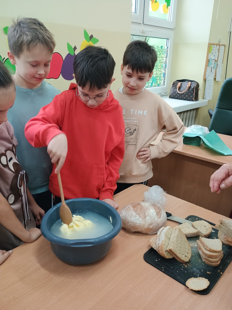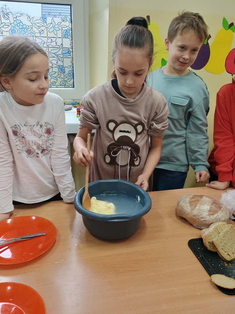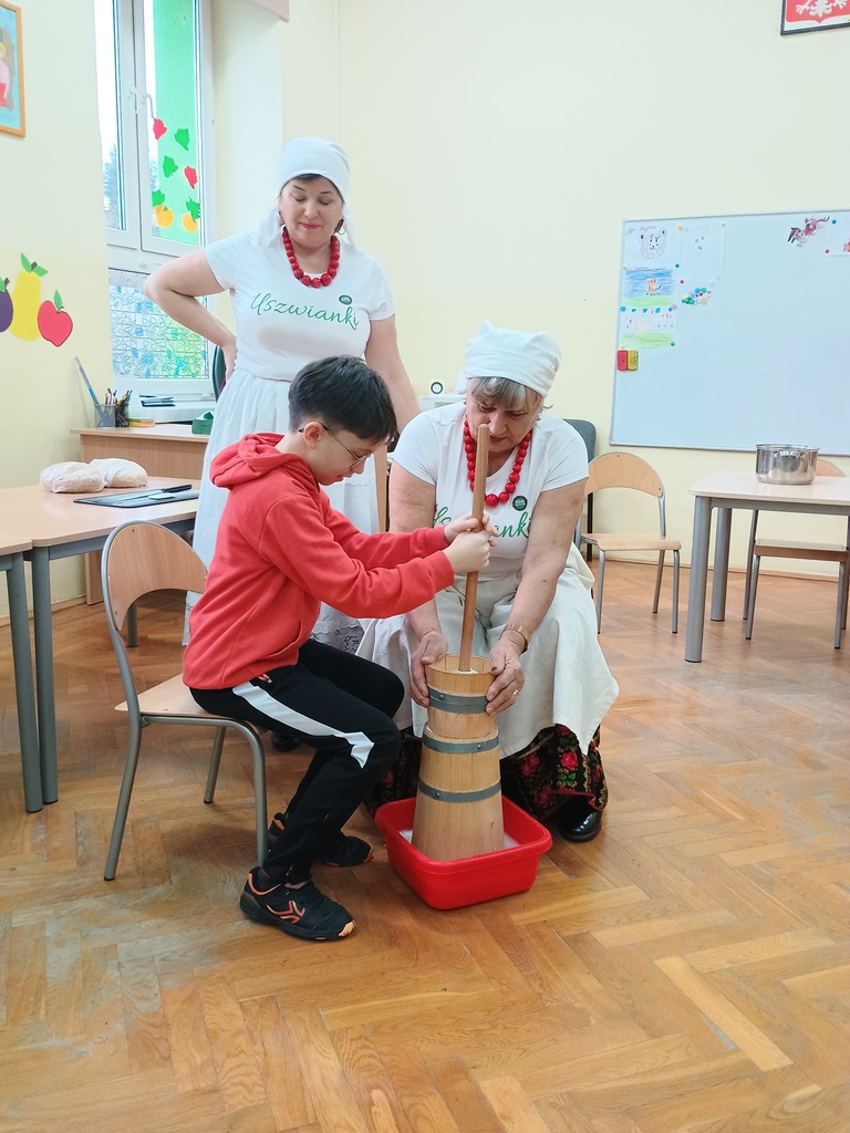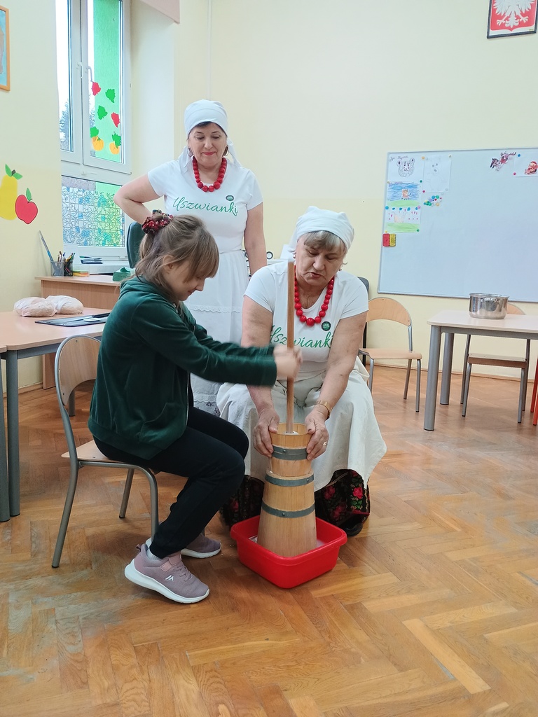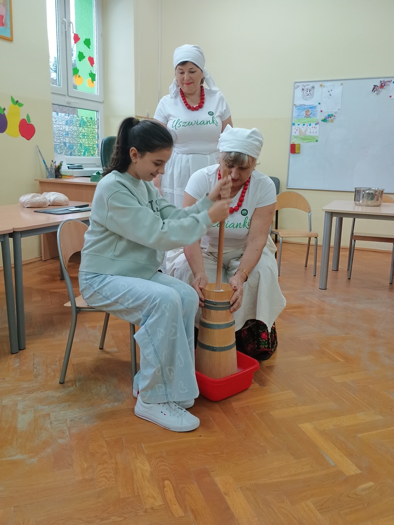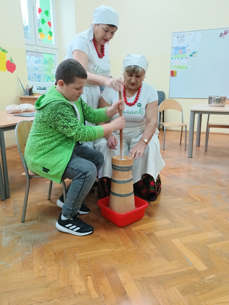 W dniu 28 listopada uczniowie klasy IV a pod kierunkiem Pań z Koła Gospodyń Wiejskich Uszwianki uczestniczyli w warsztatach ręcznego wytwarzania masła w maselnicy zwanej w naszym rejonie maśniczką. Panie opowiedziały, jak zbudowane jest to tradycyjne narzędzie kuchenne i jak przebiega proces wyrabiania masła. Następnie każdy uczestnik warsztatów mógł własnoręcznie doświadczyć robienia tego domowego specjału. Najprzyjemniejszym punktem spotkania była degustacja wytworzonego masła ze świeżym chlebem.