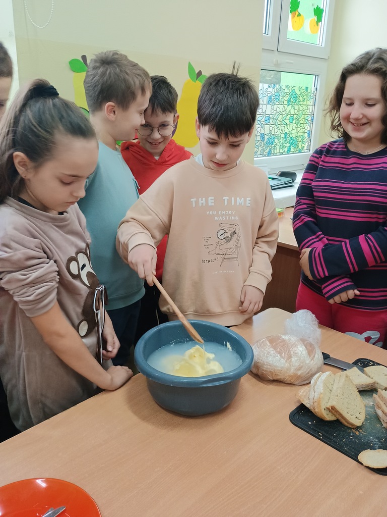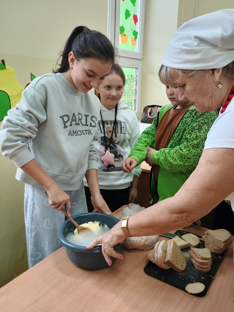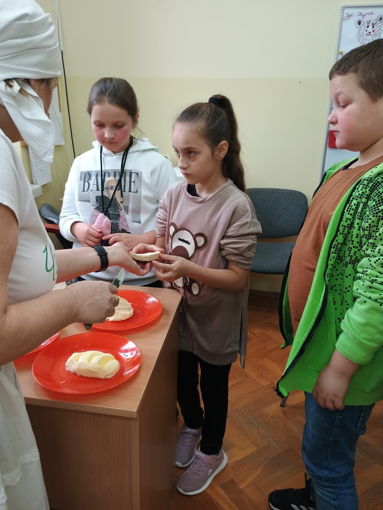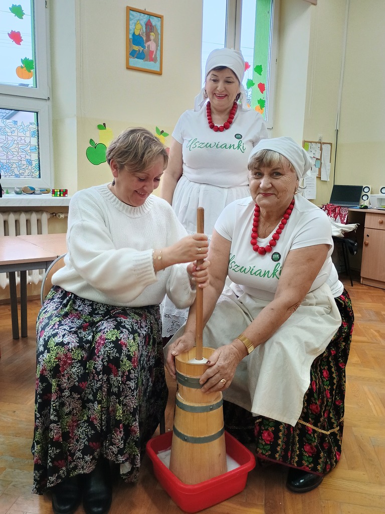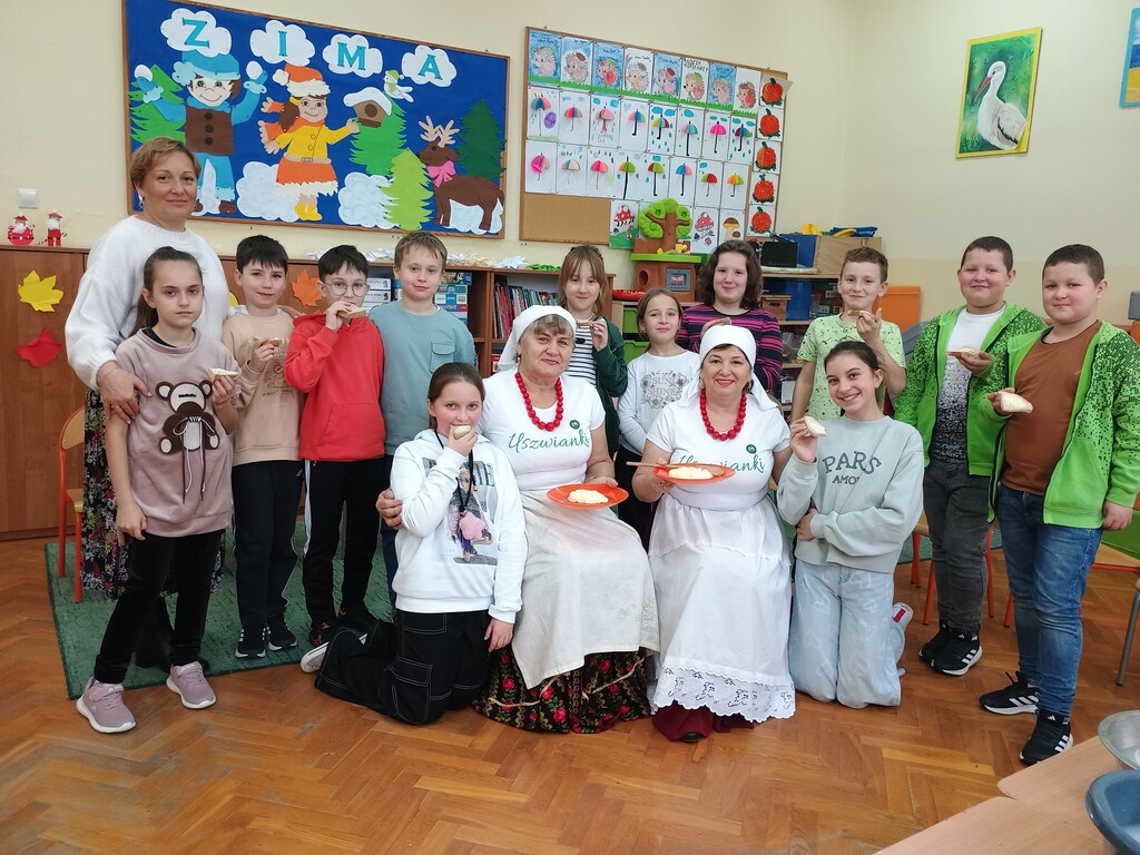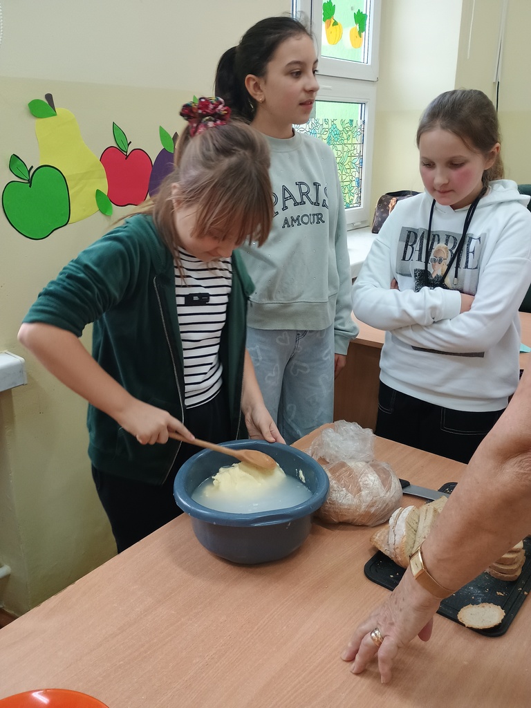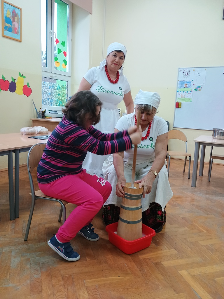 W dniu 28 listopada uczniowie klasy IV a pod kierunkiem Pań z Koła Gospodyń Wiejskich Uszwianki uczestniczyli w warsztatach ręcznego wytwarzania masła w maselnicy zwanej w naszym rejonie maśniczką. Panie opowiedziały, jak zbudowane jest to tradycyjne narzędzie kuchenne i jak przebiega proces wyrabiania masła. Następnie każdy uczestnik warsztatów mógł własnoręcznie doświadczyć robienia tego domowego specjału. Najprzyjemniejszym punktem spotkania była degustacja wytworzonego masła ze świeżym chlebem.