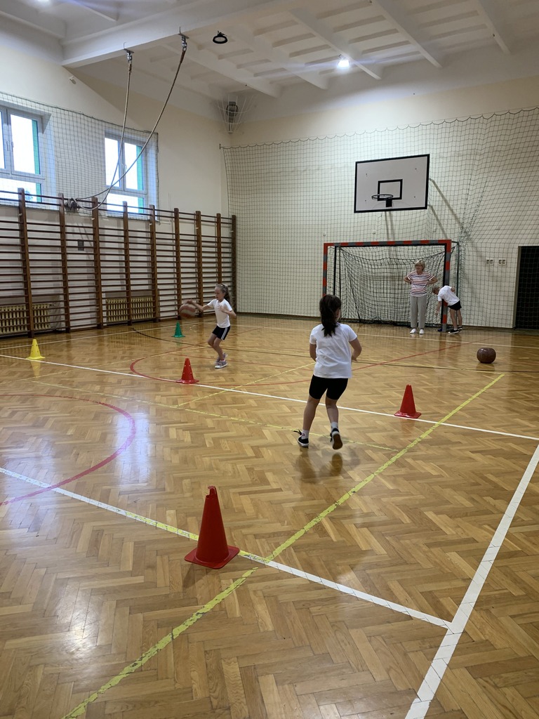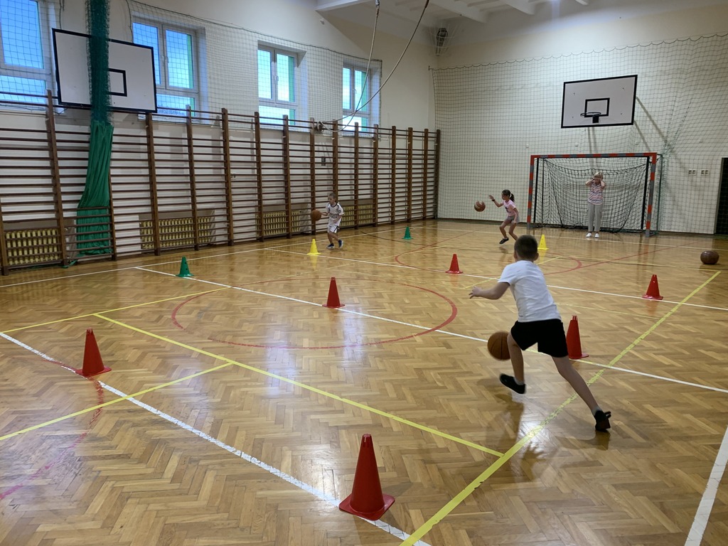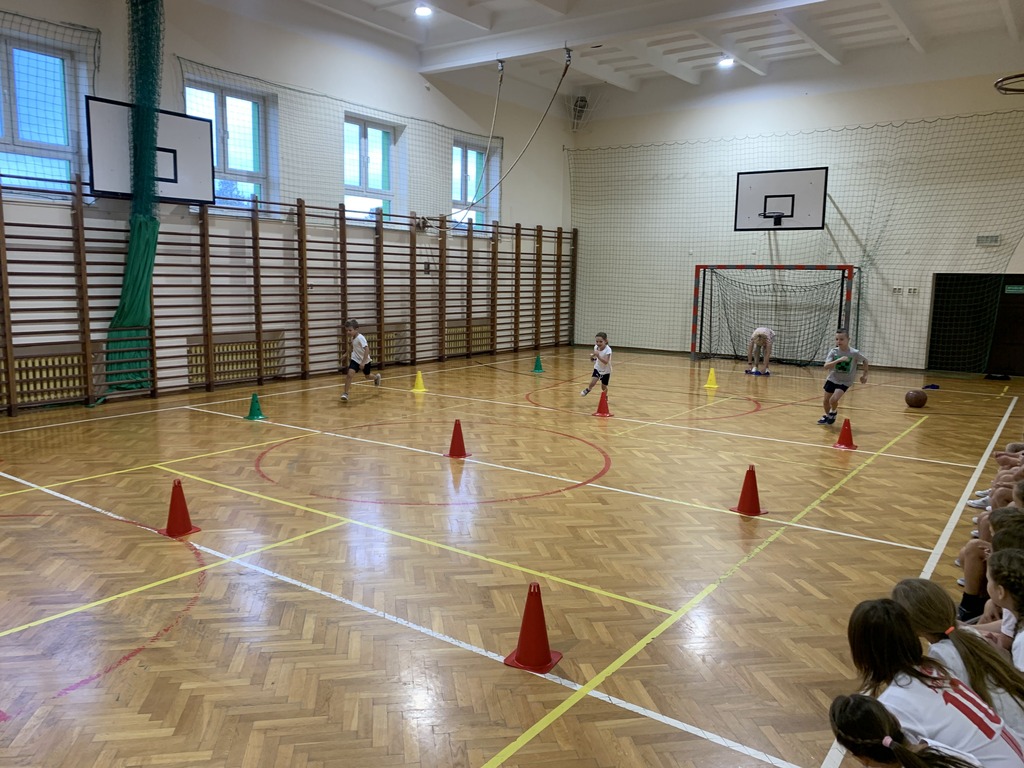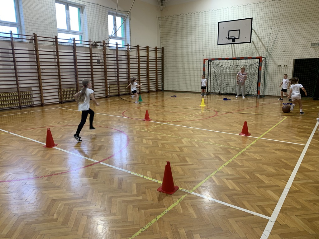 Dzieci z klas młodszych rywalizowały w kozłowaniu piłki między pachołkami, biegach z omijaniem przeszkód oraz prowadzeniu piłki kijem do unihokeja. Ponadto uczniowie doskonalili koordynację wzrokowo-ruchową grając w badmintona, łapiąc piłeczki do koszyczków, kręcąc hula-hopem oraz grając w „zbijanego”. Ćwiczyli również odbicia piłki sposobem górnym oraz rzuty do kosza.