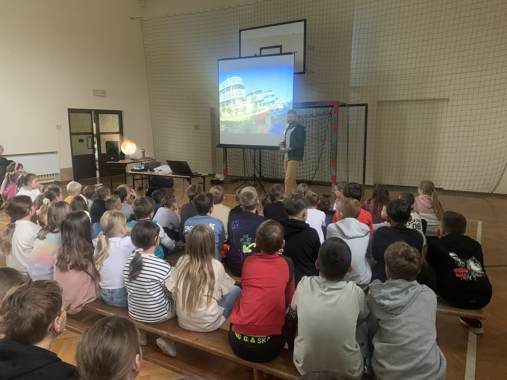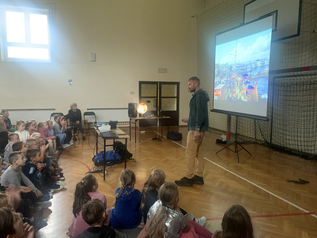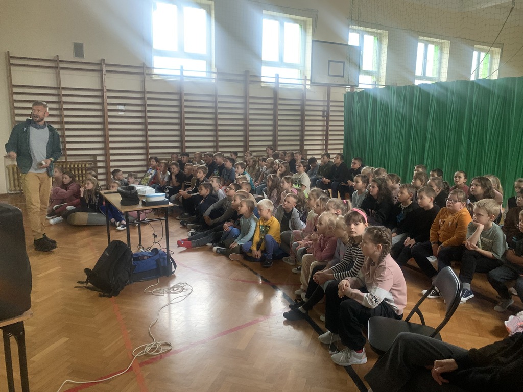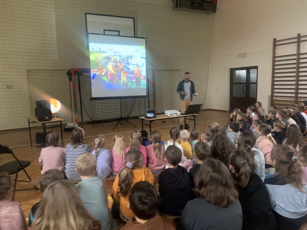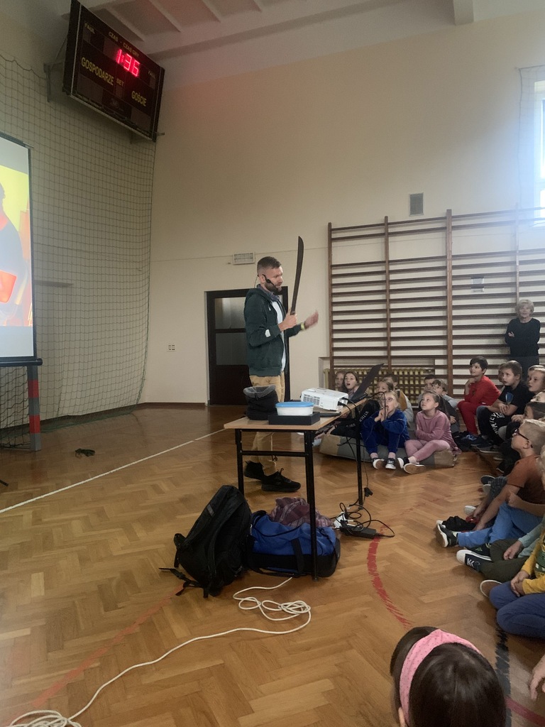 W piątek, 4 października, dzieci miały okazję posłuchać fascynujących opowieści o Amazonii. W naszej szkole gościł podróżnik z grupy "Trzask", który dzielił się własnymi doświadczeniami z pobytu w brazylijskiej dżungli. Opowiadał uczniom o życiu Indian, przedstawiał zdjęcia żyjących tam fascynujących zwierząt, a na koniec zademonstrował kilka rekwizytów, które przywiózł ze swojej dalekiej wyprawy. Dzieci słuchały z wielkim zainteresowaniem.