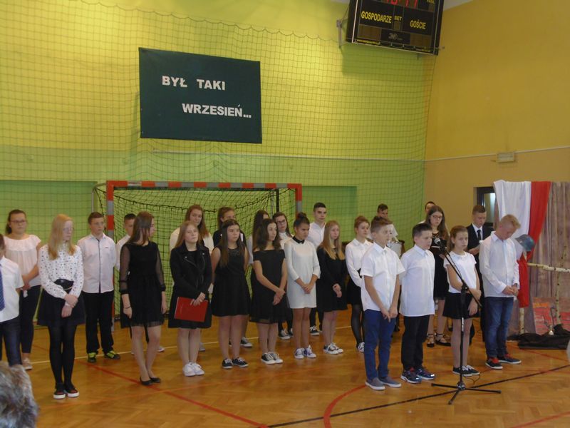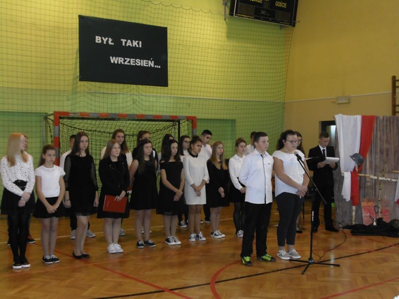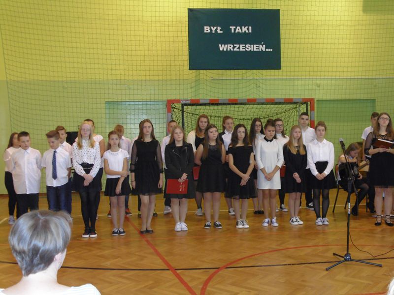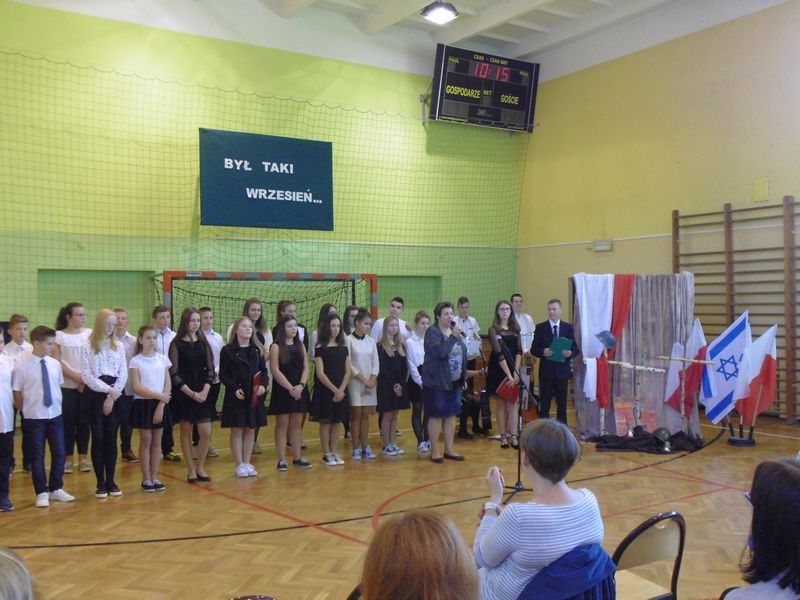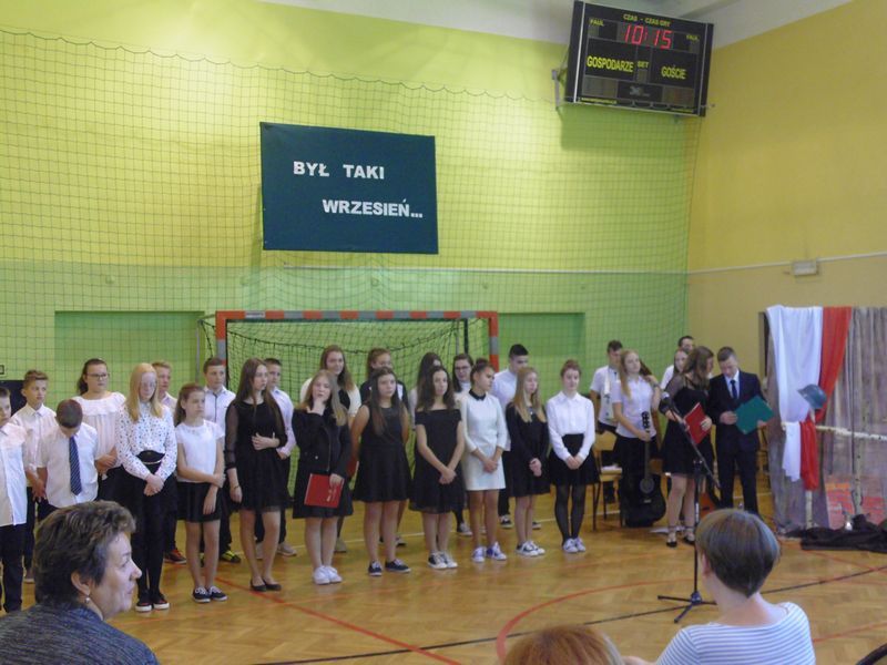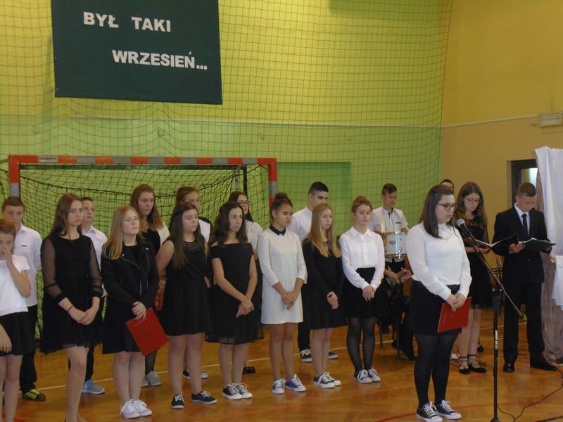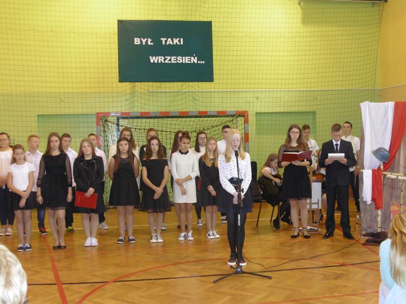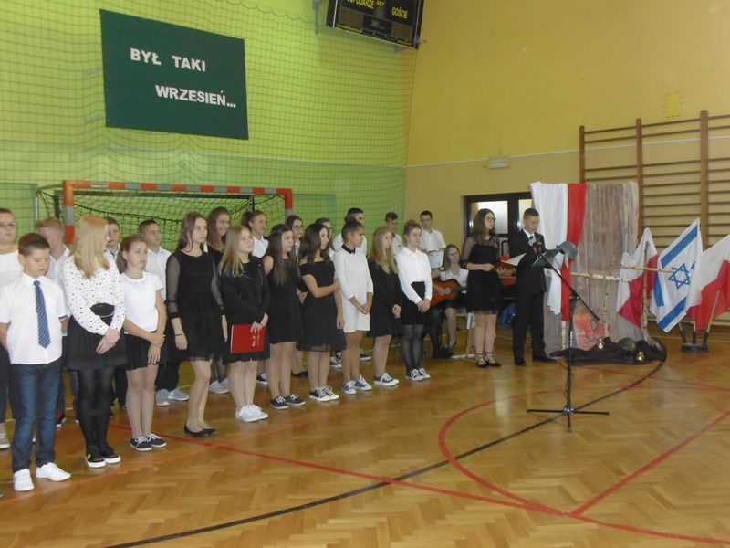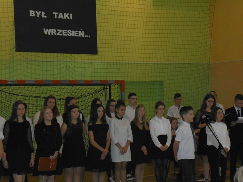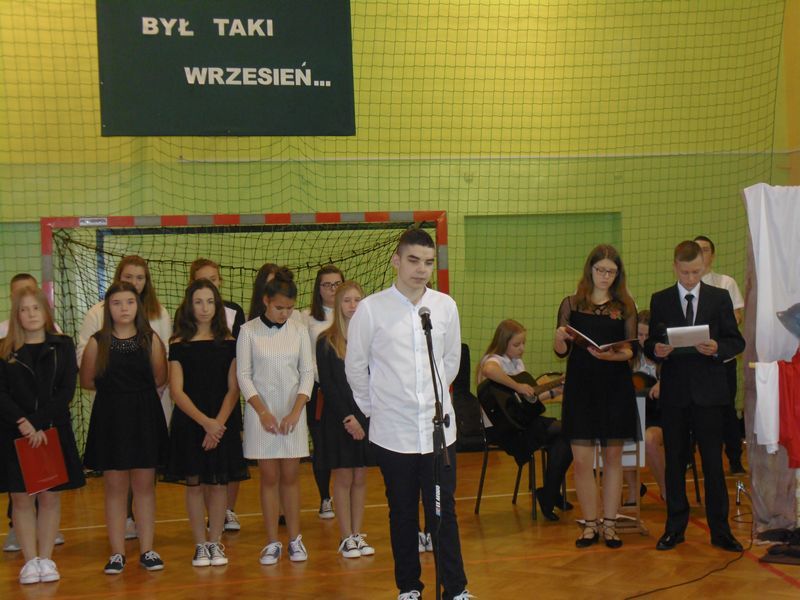 28 września uczciliśmy pamięć ofiar II wojny światowej. Uczniowie kl. III gimnazjum i kl.VI zaprezentowali okolicznościowy montaż słowno-muzyczny „Był taki wrzesień”. Wiersze oraz piosenki żołnierskie przywołały dramat tamtych wydarzeń: śmierć, cierpienie, rozpacz niewinnych ofiar niemieckiej i sowieckiej agresji na naszą ojczyznę. Podczas apelu poległych oddaliśmy hołd żołnierzom oraz cywilom. Nie zapomnieliśmy także o zamordowanej przez Niemców żydowskiej rodzinie Goldbergerów ukrywającej się w uszewskim lesie Grabaliny oraz o mieszkańcu Uszwi Wojciechu Kotwisie, który za bezinteresowną pomoc sąsiadom-Żydom został rozstrzelany.