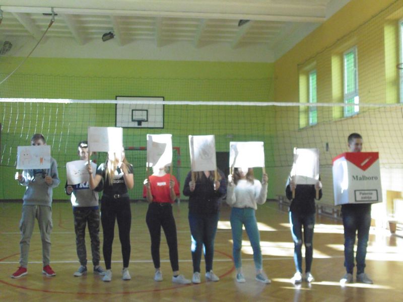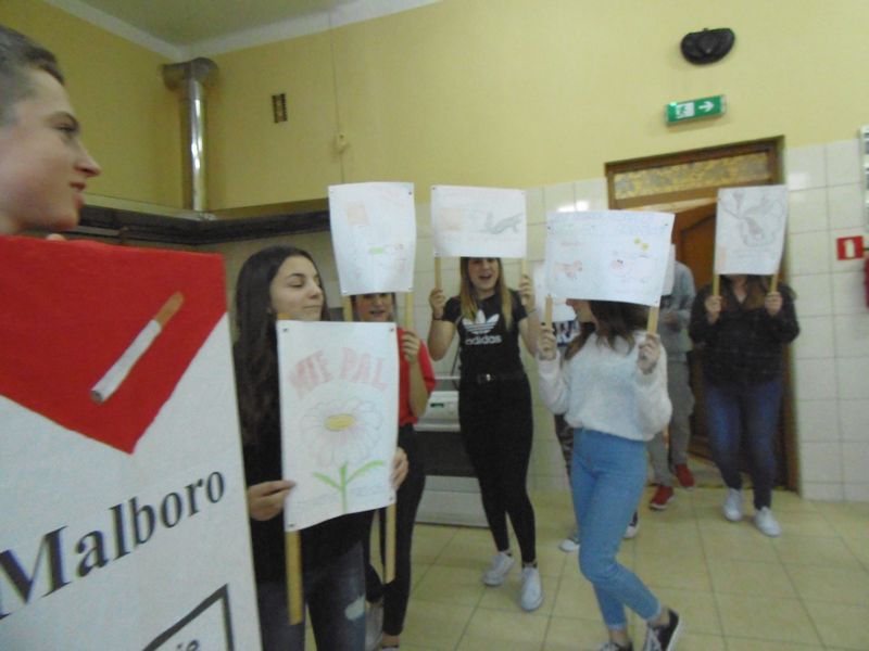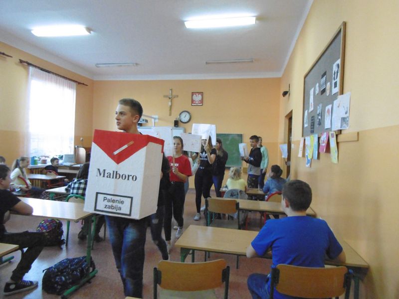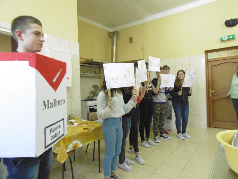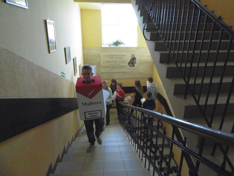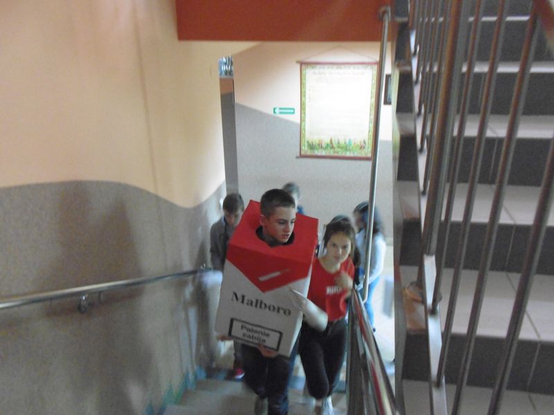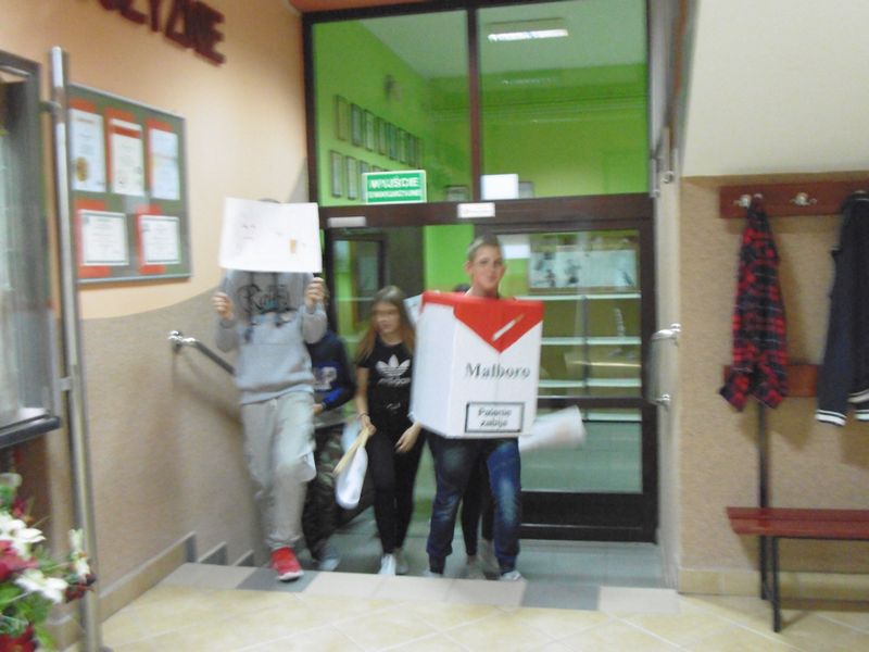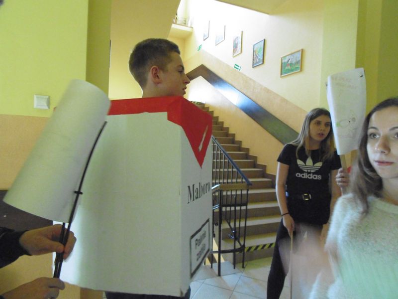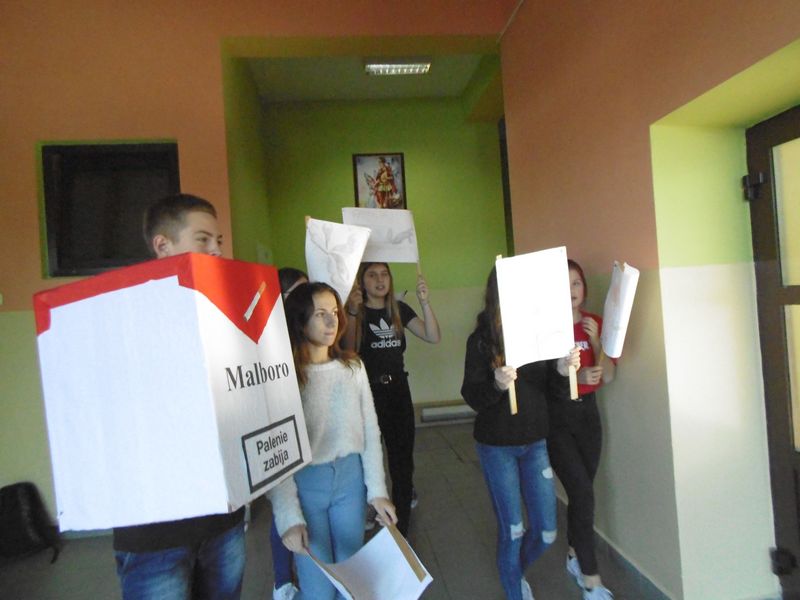 W ramach programu profilaktycznego w naszej szkole zaplanowaliśmy cykl happeningów poświęconych profilaktyce uzależnień. Uczniowie klasy IIb przygotowali akcję dotyczącą palenia, w trakcie której przedstawiali hasła nakłaniające do niepalenia. Prezentowali okolicznościowe plakaty namalowane przez Anię Rzońcę oraz pudełko przedstawiające opakowanie po papierosach z hasłem „Palenie zabija” wykonane przez Asię Chmielarz. Młodzież skandowała hasła w korowodzie, który odwiedził uczniów klas V-VII oraz II-III gimnazjum.