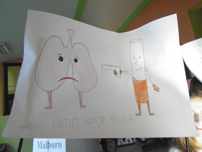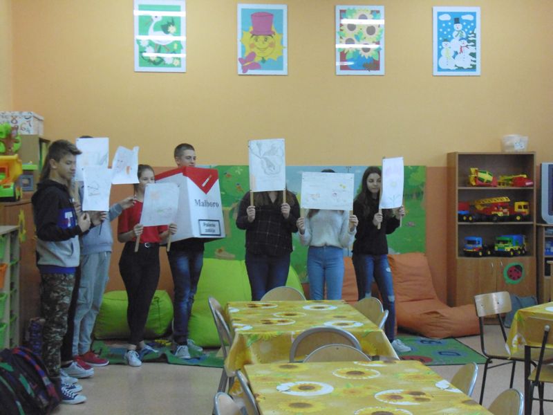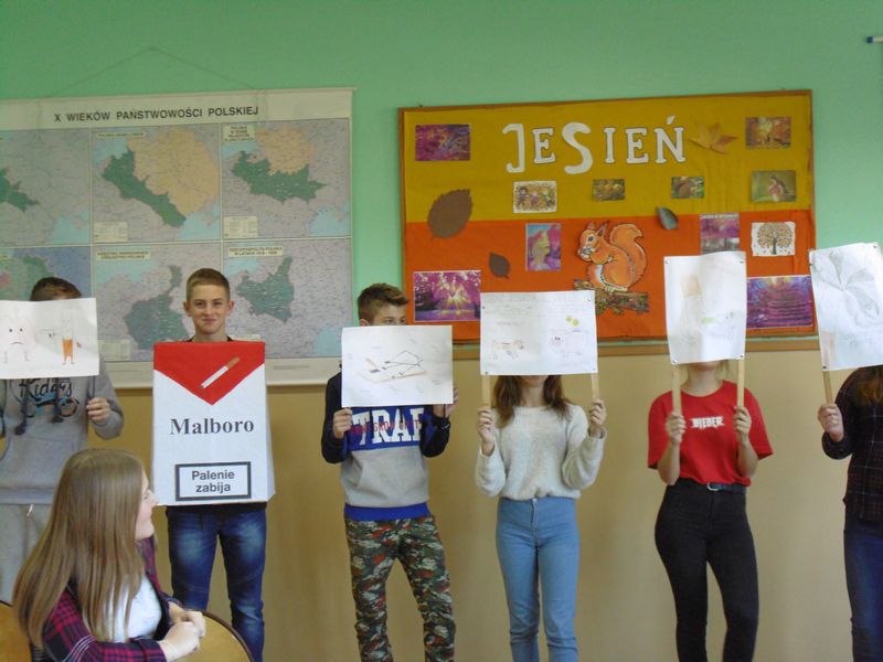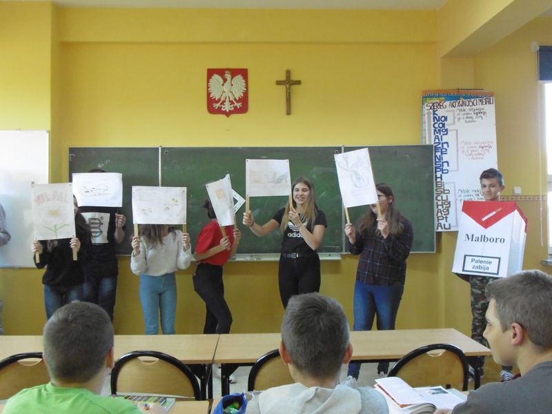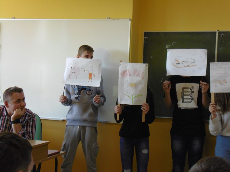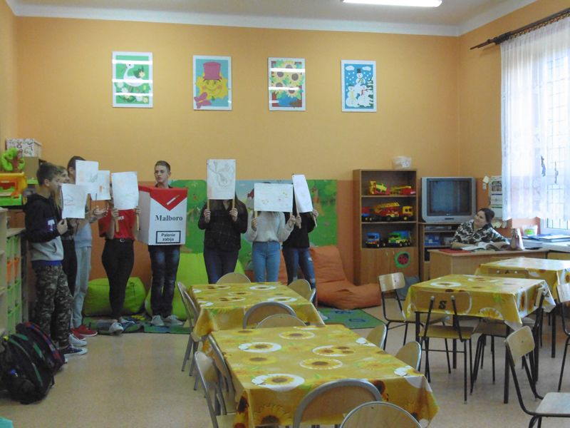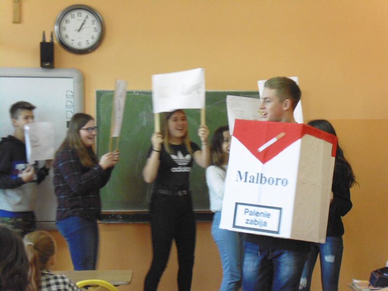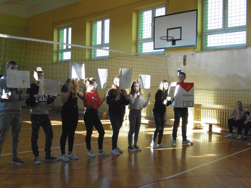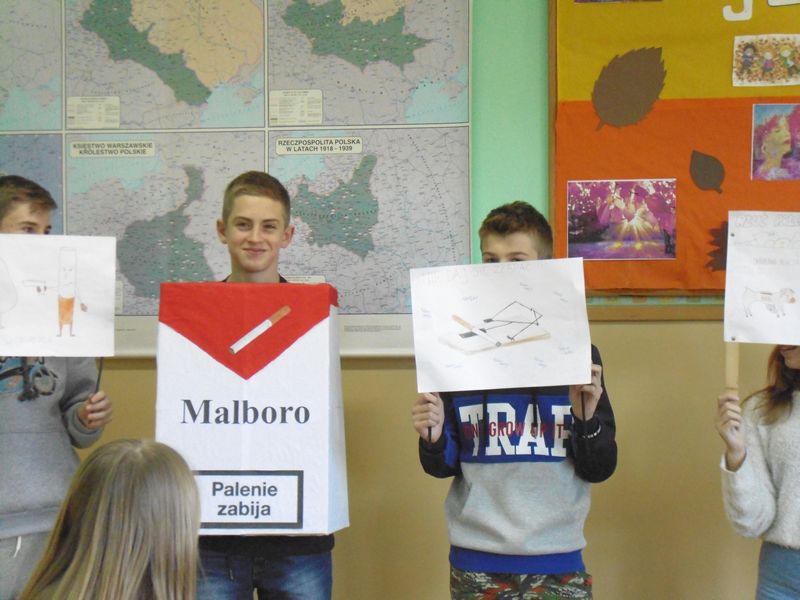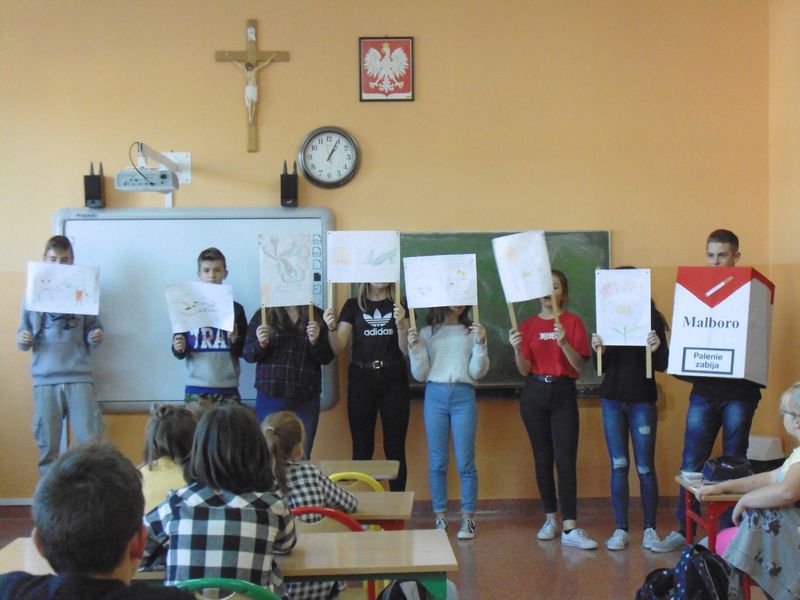 W ramach programu profilaktycznego w naszej szkole zaplanowaliśmy cykl happeningów poświęconych profilaktyce uzależnień. Uczniowie klasy IIb przygotowali akcję dotyczącą palenia, w trakcie której przedstawiali hasła nakłaniające do niepalenia. Prezentowali okolicznościowe plakaty namalowane przez Anię Rzońcę oraz pudełko przedstawiające opakowanie po papierosach z hasłem „Palenie zabija” wykonane przez Asię Chmielarz. Młodzież skandowała hasła w korowodzie, który odwiedził uczniów klas V-VII oraz II-III gimnazjum.