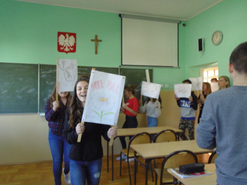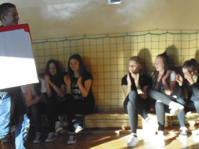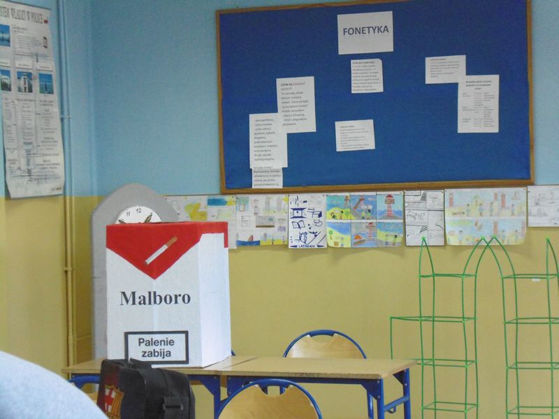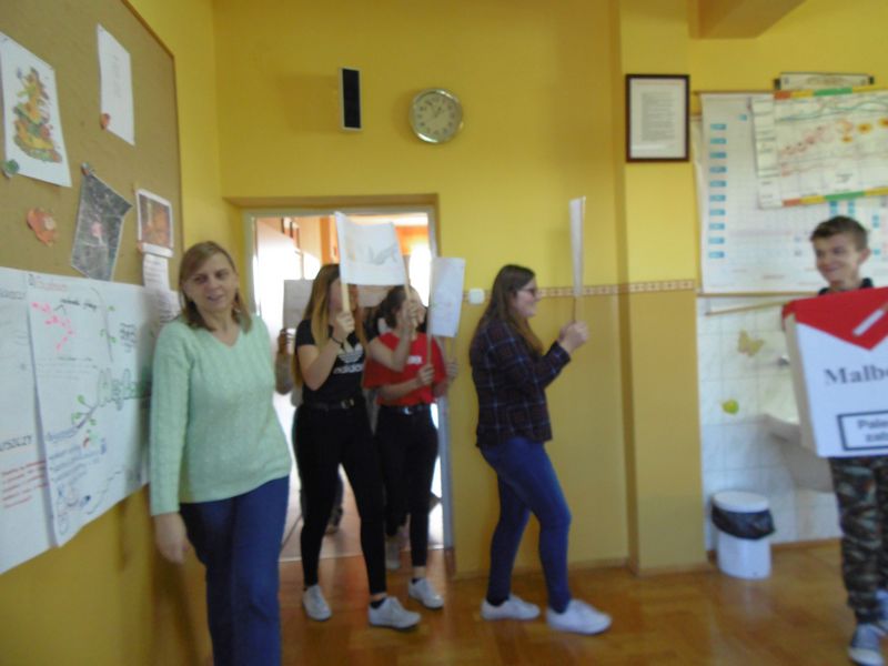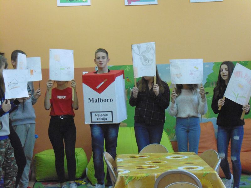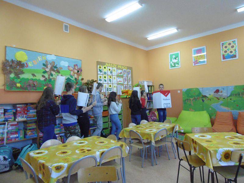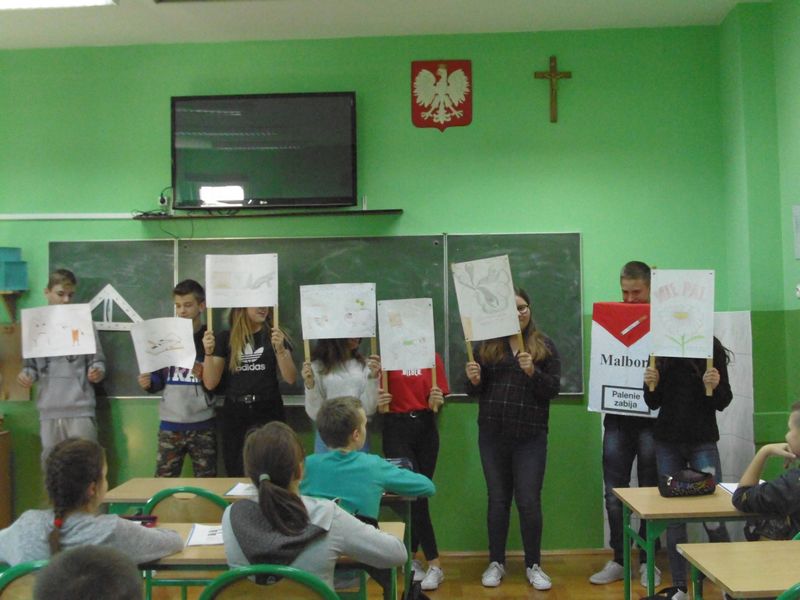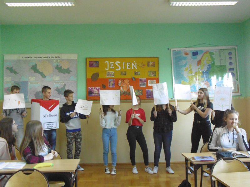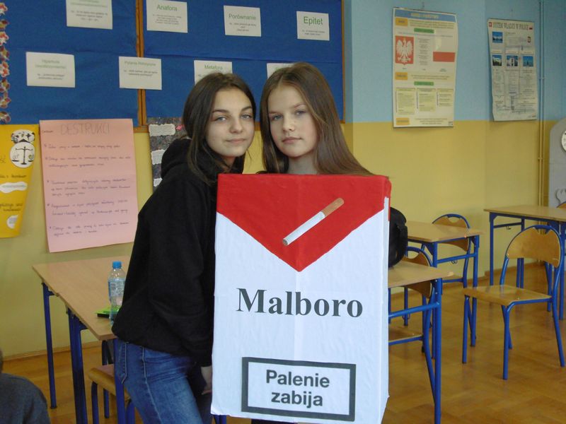 W ramach programu profilaktycznego w naszej szkole zaplanowaliśmy cykl happeningów poświęconych profilaktyce uzależnień. Uczniowie klasy IIb przygotowali akcję dotyczącą palenia, w trakcie której przedstawiali hasła nakłaniające do niepalenia. Prezentowali okolicznościowe plakaty namalowane przez Anię Rzońcę oraz pudełko przedstawiające opakowanie po papierosach z hasłem „Palenie zabija” wykonane przez Asię Chmielarz. Młodzież skandowała hasła w korowodzie, który odwiedził uczniów klas V-VII oraz II-III gimnazjum.