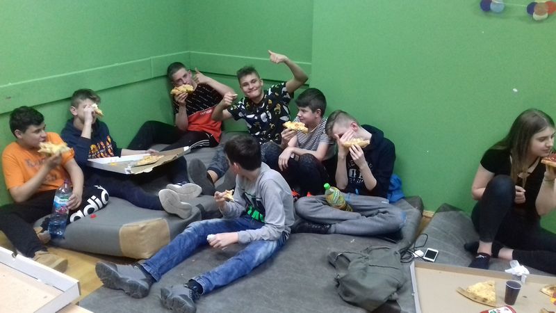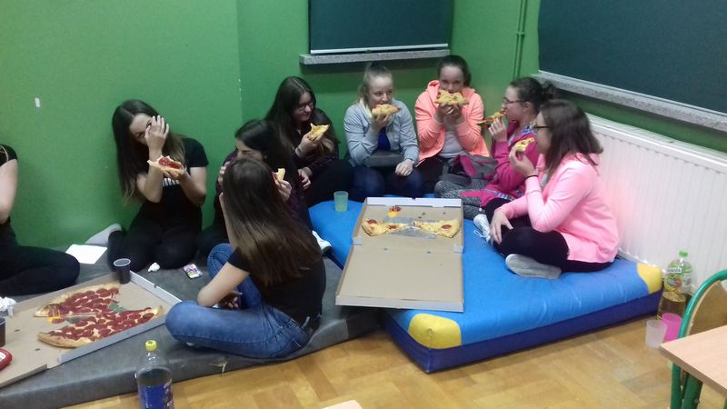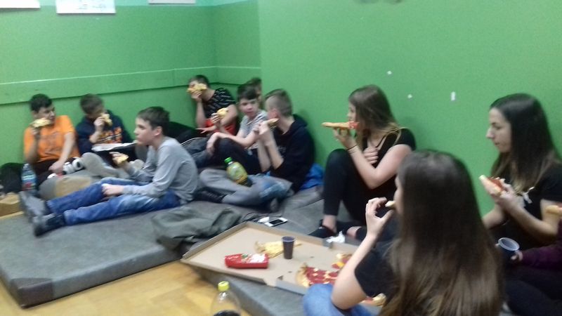 W środowy wieczór uczniowie klasy IIb spotkali się, aby wspólnie obejrzeć filmy. W przerwie zjedli smaczną pizzę. Rozmawiali o problemach klasy. Uczniowie wspominali też swój pobyt w przedszkolu oraz wycieczki szkolne. Swobodna atmosfera sprzyjała integracji zespołu klasowego.