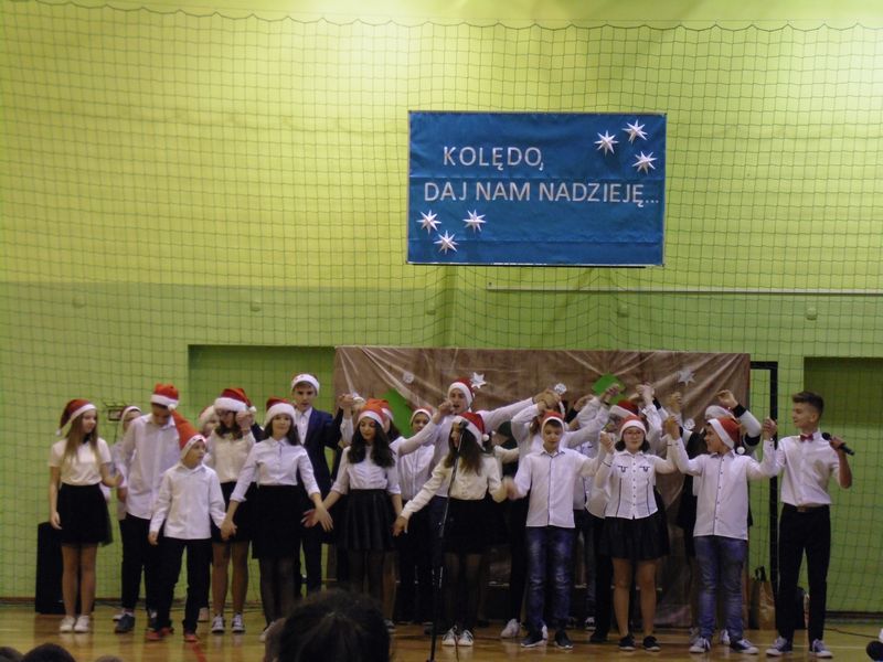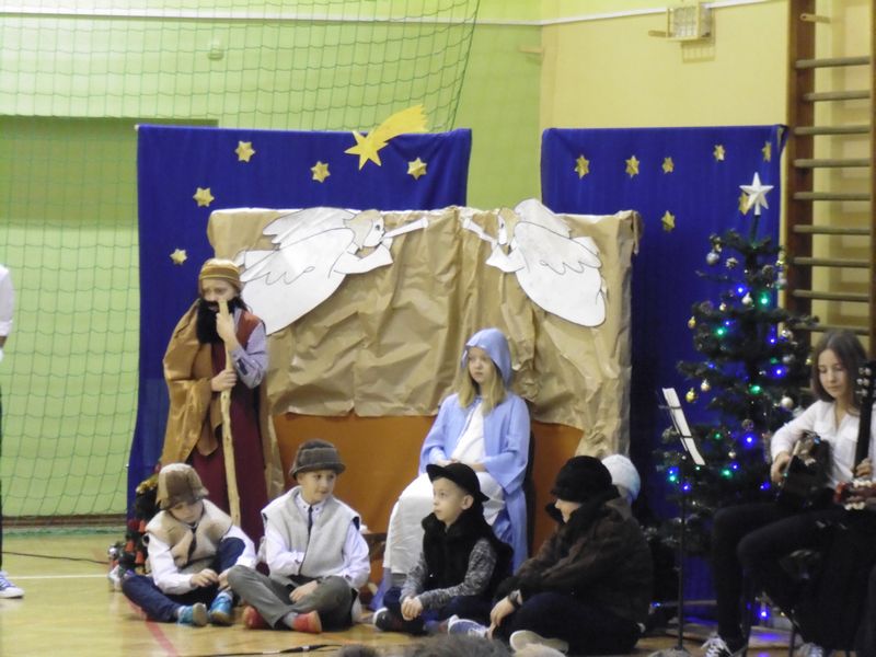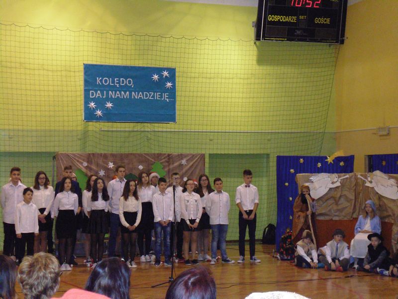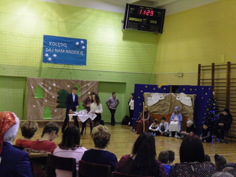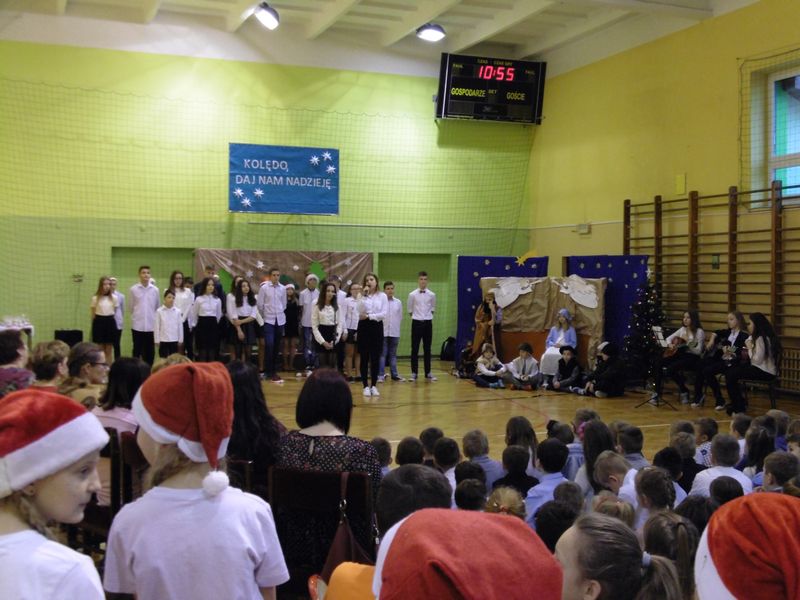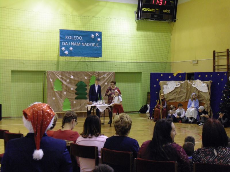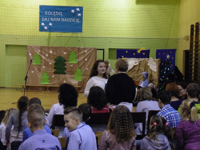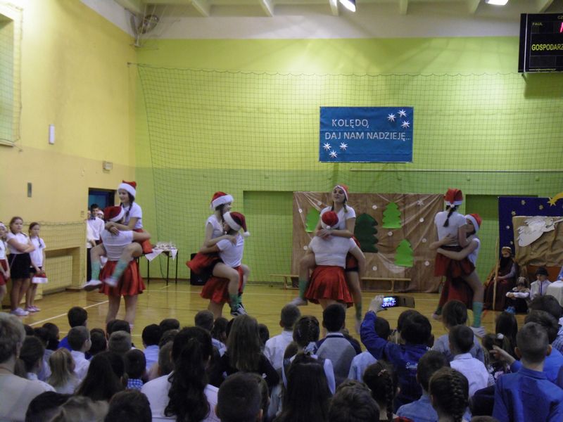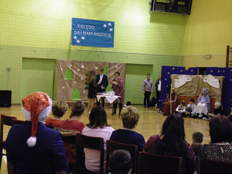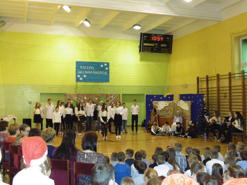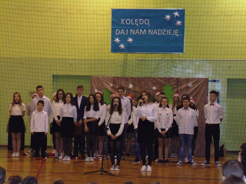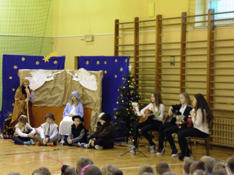 Najpierw uczniowie klasy 2b gimnazjalnej, 7a oraz 4a zaprezentowali program słowno-muzyczny, w którym przedstawili polskie zwyczaje związane z Bożym Narodzeniem. Śpiewali też tradycyjne kolędy i pastorałki. Na gitarach grały uczennice: Karolina Szuba, Gabriela Osada i Sabrina Kowalczyk