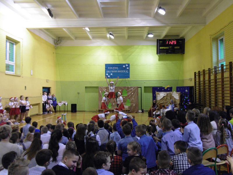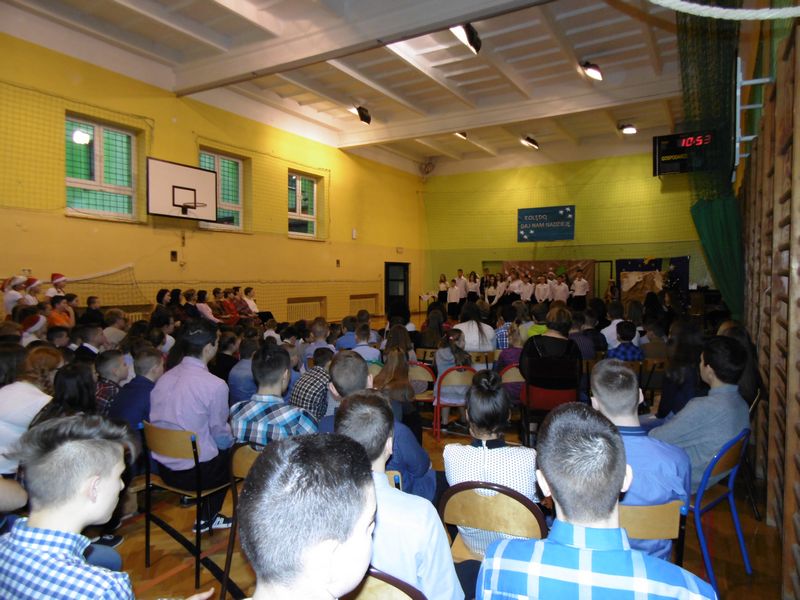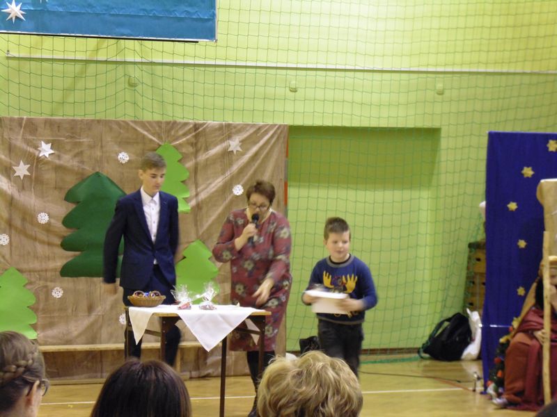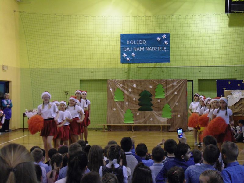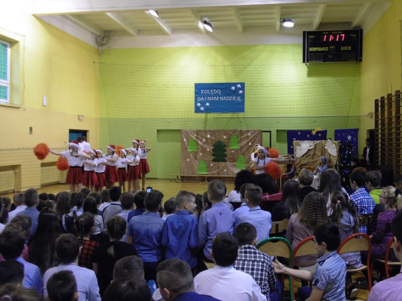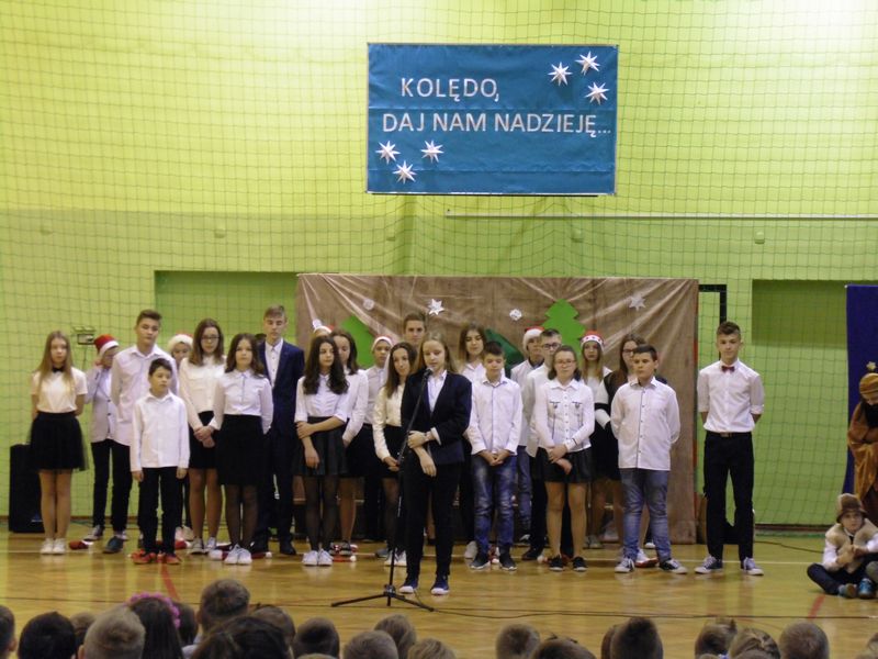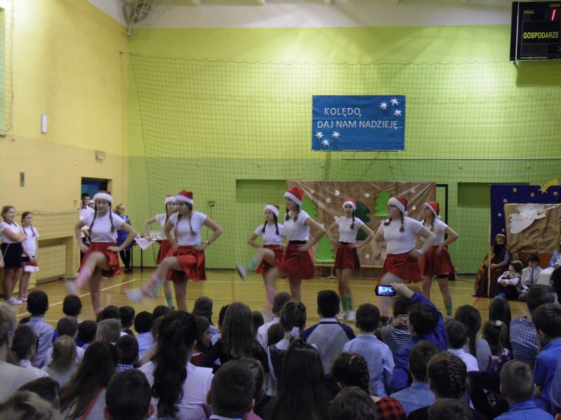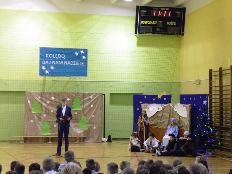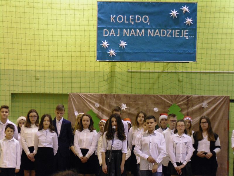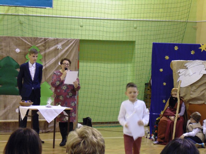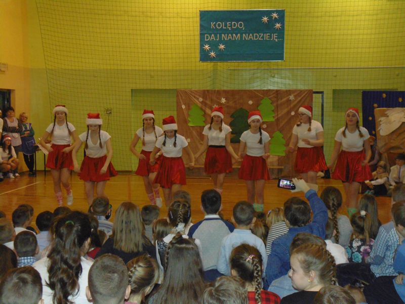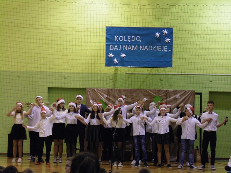 Najpierw uczniowie klasy 2b gimnazjalnej, 7a oraz 4a zaprezentowali program słowno-muzyczny, w którym przedstawili polskie zwyczaje związane z Bożym Narodzeniem. Śpiewali też tradycyjne kolędy i pastorałki. Na gitarach grały uczennice: Karolina Szuba, Gabriela Osada i Sabrina Kowalczyk